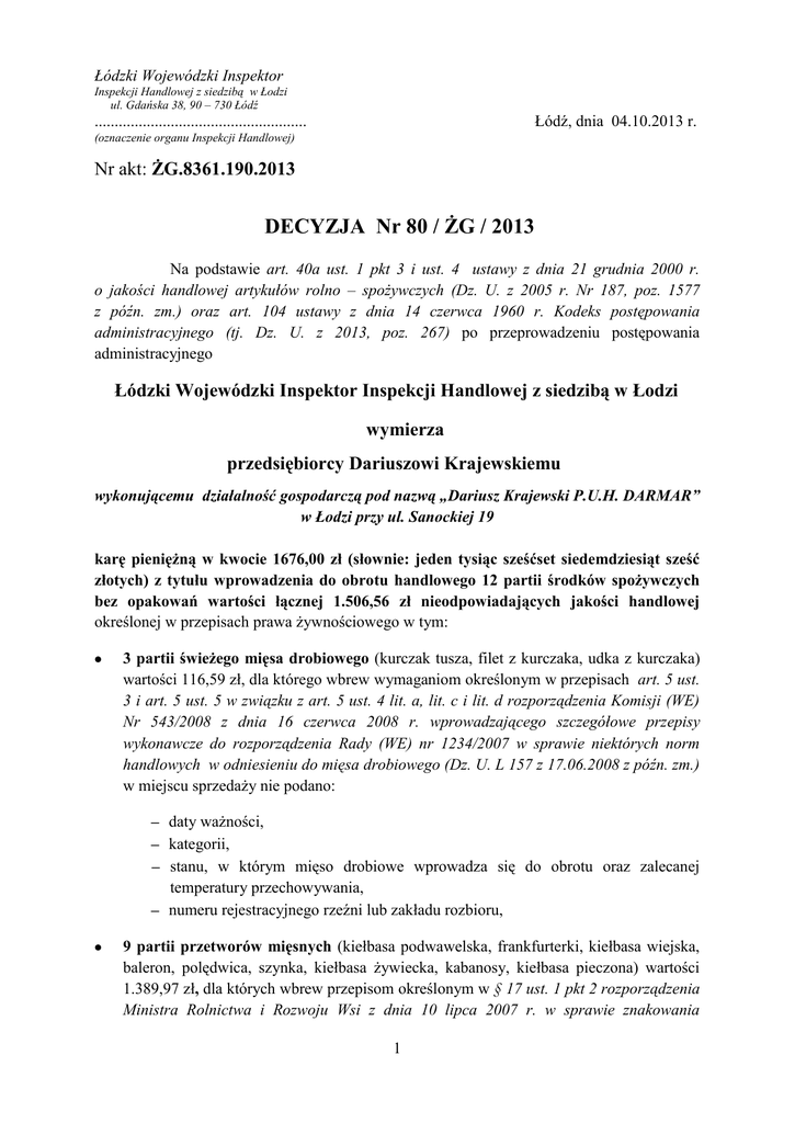 Łódzki Wojewódzki Inspektor Inspekcji Handlowej z siedzibą w Łodzi ul. Gdańska 38, 90 – 730 Łódź Łódź, dnia 04.10.2013 r. ..................................................... (oznaczenie organu Inspekcji Handlowej) Nr akt: ŻG.8361.190.2013 DECYZJA Nr 80 / ŻG / 2013 Na podstawie art. 40a ust. 1 pkt 3 i ust. 4 ustawy z dnia 21 grudnia 2000 r. o jakości handlowej artykułów rolno – spożywczych (Dz. U. z 2005 r. Nr 187, poz. 1577 z późn. zm.) oraz art. 104 ustawy z dnia 14 czerwca 1960 r. Kodeks postępowania administracyjnego (tj. Dz. U. z 2013, poz. 267) po przeprowadzeniu postępowania administracyjnego Łódzki Wojewódzki Inspektor Inspekcji Handlowej z siedzibą w Łodzi wymierza przedsiębiorcy Dariuszowi Krajewskiemu wykonującemu działalność gospodarczą pod nazwą „Dariusz Krajewski P.U.H. DARMAR” w Łodzi przy ul. Sanockiej 19 karę pieniężną w kwocie 1676,00 zł (słownie: jeden tysiąc sześćset siedemdziesiąt sześć złotych) z tytułu wprowadzenia do obrotu handlowego 12 partii środków spożywczych bez opakowań wartości łącznej 1.506,56 zł nieodpowiadających jakości handlowej określonej w przepisach prawa żywnościowego w tym: 3 partii świeżego mięsa drobiowego (kurczak tusza, filet z kurczaka, udka z kurczaka) wartości 116,59 zł, dla którego wbrew wymaganiom określonym w przepisach art. 5 ust. 3 i art. 5 ust. 5 w związku z art. 5 ust. 4 lit. a, lit. c i lit. d rozporządzenia Komisji (WE) Nr 543/2008 z dnia 16 czerwca 2008 r. wprowadzającego szczegółowe przepisy wykonawcze do rozporządzenia Rady (WE) nr 1234/2007 w sprawie niektórych norm handlowych w odniesieniu do mięsa drobiowego (Dz. U. L 157 z 17.06.2008 z późn. zm.) w miejscu sprzedaży nie podano: daty ważności, kategorii, stanu, w którym mięso drobiowe wprowadza się do obrotu oraz zalecanej temperatury przechowywania, numeru rejestracyjnego rzeźni lub zakładu rozbioru, 9 partii przetworów mięsnych (kiełbasa podwawelska, frankfurterki, kiełbasa wiejska, baleron, polędwica, szynka, kiełbasa żywiecka, kabanosy, kiełbasa pieczona) wartości 1.389,97 zł, dla których wbrew przepisom określonym w § 17 ust. 1 pkt 2 rozporządzenia Ministra Rolnictwa i Rozwoju Wsi z dnia 10 lipca 2007 r. w sprawie znakowania 1 środków spożywczych (Dz. U. Nr 137, poz. 966 z późn. zm.) w miejscu sprzedaży, nie podano informacji o wykazie składników przedmiotowych wędlin. Uzasadnienie W dniach od 26 czerwca do 01 lipca 2013 r. na podstawie upoważnienia Łódzkiego Wojewódzkiego Inspektora Inspekcji Handlowej numer ŻG.8361.190.2013 z dnia 26.06.2013r. inspektorzy Wojewódzkiego Inspektoratu Inspekcji Handlowej w Łodzi, przeprowadzili kontrolę w firmowym sklepie mięsno-wędliniarskim zlokalizowanym w Łodzi przy ul. Sanockiej 19, należącym do Dariusza Krajewskiego, wykonującego działalność gospodarczą pod nazwą „Dariusz Krajewski P.U.H. DARMAR”. Kontrolę przeprowadzono na podstawie przepisów art. 3 ust. 1 - 3 rozporządzenia Parlamentu Europejskiego i Rady (WE) Nr 882/2004 z dnia 29 kwietnia 2004 r. w sprawie kontroli urzędowych przeprowadzanych w celu sprawdzenia zgodności z prawem paszowym i żywnościowym oraz regułami dotyczącymi zdrowia zwierząt i dobrostanu zwierząt (Dz. U. L 165 z 30.4.2004 ze zm.), art. 17 ust. 3 ustawy z dnia 21 grudnia 2000 r. o jakości handlowej artykułów rolnospożywczych (Dz. U. z 2005 r. nr 187, poz. 1577, z późn. zm.) w związku z art. 3 ust. 1 pkt 1, 2 i 6 ustawy z dnia 15 grudnia 2000 r. o Inspekcji Handlowej (Dz. U. z 2009 r. Nr 151, poz. 1219 z późn. zm.) w obecności właściciela Dariusza Krajewskiego. W trakcie prowadzonych działań kontrolnych stwierdzono, że w obrocie handlowym znajdowało się 12 partii środków spożywczych bez opakowań wartości łącznej 1.506,56 zł w tym: 3 partie świeżego mięsa drobiowego wartości 116,59 zł kurczak tusze w ilości 7,80 kg w cenie 8,90 zł/kg, filet z kurczaka w ilości 2,30 kg w cenie 17,90 zł/kg, udka z kurczaka w ilości 0,55 kg w cenie 10,90 zł/kg, dla których, wbrew obowiązkowi wynikającemu z art. 5 ust. 3 i art. 5 ust. 5 w związku z art. 5 ust. 4 lit. a, c i d rozporządzenia Komisji (WE) Nr 543/2008 z dnia 16 czerwca 2008 r. wprowadzającego szczegółowe przepisy wykonawcze do rozporządzenia Rady (WE) nr 1234/2007 w sprawie niektórych norm handlowych w odniesieniu do mięsa drobiowego (Dz. U. L 157 z 17.06.2008 z późn. zm.), zwanego dalej „rozporządzeniem 543/2008” w miejscu sprzedaży nie podano do wiadomości konsumentów informacji co do daty ważności, kategorii, stanu, w którym mięso drobiowe wprowadza się do obrotu, zalecanej temperatury przechowywania oraz numeru rejestracyjnego rzeźni lub zakładu rozbioru; 9 partii przetworów mięsnych bez opakowań, wyprodukowanych przez P.U.H. „DARMAR” Dariusz Krajewski, Prażki 5, 97-319 Będków wartości łącznej 1.389,97 zł tj.: kiełbasę podwawelską w ilości 11,10 kg w cenie 17,50 zł za 1 kilogram, franfurkterki w ilości 0,57 kg w cenie 17,80 zł za 1 kilogram, kiełbasę wiejską w ilości 9,70 kg w cenie 17,50 zł za 1 kilogram, 2 baleron w ilości 1,34 kg w cenie 23,90 zł za 1 kilogram, polędwicę w ilości 14,42 kg w cenie 28,00 zł za 1 kilogram, szynkę w ilości 10,64 kg w cenie 26,00 zł za 1 kilogram, kiełbasę żywiecką w ilości 1,18 kg w cenie 22,90 zł za 1 kilogram, kabanosy w ilości 2,42 kg w cenie 28,00 zł za 1 kilogram, kiełbasę pieczoną w ilości 9,07 kg w cenie 23,00 zł za 1 kilogram, dla których, wbrew obowiązkowi wynikającemu z § 17 ust. 1 pkt 2 rozporządzenia Ministra Rolnictwa i Rozwoju Wsi z dnia 10 lipca 2007 r. w sprawie znakowania środków spożywczych (Dz. U. Nr 137, poz. 966 z późn. zm.) zwanego dalej „rozporządzeniem w sprawie znakowania środków spożywczych”, w miejscu sprzedaży nie podano wykazu składników. Należy tu nadmienić, iż przedsiębiorca nie posiadał w kontrolowanej placówce 