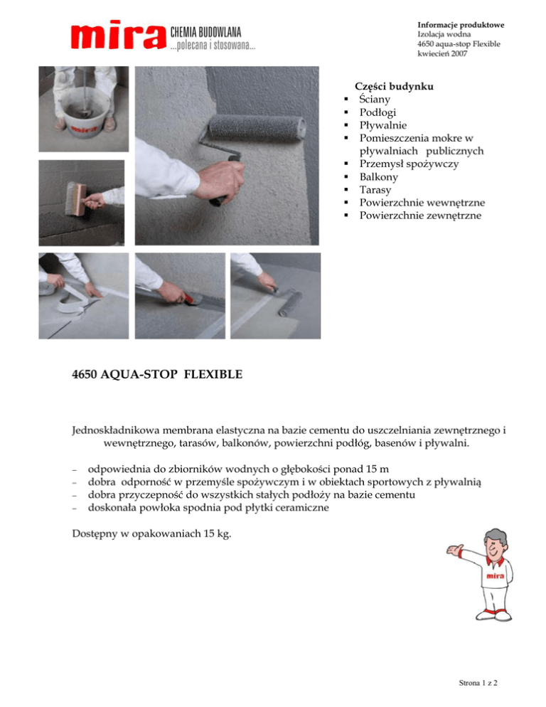 Informacje produktowe Izolacja wodna 4650 aqua-stop Flexible kwiecień 2007 Części budynku Ściany Podłogi Pływalnie Pomieszczenia mokre w pływalniach publicznych Przemysł spożywczy Balkony Tarasy Powierzchnie wewnętrzne Powierzchnie zewnętrzne 4650 AQUA-STOP FLEXIBLE Jednoskładnikowa membrana elastyczna na bazie cementu do uszczelniania zewnętrznego i wewnętrznego, tarasów, balkonów, powierzchni podłóg, basenów i pływalni. odpowiednia do zbiorników wodnych o głębokości ponad 15 m dobra odporność w przemyśle spożywczym i w obiektach sportowych z pływalnią dobra przyczepność do wszystkich stałych podłoży na bazie cementu doskonała powłoka spodnia pod płytki ceramiczne Dostępny w opakowaniach 15 kg. Strona 1 z 2 Informacje produktowe Izolacja wodna 4650 aqua-stop Flexible kwiecień 2007 Opis produktu Jednoskładnikowa membrana elastyczna na bazie cementu do uszczelniania powłok mineralnych. Przygotowanie Miejsca gdzie występuje ryzyko pracy warstwy spodniej należy zabezpieczyć taśmą mira sealband (np. łączenia elementów konstrukcyjnych, łączenia podłoga - ściana i Dane techniczne ściana – ściana oraz miejsca pęknięć). W Gęstość 1,5 pęknięciach i rysach o minimalnym ryzyku pracy Odporność na zniekształcenia (mniejszym niż 0,75 mm) ruch ten można wliczyć norma EN 14891 CMP: min. 0,75 mm w tolerancję odkształcenia warstwy membrany. Kurczenie: Części budynku z betonu zbrojonego pracujące Czas użycia po wymieszaniu: 1 godz. razem, jak baseny pływackie, nie wymagają Czas schnięcia w temp. 18°C zabezpieczania taśmą uszczelniającą. Do dalszej obróbki 24-48 godz. Gotowość do obciążeń 7 dni Wykonanie o Temperatura stosowania: +6 do +20 C Opakowanie 15kg produktu mira 4650 aqua-stop Zalecana temp. Montażu: +16 do +20°C należy zmieszać z 3,3-3,5 L wody. Należy użyć (proszek i woda) mieszadła spiralnego i mieszać masę przez min. Wydajność 2 minuty aż do momentu osiągnięcia jednolitej Dla 2 warstw 2,2 – 2,5 kg/m² konsystencji (bez grudek). Wymieszaną masę Dla 3 warstw min. 3 kg/m² należy pozostawić na 5 min. i ponownie wymieszać. Masę nakłada się wałkiem o krótkim Przeznaczenie włosiu, szczotką lub za pomocą końcówki Jako membrana wodoodporna przed montażem natryskowej. W przypadku natrysku zaleca się płytek ceramicznych, gipsu fasadowego, jako dodatkowe wykończenie szczotką. Należy warstwa wierzchnia ochronna w nałożyć co najmniej 2 warstwy masy o wadze pomieszczeniach o niewielkim natężeniu ruchu. 1-1,25 kg na każdą warstwę . Każda warstwa Zastosowanie w pływalniach publicznych, powinna wyschnąć przed położeniem następnej prysznicach, na powierzchniach podłóg, w (ok. 2-3 godziny). W przypadku dużego basenach rekreacyjnych, na tarasach, balkonach, obciążenia wodą oraz dla basenów pływackich w kuchniach przemysłowych i in. Do stosowania należy zastosować 3 warstwy produktu. również jako warstwa wierzchnia ochronna na konstrukcjach betonowych, fasadach, kominach i Warunki higieniczne fundamentach. MAL kode 00-4 (1993) Produkt zawiera cement. Należy przestrzegać Warstwa spodnia zasad higieny pracy dot. produktów Beton, gips lub inne na bazie mineralnej. cementowych. Produkt aqua-stop stworzony został na bazie Przygotowanie warstwy spodniej białego cementu o niskiej zawartości wapna. Warstwa spodnia winna być zwięzła i gładka. Dzięki temu utrzymuje w pełnym okresie Ewentualne ubytki, pęknięcia należy naprawić żywotności wartości graniczne zawartości uszczelniając je wodoodpornym chromu. cementem/szpachlą. Warstwa winna być Więcej informacji znajduje się w dokumentacji niepyląca, odtłuszczona, oczyszczona z farby, bezpieczeństwa. kleju i nieczystości. Przed nałożeniem produktu 4650 aqua-stop podłoża chłonne i należy zwilżyć Opakowanie wodą. 15 kg opakowania papierowe wzmocnione warstwą folii, z uchwytem. Składowanie i transport Należy przechowywać i przewozić w warunkach suchych. Produkt może być składowany długoterminowo, w okresie co najmniej 1 roku od daty produkcji, w opakowaniu zamkniętym. Strona 2 z 2