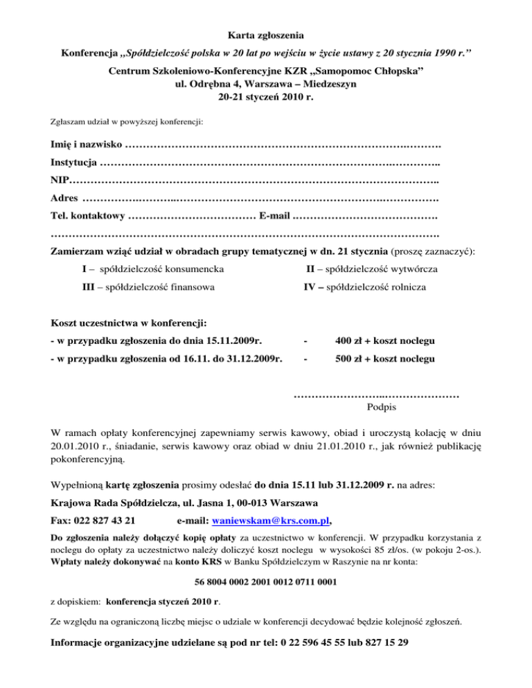 Karta zgłoszenia Konferencja „Spółdzielczość polska w 20 lat po