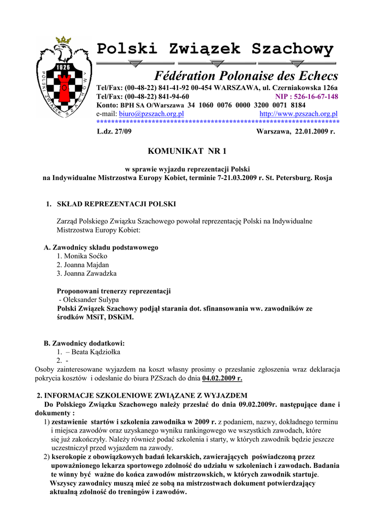 Polski Związek Szachowy Fédération Polonaise des Echecs Tel/Fax: (00-48-22) 841-41-92 00-454 WARSZAWA, ul. Czerniakowska 126a Tel/Fax: (00-48-22) 841-94-60 NIP : 526-16-67-148 Konto: BPH SA O/Warszawa 34 1060 0076 0000 3200 0071 8184 e-mail: [email protected] http://www.pzszach.org.pl ****************************************************************** L.dz. 27/09 Warszawa, 22.01.2009 r. KOMUNIKAT NR 1 w sprawie wyjazdu reprezentacji Polski na Indywidualne Mistrzostwa Europy Kobiet, terminie 7-21.03.2009 r. St. Petersburg. Rosja 1. SKŁAD REPREZENTACJI POLSKI Zarząd Polskiego Związku Szachowego powołał reprezentację Polski na Indywidualne Mistrzostwa Europy Kobiet: A. Zawodnicy składu podstawowego 1. Monika Soćko 2. Joanna Majdan 3. Joanna Zawadzka Proponowani trenerzy reprezentacji - Oleksander Sulypa Polski Związek Szachowy podjął starania dot. sfinansowania ww. zawodników ze środków MSiT, DSKiM. B. Zawodnicy dodatkowi: 1. – Beata Kądziołka 2. Osoby zainteresowane wyjazdem na koszt własny prosimy o przesłanie zgłoszenia wraz deklaracja pokrycia kosztów i odesłanie do biura PZSzach do dnia 04.02.2009 r. 2. INFORMACJE SZKOLENIOWE ZWIĄZANE Z WYJAZDEM Do Polskiego Związku Szachowego naleŜy przesłać do dnia 09.02.2009r. następujące dane i dokumenty : 1) zestawienie startów i szkolenia zawodnika w 2009 r. z podaniem, nazwy, dokładnego terminu i miejsca zawodów oraz uzyskanego wyniku rankingowego we wszystkich zawodach, które się juŜ zakończyły. NaleŜy równieŜ podać szkolenia i starty, w których zawodnik będzie jeszcze uczestniczył przed wyjazdem na zawody. 2) kserokopie z obowiązkowych badań lekarskich, zawierających poświadczoną przez upowaŜnionego lekarza sportowego zdolność do udziału w szkoleniach i zawodach. Badania te winny być waŜne do końca zawodów mistrzowskich, w których zawodnik startuje. Wszyscy zawodnicy muszą mieć ze sobą na mistrzostwach dokument potwierdzający aktualną zdolność do treningów i zawodów. 3) jedno zdjęcie legitymacyjne (preferujemy przesłanie zdjęcia mailem). 3. KOSZTY ZAWODNIKÓW DODATKOWYCH 3a. Zawodnik dodatkowy: 1. Przelot : 1449,00 zł 1 LO 683 V 07MAR 6 WAWLED 2 LO 684 V 21MAR 6 LEDWAW 1045 1445 1530 1535 2. Zakwaterowanie i wyŜywienie w pok. 2os. full board( od 7-21.03 2009 r.) klasa A - 65 EUR / klasa B - 55 EUR x 14 dni x 4,5 = 3.465,00 zł x 4,5 = 293,00 zł 3. Startowe (GM/IM) 65 EUR /(inni)130 EUR 4. Ubezpieczenie = 50,00 zł 5. Opłata na rzecz PZSzach za obsługę zadania = 100,00 zł 6. Transport 70 EUR x 4,5 = 315,00 zł __________________________________________________________________________________ Razem = 5.672,00 zł 3b. Osoby towarzyszące: 1. Przelot jw. ok. 2. Zakwaterowanie i wyŜywienie z pok. 2 os. 55 EUR x 14 dni x 4,5 = 1.449,00 zł 3.465,00 zł 3. Ubezpieczenie = 50,00 zł 4. Opłata na rzecz PZSzach obsługę zadania = 100,00 zł 5. Transport 70 EUR x 4,5 = 315,00 zł __________________________________________________________________________________ Razem = 5.379,00 zł Podane kwoty mogą ulec zmianie ze względu na kurs Euro. Wszystkie zawodniczki dodatkowe oraz osoby towarzyszące, jadące na koszt własny są zobowiązane są do wpłaty bezzwrotnej zaliczki w wys. 600zł w nieprzekraczalnym terminie do 04.02.2009 r. Bardzo prosimy o przesłanie na adres biura pisemnego potwierdzenia udziału w IME, które musi zawierać następujące informacje: - Imię i Nazwisko zawodnika jego nr PESEL, Seria i nr Paszportu oraz datę waŜności. - Imię i Nazwisko osób towarzyszących, nr PESEL, Seria i nr Paszportu oraz datę waŜności. - pisemne zobowiązanie do pokrycia pełnych kosztów udziału w IME. (pełne koszty wyjazdu na IME naleŜy pokryć do dnia 10 lutego 2009 r.). 4. WIZY Wydział Konsularny Ambasady Rosji w Polsce Adres: 00-761 Warszawa, ul. Belwederska 25C Tel: (8-10-48-22) 849-51-11 Fax: (8-10-48-22) 849-40-85 Poczta elektroniczna: [email protected]; [email protected] Godziny przyjęć interesantów: poniedziałek, wtorek, czwartek, piątek 08.00-12.00. Warszawski okręg konsularny obejmuje następujące województwa Polski: Łódzkie Lubelskie Mazowieckie Podlaskie Konsulat Generalny Rosji w Gdańsku Adres: 80251 Gdańsk-Wrzeszcz, ul. Batorego 15 Tel: (8-10-48-58) 341-10-88 Fax: (8-10-48-58) 341-62-00 Poczta elektroniczna: [email protected] Godziny przyjęć interesantów: poniedziałek, środa, piątek 08.30-12.30. Gdański okręg konsularny obejmuje następujące województwa Polski: Pomorskie Kujawsko-Pomorskie Warmińsko-Mazurskie Zachodnio-Pomorskie Konsulat Generalny Rosji w Krakowie Adres: 31144 Kraków, ul. Biskupia 7 Tel: (8-10-48-12) 422-26-47 Fax: (8-10-48-12) 422-90-66 Poczta elektroniczna: [email protected] Godziny przyjęć interesantów: poniedziałek, środa, piątek 08.00-12.00. Krakowski okręg konsularny obejmuje następujące województwa Polski: Małopolskie Podkarpackie Śląskie Świętokrzyskie Konsulat Generalny Rosji w Poznaniu Adres: 60567 Poznań, ul. Bukowska 53A Tel: (8-10-48-61) 841-75-23 Fax: (8-10-48-61) 847-49-97 Poczta elektroniczna: [email protected] Godziny przyjęć interesantów: poniedziałek, środa, piątek 08.30-12.30. Poznański okręg konsularny obejmuje następujące województwa Polski: Wielkopolskie Lubuskie Opolskie Dolnośląskie 5. POSTANOWIENIA KOŃCOWE W potwierdzeniach i korespondencji do PZSzach. prosimy podać aktualny adres (z kodem), telefon, fax, e-mail do kaŜdego zawodnika. Wszyscy zawodnicy oraz osoby towarzyszące podlegają kierownikowi reprezentacji/trenerowi reprezentacji/ trenerowi reprezentacji. Trenerzy klubowi i osoby towarzyszące winni podporządkować się ustaleniom organizacyjno technicznym kierownika i trenerów reprezentacji Polski. Wszystkich reprezentantów Polski obowiązuje udział w uroczystym otwarciu i zakończeniu mistrzostw. Komunikat ogłoszony zostanie na stronie PZSzach. http://www.pzszach.org.pl Agnieszka Jowik-Giszka Dyrektor Biura Łukasz Skrzypczak Kierownik W