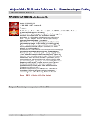 Utworzono : 04Łopacińskieg March 2017 Wojewódzka Biblioteka Publiczna im. Hieronima > NADCHODZI OGIEŃ, Anderson G. NADCHODZI OGIEŃ, Anderson G. Model : 9788308055199 NADCHODZI OGIEŃ, Anderson G. Producent : Nadchodzi ogień, Anderson Gilian, Rovin Jeff, Literackie 2015Literacki debiut Gillian Anderson Przygodowa saga na miarę Z archiwum X Międzynarodowe spiski, egzotyczne miejsca, kryminalno-przygodowe perypetie, zaskakujące zwroty akcji, przełomowe odkrycia, porywający, ale i zaskakująco niebezpieczny świat współczesnej nauki – wszystko to będzie stanowiło wybuchową mieszankę w wykonaniu gwiazdy kultowego Z Archiwum X. Gillian Anderson, od dawna myślała o pisaniu, lecz dopiero teraz zdecydowała się chwycić za pióro. Wpływ na tę decyzję miał Jeff Rovin — autor bestsellerowych powieści, który zachęcił Gillian, by wykorzystała swój potencjał, pomysły i wyobraźnię, i by razem stworzyli porywającą sagę sci-fi. Z zainteresowań autorki tematami paranormalnymi oraz szeroko pojętą duchowością narodziła się fantastyczna seria Saga końca ziemi. Pierwszy tom cyklu — Nadchodzi ogień — opisuje przygody Caitlin O’Hary, światowej sławy psychologa dziecięcego, która zajmuje się leczeniem traum, powstałych w wyniku wojen i klęsk żywiołowych. To silna kobieta i matka, ma mocny charakter i ugruntowaną pozycję zawodową, jednak całe jej doświadczenie i wiedza o świecie stają pod znakiem zapytania, gdy zaczyna pracować z młodą dziewczyną o wyjątkowych zaburzeniach. Próbując jej pomóc, Caitlin zaczyna dostrzegać, że za problemami dziewczyny kryją się o wiele potężniejsze siły niż te, które jest w stanie objąć ludzki umysł… itlinagnozowach zaburzeniach… Aktorka znana z popularnej serii Z Archiwum X zadebiutowała porywającym i świetnie napisanym thrillerem (w kooperacji z weteranem gatunku Jeffem Rovinem). „Publisher’s Weekly” Cena : 30,70 zł Brutto ( 29,24 zł Netto) Dostępność: Produkt dostępny w naszym sklepie od 02 June 2015 kontakt : - [email protected] Strona 1