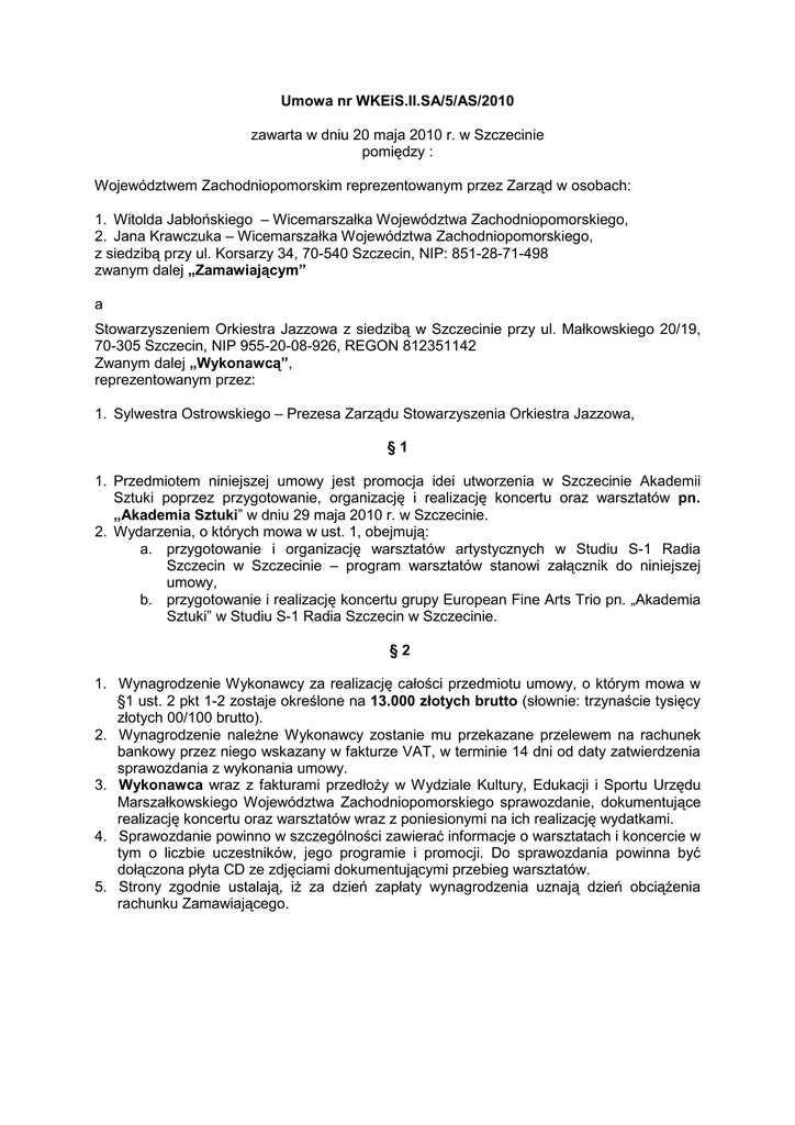 Umowa nr WKEiS.II.SA/5/AS/2010 zawarta w dniu 20 maja 2010 r. w Szczecinie pomiędzy : Województwem Zachodniopomorskim reprezentowanym przez Zarząd w osobach: 1. Witolda Jabłońskiego – Wicemarszałka Województwa Zachodniopomorskiego, 2. Jana Krawczuka – Wicemarszałka Województwa Zachodniopomorskiego, z siedzibą przy ul. Korsarzy 34, 70-540 Szczecin, NIP: 851-28-71-498 zwanym dalej „Zamawiającym” a Stowarzyszeniem Orkiestra Jazzowa z siedzibą w Szczecinie przy ul. Małkowskiego 20/19, 70-305 Szczecin, NIP 955-20-08-926, REGON 812351142 Zwanym dalej „Wykonawcą”, reprezentowanym przez: 1. Sylwestra Ostrowskiego – Prezesa Zarządu Stowarzyszenia Orkiestra Jazzowa, §1 1. Przedmiotem niniejszej umowy jest promocja idei utworzenia w Szczecinie Akademii Sztuki poprzez przygotowanie, organizację i realizację koncertu oraz warsztatów pn. „Akademia Sztuki” w dniu 29 maja 2010 r. w Szczecinie. 2. Wydarzenia, o których mowa w ust. 1, obejmują: a. przygotowanie i organizację warsztatów artystycznych w Studiu S-1 Radia Szczecin w Szczecinie – program warsztatów stanowi załącznik do niniejszej umowy, b. przygotowanie i realizację koncertu grupy European Fine Arts Trio pn. „Akademia Sztuki” w Studiu S-1 Radia Szczecin w Szczecinie. §2 1. Wynagrodzenie Wykonawcy za realizację całości przedmiotu umowy, o którym mowa w §1 ust. 2 pkt 1-2 zostaje określone na 13.000 złotych brutto (słownie: trzynaście tysięcy złotych 00/100 brutto). 2. Wynagrodzenie naleŜne Wykonawcy zostanie mu przekazane przelewem na rachunek bankowy przez niego wskazany w fakturze VAT, w terminie 14 dni od daty zatwierdzenia sprawozdania z wykonania umowy. 3. Wykonawca wraz z fakturami przedłoŜy w Wydziale Kultury, Edukacji i Sportu Urzędu Marszałkowskiego Województwa Zachodniopomorskiego sprawozdanie, dokumentujące realizację koncertu oraz warsztatów wraz z poniesionymi na ich realizację wydatkami. 4. Sprawozdanie powinno w szczególności zawierać informacje o warsztatach i koncercie w tym o liczbie uczestników, jego programie i promocji. Do sprawozdania powinna być dołączona płyta CD ze zdjęciami dokumentującymi przebieg warsztatów. 5. Strony zgodnie ustalają, iŜ za dzień zapłaty wynagrodzenia uznają dzień obciąŜenia rachunku Zamawiającego. §3 1. Za niewykonywanie lub nienaleŜyte wykonywanie przedmiotu umowy Wykonawca ponosi odpowiedzialność w formie kary umownej. Zamawiający ma prawo naliczyć Wykonawcy karę umowną: 1) za nienaleŜyte wykonanie przedmiotu umowy w wysokości 5 % wartości wynagrodzenia, o którym mowa w § 2 ust. 1, 2) z tytułu odstąpienia od umowy z przyczyn leŜących po stronie Wykonawcy w wysokości 10% wynagrodzenia, o którym mowa w § 2 ust. 1 2. JeŜeli kara umowna nie pokryje poniesionej przez Zamawiającego szkody, moŜe on dochodzić odszkodowania uzupełniającego na zasadach ogólnych. §4 1. Osobą upowaŜnioną do reprezentowania Zmawiającego w sprawach związanych z realizacją niniejszej umowy jest Dyrektor Wydziału Kultury, Edukacji, i Sportu Urzędu Marszałkowskiego Województwa Zachodniopomorskiego. 2. Osobą upowaŜnioną do reprezentowania Wykonawcy w sprawach związanych z realizacją niniejszej umowy jest Prezes Zarządu Stowarzyszenia Orkiestra Jazzowa z siedzibą w Szczecinie. §5 Wszelkie zmiany do niniejszej umowy wymagają dla ich skuteczności formy pisemnej przyjętej przez obie strony umowy. §6 1. W sprawach spornych strony mogą zwrócić się do sądu powszechnego w Szczecinie. 2. W sprawach nie uregulowanych niniejszą umową stosuje się przepisy kodeksu cywilnego. §7 Umowę sporządzono w trzech jednobrzmiących egzemplarzach, z których jeden otrzymuje Wykonawca, dwa Zamawiający. ZAMAWIAJĄCY WYKONAWCA