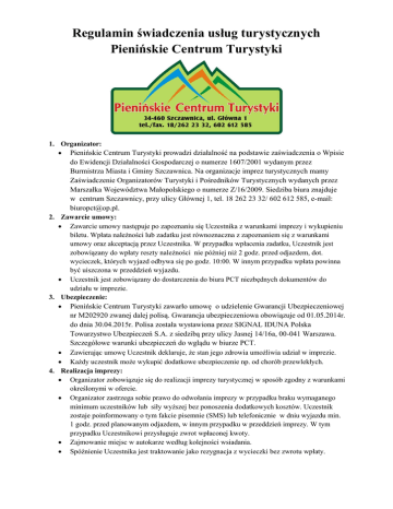 Regulamin świadczenia usług turystycznych Pienińskie Centrum Turystyki 1. Organizator: Pienińskie Centrum Turystyki prowadzi działalność na podstawie zaświadczenia o Wpisie do Ewidencji Działalności Gospodarczej o numerze 1607/2001 wydanym przez Burmistrza Miasta i Gminy Szczawnica. Na organizacje imprez turystycznych mamy Zaświadczenie Organizatorów Turystyki i Pośredników Turystycznych wydanych przez Marszałka Województwa Małopolskiego o numerze Z/16/2009. Siedziba biura znajduje w centrum Szczawnicy, przy ulicy Głównej 1, tel. 18 262 23 32/ 602 612 585, e-mail: [email protected]. 2. Zawarcie umowy: Zawarcie umowy następuje po zapoznaniu się Uczestnika z warunkami imprezy i wykupieniu biletu. Wpłata należności lub zadatku jest równoznaczna z zapoznaniem się z warunkami umowy oraz akceptacją przez Uczestnika. W przypadku wpłacenia zadatku, Uczestnik jest zobowiązany do wpłaty reszty należności nie później niż 2 godz. przed odjazdem, dot. wycieczek, których wyjazd odbywa się po godz. 10:00. W innym przypadku wpłata powinna być uiszczona w przeddzień wyjazdu. Uczestnik jest zobowiązany do dostarczenia do biura PCT niezbędnych dokumentów do udziału w imprezie. 3. Ubezpieczenie: Pienińskie Centrum Turystyki zawarło umowę o udzielenie Gwarancji Ubezpieczeniowej nr M202920 zwanej dalej polisą. Gwarancja ubezpieczeniowa obowiązuje od 01.05.2014r. do dnia 30.04.2015r. Polisa została wystawiona przez SIGNAL IDUNA Polska Towarzystwo Ubezpieczeń S.A. z siedzibą przy ulicy Jasnej 14/16a, 00-041 Warszawa. Szczegółowe warunki ubezpieczeń do wglądu w biurze PCT. Zawierając umowę Uczestnik deklaruje, że stan jego zdrowia umożliwia udział w imprezie. Każdy uczestnik może wykupić dodatkowe ubezpieczenie np. od chorób przewlekłych. 4. Realizacja imprezy: Organizator zobowiązuje się do realizacji imprezy turystycznej w sposób zgodny z warunkami określonymi w ofercie. Organizator zastrzega sobie prawo do odwołania imprezy w przypadku braku wymaganego minimum uczestników lub siły wyższej bez ponoszenia dodatkowych kosztów. Uczestnik zostaje poinformowany o tym fakcie pisemnie (SMS) lub telefonicznie w dniu wyjazdu min. 1 godz. przed planowanym odjazdem, w innym przypadku w przeddzień imprezy. W tym przypadku Uczestnikowi przysługuje zwrot wpłaconej kwoty. Zajmowanie miejsc w autokarze według kolejności wsiadania. Spóźnienie Uczestnika jest traktowanie jako rezygnacja z wycieczki bez zwrotu wpłaty. Uczestnicy zobowiązani są posiadać ważny dokument tożsamości (tj. dowód osobisty lub paszport) Uczestnikowi nie przysługuje zwrot wartości świadczeń, których nie wykorzystał w czasie trwania wycieczki z przyczyn leżących po stronie Uczestnika. Bilety wstępów do zwiedzanych obiektów Uczestnicy opłacają we własnym zakresie (za wyjątkiem wycieczek w których bilety wstępu zostały zawarte w cenie wycieczki) Organizator nie ponosi odpowiedzialności za zmiany w biletach wstępu. Fotografowanie i filmowanie w zwiedzanych obiektach wymaga dodatkowej opłaty przez Uczestnika wycieczki. W przypadku zdarzeń losowych w zwiedzanych obiektach (np. awarie, remont, itp.) lub siły wyższej (tj. burza, silne opady deszczu, grad, itp.) organizator nie ponosi odpowiedzialności, a program awaryjny jest uzgadniany z przewodnikiem/pilotem wspólnie z grupą. W przypadku wycieczek całodniowych jest wyznaczony czas wolny. Posiłki podczas wycieczki są we własnym zakresie. Godziny powrotów są podane orientacyjnie i mogą ulec zmianie z przyczyn niezależnych od organizatora. Uczestnik odpowiada za szkody powstałe w trakcie trwania imprezy z jego winy lub z winy osób będących pod jego opieką. W przypadku naruszenia przez Uczestnika warunków imprezy bądź nadużycia alkoholu, narkotyków lub innych środków odurzających, organizator ma prawo rozwiązać umowę w trybie natychmiastowym. Wszelkie koszty dalszego pobytu za granicą i powrotu do kraju, pozostają po stronie Uczestnika. 5. Rezygnacja z wycieczki: Jeżeli z winy organizatora nie zostaną zrealizowane istotne warunki umowy lub impreza zostanie odwołana przez organizatora Uczestnik otrzyma zwrot pełnej wpłaty. Uczestnik otrzyma 100% poniesionej wpłaty w przypadku zdarzeń losowych lub choroby, o których Uczestnik winien poinformować biuro PCT oraz udokumentować zaświadczeniem lekarskim przed rozpoczęciem imprezy. Uczestnik otrzyma zwrot pełnej wpłaty w przypadku rezygnacji z wycieczki nie później niż 1 dzień przed rozpoczęciem imprezy. Wszelkie imprezy odbywają się bez względu na pogodę i Uczestnik winien zjawić się w miejscu zbiórki jeżeli wcześniej nie został poinformowany o odwołaniu imprezy przez biuro PCT. W przypadku rezygnacji uczestnika później niż 2 godz. przed odjazdem biuro potrąca 50% wysokości wpłaty bądź zadatek wpłacony przez Uczestnika. 6. Reklamacje: Wszelkie reklamacje winny być wniesione niezwłocznie i w formie pisemnej, w pierwszej kolejności u pilota/przewodnika w trakcie trwania imprezy, a następnie w biurze PCT do 2 dni po wykonaniu usługi w formie pisemnej. Pienińskie Centrum Turystyki nie ponosi odpowiedzialności za materiały reklamowe (ulotki, broszury, itp.), innych instytucji, np. jaskinie, zamki, rejs statkiem, baseny termalne itp. UWAGA! Wszelkie spory mogące wynikać z tytułu realizacji programu wycieczki będą rozstrzygane polubownie lub w innym przypadku w Sądzie Rejonowym w Nowym Targu. Regulamin Pienińskiego Centrum Turystyki do wglądu w biurze PCT lub na stronie internetowej www.pieninskiecentrumturystyki.pl.