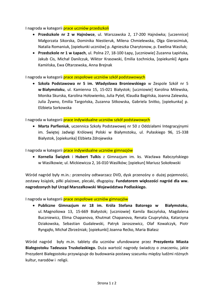 I nagroda w kategorii prace uczniów przedszkoli Przedszkole nr 2 w Hajnówce, ul. Warszawska 2, 17-200 Hajnówka; [uczennice] Małgorzata Sikorska, Dominika Niestieruk, Milena Chmielewska, Olga Gierasimiuk, Natalia Romaniuk, [opiekunki uczniów] p. Agnieszka Charytonow, p. Ewelina Wasiluk; Przedszkole nr 1 w Łapach, ul. Polna 27, 18-100 Łapy, [uczniowie] Zuzanna Łapioska, Jakub Cis, Michał Danilczuk, Wiktor Krasowski, Emilia Łochnicka, [opiekunki] Agata Kamioska, Ewa Ołtarzewska, Anna Brejnak I nagroda w kategorii prace zespołowe uczniów szkół podstawowych Szkoła Podstawowa nr 5 im. Władysława Broniewskiego w Zespole Szkół nr 5 w Białymstoku, ul. Kamienna 15, 15-021 Białystok; [uczniowie] Karolina Milewska, Monika Skurska, Karolina Hołowienko, Julia Pytel, Klaudia Bagioska, Joanna Zalewska, Julia Żywno, Emilia Targooska, Zuzanna Sitkowska, Gabriela Snitko, [opiekunka] p. Elżbieta Sorkowska I nagroda w kategorii prace indywidualne uczniów szkół podstawowych Marta Parfieniuk, uczennica Szkoły Podstawowej nr 50 z Oddziałami Integracyjnymi im. Świętej Jadwigi Królowej Polski w Białymstoku, ul. Pułaskiego 96, 15-338 Białystok, [opiekunka] Elżbieta Zdrojewska I nagroda w kategorii prace indywidualne uczniów gimnazjów Kornelia Świątek i Hubert Tulkis z Gimnazjum im. ks. Wacława Rabczyoskiego w Wasilkowie; ul. Mickiewicza 2, 16-010 Wasilków; [opiekun] Mariusz Sokołowski Wśród nagród były m.in.: przenośny odtwarzacz DVD, dysk przenośny o dużej pojemności, zestawy książek, piłki plażowe, plecaki, długopisy. Fundatorem większości nagród dla ww. nagrodzonych był Urząd Marszałkowski Województwa Podlaskiego. I nagroda w kategorii prace zespołowe uczniów gimnazjów Publiczne Gimnazjum nr 18 im. Króla Stefana Batorego w Białymstoku, ul. Magnoliowa 13, 15-669 Białystok; [uczniowie] Kamila Baczyoska, Magdalena Buczniewicz, Elima Chapanova, Khutmat Chapanova, Renata Czupryoska, Katarzyna Dziakowska, Sebastian Gudalewski, Patryk Jaroszewicz, Olaf Kowalczyk, Piotr Ryngajło, Michał Zbrzeźniak; [opiekunki] Joanna Redko, Maria Białasz Wśród nagród były m.in. tablety dla uczniów ufundowane przez Prezydenta Miasta Białegostoku Tadeusza Truskolaskiego. Duża wartośd nagrody świadczy o znaczeniu, jakie Prezydent Białegostoku przywiązuje do budowania postawy szacunku między ludźmi różnych kultur, narodów i religii. Strona 1 z 2 I nagroda w kategorii prace zespołowe na poziomie szkół ponadgimnazjalnych II Liceum Ogólnokształcące z Białoruskim Językiem Nauczania im. Bronisława Taraszkiewicza w Bielsku Podlaskim, ul. Kopernika 4, 17-100 Bielsk Podlaski; [opiekun] Włodzimierz Wawulski Nagrodą były m.in. warsztaty „Różnorodnośd podaj dalej” ufundowane przez Stowarzyszenie na rzecz Kultury i Dialogu 9/12 oraz Instytut Socjologii Uniwersytetu w Białymstoku, a także bilety ufundowane przez Teatr Wierszalin. I nagroda w kategorii prace indywidualne na poziomie szkół ponadgimnazjalnych Oskar Ciulkiewicz – II Liceum Ogólnokształcące z Białoruskim Językiem Nauczania im. Bronisława Taraszkiewicza w Bielsku Podlaskim, ul. Kopernika 4, 17-100 Bielsk Podlaski; [opiekun] Włodzimierz Wawulski Nagrodą były m.in. plecak i książki ufundowane m.in. przez Urząd marszałkowski Województwa Podlaskiego i Stowarzyszenie Przyjaciół VI Liceum Ogólnokształcącego im. Króla Zygmunta Augusta w Białymstoku. Nagrodę główną za całokształt działao szkoły Publiczne Gimnazjum nr 1 im. Polskiego Czerwonego Krzyża w Zespole Szkół Miejskich nr 1 w Grajewie, ul. Szkolna 12, 19-200 Grajewo, [opiekunki] Bożena Muczyoska, Ewelina Kamioska. Nagrodami były m.in. wizualizer, aparaty fotograficzne firmy Nikon i firmy Canon, e-booki. Fundatorami nagród byli p. poseł Robert Tyszkiewicz, pełnomocnik Rządu ds. Równego Traktowania p. Agnieszka KozłowskaRajewicz, Podlaski Kurator Oświaty p. Jerzy Kiszkiel i burmistrz Grajewa, p. Adam Kiełczewski. Wyróżnienie dla opiekuna uczniów, za zaangażowanie w krzewienie idei konkursu otrzymała pani Ewa Onoszko. Pani Onoszko nie tylko opiekowała się uczniami dwóch białostockich liceów, I LO im. Adama Mickiewicza i VI LO im. Króla Zygmunta Augusta, ale także kierowała przygotowaniem oprawy tanecznej uroczystości podsumowania drugiej edycji konkursu. Nagrodą był m.in. album o Białymstoku i całoroczny karnet na imprezy organizowane przez WOAK w Białymstoku. Strona 2 z 2