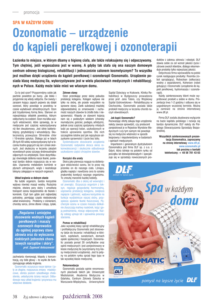 promocja SPA W KAŻDYM DOMU Ozonomatic – urządzenie do kąpieli perełkowej i ozonoterapii Łazienka to miejsce, w którym dbamy o higienę ciała, ale także relaksujemy się i odpoczywamy. Tym chętniej, jeśli wyposażona jest w wannę. A gdyby tak stała się ona naszym domowym centrum odnowy biologicznej, rehabilitacji i jednocześnie salonem kosmetycznym? To wszystko jest możliwe dzięki urządzeniu do kąpieli perełkowej i ozonoterapii Ozonomatic. Urządzenie posiada klasę medyczną IIa, wykorzystywane jest w wielu placówkach medycznych i rehabilitacyjnych w Polsce. Każdy może takie mieć we własnym domu. Co to jest ozon? Przypomnijmy sobie jak pachnie powietrze po burzy. Jak lekko i przyjemnie się wtedy oddycha. Ów świeży i zarazem kojący zapach pojawia się dzięki ozonowi, który powstaje w powietrzu w czasie wyładowań atmosferycznych. Ozon jest trzyatomową formą tlenu. Stanowi on najważniejszy składnik powietrza, którym oddychamy na codzień. Ozon ma kilka ważnych właściwości, które sprawiają, że w medycynie jest częściej wykorzystywany niż tlen dwuatomowy. Jest silnie bakteriobójczy, grzybobójczy i wirusobójczy. Skutecznością przewyższa 50-krotnie chlor i 10-krotnie spirytus. Dlatego już w latach 20-tych XX wieku wykorzystywany był w leczeniu trudno gojących się ran i zmian skórnych. Jest skuteczny w leczeniu zakażeń wywołanych przez szczepy drobnoustrojów odpornych na antybiotyki. Ozon dezynfekując równolegle dotlenia nasze tkanki, ponieważ bardzo dobrze rozpuszcza się w wodzie. Usprawnia metabolizm komórek w płynach ustrojowych, wiąże i neutralizuje toksyny zalegające w naszych organach. Układ krążenia w dobrym stanie Na ludzki organizm, bardzo korzystnie wpływa również masaż wodny. Rozluźnia mięśnie, otwiera pory skóry i umożliwia transport ozonu bezpośrednio do tkanek i komórek. Czyli tam gdzie jest najbardziej potrzebny, pomijając często niedoskonały układ krwionośny. Problemy z ciśnieniem, choroby serca, zimne dłonie i stopy, żylaki, „Regularne i umiejętne stosowanie wodnych kąpieli perełkowych i masaży ozonowych doprowadza do ogólnej poprawy stanu zdrowia oraz do wyleczenia niektórych jednostek chorobowych narządów i skóry”. prof. Zygmunt Antoszewski zachwiania równowagi, kłopoty z koncentracją, czy bóle głowy – to wynik źle funkcjonującego układu krążenia. Ozonomatic oczyszcza nasze tętnice i żyły ze złogów, rozpuszcza zmiany miażdżycowe, obniża poziom szkodliwego cholesterolu, uelastycznia ściany naczyń. Odbudowuje nasz układ krążenia i przywraca mu właściwe działanie. 38 Żyj zdrowo i aktywnie Zdrowe stawy Ozon przenikając przez skórę pobudza produkcję kolagenu. Kolagen wpływa nie tylko na skórę, ale przede wszystkim na sprawne stawy. Zanik substancji mazistej odpowiedzialnej za smarowanie i ruchomość naszych stawów to źródło bólu i niesprawności. Kłopoty ze stawami kojarzą nam się z podeszłym wiekiem (choroby reumatyczne, gościec, podagra, artretyzm), jednak coraz częściej spotykamy młodych ludzi po operacji kolan, uszkodzonych w trakcie uprawiania sportów. Dla nich szczególnie istotne jest jak najszybsze odzyskanie sprawności i życie bez bólu. Systematyczne stosowanie urządzenia Ozonomatic radykalnie skraca okres rekonwalescencji i skutecznie odbudowuje uszkodzone części chrzęstne stawów. Korzyści dla urody Skóra jako pierwsza reaguje na dotleniające właściwości ozonu, bo to przez nią przenika on do naszego ciała. Lśniąca, gładka napięta i nawilżona cera to oznaka znakomitej kondycji naszego organizmu. To zresztą marzenie każdej kobiety. Ozonomatic dba o skórę od wewnątrz i od zewnątrz. Oczyszcza organizm z toksyn, reguluje gospodarkę hormonalną, usprawnia produkcję kolagenu, zwiększa napięcie i jędrność, wpływa korzystnie na funkcje wydzielnicze naszej skóry, przyspiesza spalanie tkanki tłuszczowej. Pęcherzyki ozonu w czasie masażu delikatnie złuszczają martwy naskórek, koją i goją podrażnienia, niosąc odpoczynek. Każdy zabieg ujmuje lat i spowalnia procesy starzenia. Pomoc w rehabilitacji Jako wysokiej klasy sprzęt rehabilitacyjny i profilaktyczny Ozonomatic jest stosowany także do leczenia i rehabilitacji w klinikach, szpitalach, sanatoriach, domach opieki społecznej i hospicjach. Ozonomatic posiada ponad 20 certyfikatów oraz opinii medycznych i jest zarejestrowany w klasie medycznej IIa (wyróżniamy trzy klasy medyczności urządzenia). Jest to jedyny na polskim rynku sprzęt tego typu w tak wysokiej klasie medycznej. Rekomendacje Ozonomatic posiada opinie renomowanych placówek takich jak: Uniwersytet Mediolański, Akademia Medyczna w Gdańsku, Centrum Zdrowia Dziecka w Warszawie-Międzylesiu, Uniwersytecki październik 2008 Szpital Dziecięcy w Krakowie, Klinika Rehabilitacji w Bydgoszczy prowadzona przez prof. Jana Talara, czy Wojskowy Szpital Uzdrowiskowo - Rehabilitacyjny w Ciechocinku. Ozonomatic posiada także protokół medyczny w leczeniu chorób naczyń obwodowych. Jak kupić Ozonomatic? Rozważając ofertę zakupu tego urządzenia należy zawsze sprawdzić, czy producent zarejestrował je w Rejestrze Wyrobów Medycznych i czy tym samym nie powołuje się na medyczne właśności w sposób bezprawny i niepotwierdzony w badaniach i opiniach medycznych. Importerem i generalnym dystrybutorem Ozonomatica jest firma DLF sp. z o.o. z Gdyni, która istnieje na polskim rynku od początku lat dziewięćdziesiątych i specjalizuje się w sprzedaży nowoczesnych pro- duktów z zakresu zdrowia i robotyki. DLF stawia sobie za cel wzrost jakości życia i zdrowie swoich klientów, dlatego rekomenduje produkty tylko najwyższej jakości. Dotychczas firma wprowadziła na polski rynek następujące produkty: Roomba (robot sprzątający), Roboclean (odkurzacz wodny z separatorem), Kohersen (robot gotujący) i Ozonomatic (urządzenie do kąpieli perełkowej, hydromasażu i oz