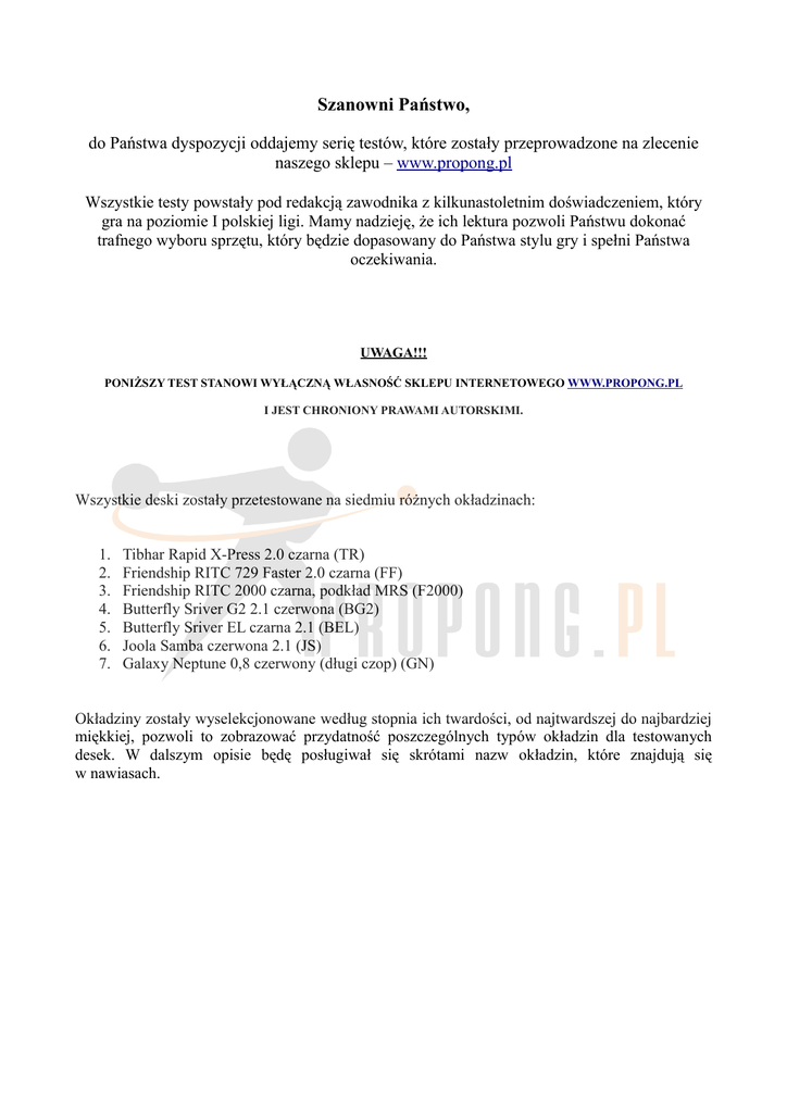 Szanowni Państwo, do Państwa dyspozycji oddajemy serię testów, które zostały przeprowadzone na zlecenie naszego sklepu – www.propong.pl Wszystkie testy powstały pod redakcją zawodnika z kilkunastoletnim doświadczeniem, który gra na poziomie I polskiej ligi. Mamy nadzieję, że ich lektura pozwoli Państwu dokonać trafnego wyboru sprzętu, który będzie dopasowany do Państwa stylu gry i spełni Państwa oczekiwania. UWAGA!!! PONIŻSZY TEST STANOWI WYŁĄCZNĄ WŁASNOŚĆ SKLEPU INTERNETOWEGO WWW.PROPONG.PL I JEST CHRONIONY PRAWAMI AUTORSKIMI. Wszystkie deski zostały przetestowane na siedmiu różnych okładzinach: 1. 2. 3. 4. 5. 6. 7. Tibhar Rapid X-Press 2.0 czarna (TR) Friendship RITC 729 Faster 2.0 czarna (FF) Friendship RITC 2000 czarna, podkład MRS (F2000) Butterfly Sriver G2 2.1 czerwona (BG2) Butterfly Sriver EL czarna 2.1 (BEL) Joola Samba czerwona 2.1 (JS) Galaxy Neptune 0,8 czerwony (długi czop) (GN) Okładziny zostały wyselekcjonowane według stopnia ich twardości, od najtwardszej do najbardziej miękkiej, pozwoli to zobrazować przydatność poszczególnych typów okładzin dla testowanych desek. W dalszym opisie będę posługiwał się skrótami nazw okładzin, które znajdują się w nawiasach. W1 i W2 Raczej miękkie, mimo zastosowaniu karbonu. Obydwie deski posiadają 5 warstw, przy czym sklejki w środkowej warstwie ułożone są prostopadle do płaszczyzny blatu deski. W1 ma pionowo poukładane sklejki z drewna, natomiast W2 ma pionowo poukładane sklejki z karbonu. Jakość wykonania tych desek jest wspaniała. Najdroższe dwa modele firmy Galaxy maja super uchwyty FL, jedne z najlepszych jakie w życiu trzymałem. Początkowo deskami grało się normalnie. Ale to tylko na początku, widocznie deski wymagały „rozbicia” ich. Po tygodniu gry, gra tymi obydwiema deskami to poezja. Warte są każdej ceny. Pewnie wielu z potencjalnych użytkowników zadaje sobie pytanie, czy ten nowy pomysł umieszczania środkowych sklejek coś daje. Początkowo deski się dla mnie niczym nie wyróżniały, ale po tygodniu gry już wiem, że ta technika „coś” daje. Moc z gry deski mają taką samą, a jest z czego naprawdę uderzyć. W2 z pionowo umiejscowionym karbonem daje wyczuwalnie lepszą kontrolę. Obydwie deski parametr kontroli mają wyjątkowo dobry przy oferowanej szybkości. Obydwie deski były testowane na wszystkich powyższych okładzinach. Nie mogę powiedzieć, żeby twardszymi lub bardziej miękkimi grało się lepiej. No może minimalnie miękkimi gra się lepiej, ale nie należy skreślać twardych, którymi również gra się wspaniale. BLOK: ten element w przypadku obydwu desek gra się wspaniale. Nie miałem problemów nawet ze stop blokiem. Nie było szczególnie większej potrzeby zmieniać kąta nachylenia blatu deski w stosunku do powierzchni stołu. Bloki kierowane były w punkt bez żadnego problemu. Mimo swojej szybkości deski posiadają tak jakby możliwość tłumienia szybkości na bloku, co daje możliwość kierowania piłeczki bez żadnego problemu w każdy punkt stołu. ZBICIE: tu początkowo miałem pewien problem. Potęgę zbicia obydwie deski mają ogromną. Różnica w grubości blatu około 0,3 mm, nie powoduje żadnej różnicy w zbiciu. Twardość desek i ich sprężystość dają ogromną moc w tym elemencie. Trzeba się przyzwyczaić do tego katapultu jakie deski posiadają. Już po kilku treningach można ten element dokładnie opanować. SERWIS: ten element na początku gry wymaga ogrania, lecz po kilku treningach jest już w porządku i można nadać piłeczce wystarczającej rotacji. Z odbiorem serwisu też nie miałem żadnych problemów. PODCIĘCIE, LOB: w tym elemencie zauważyłem małą różnicę w kontroli. Przy podcięciu na czopie w II i III strefie W2 zachowywała lepszą kontrolę niż W1. Natomiast loby za pomocą W1 i W2 to przyjemność. Kontrola w tym elemencie „zapiera dech w piersiach”. Od samego początku ten element grało się bardzo dobrze. TOPSPIN: w tym elemencie moc tych desek ujawnia się przede wszystkim przy grze bliżej stołu, gdzie z ogromną łatwością można zagrać topspin po bardzo rotowanych piłeczkach przeciwnika. Nie zmienia to faktu, że W1 i W2 również doskonale nadają się do gry tospinem w II i III strefie i zapewniają w tym elemencie doskonałą kontrolę. PODSUMOWANIE: Obydwie deski są godne polecenia pomimo swojej wysokiej ceny. Polecał bym bardziej do gry przy stole, lecz gra w II i III strefie gra nimi też jest bardzo prosta i przyjemna. Obydwie deski zachwycają swoją sprężystością, co przede wszystkim odbija się na zbiciu, które jest wspaniałe. Posiadają bardzo dobre przyspieszenie gry. Jestem przekonany, że zawodnicy ofensywni, którzy preferują grę bardziej przy stole odczują pełną satysfakcję z gry W1 i W2. Nieznaczna różnica w kontroli między W1 i W2 jest praktycznie niezauważalna. Poza tym obydwie deski oferują bardzo podobne parametry, wręcz mogę powiedzieć, że identyczne. Deski na pewno trzeba „rozbić”, bo na samym początku nie byłem za bardzo przekonany co do ich parametrów. Po tygodniu testów wiem, że te deski oprócz wysokiej ceny mają coś w sobie, co powoduje, że są godne polecenia każdemu graczowi off, ale nie tylko. W2 mogę również polecić bardzo aktywnym obrońcom, którzy z jednej strony mają okładziny czopowane, a z drugiej strony okładziny gładkie. Opis został sporządzony z efektów gry okładzinami FF i F2000 oraz GN W3 i W5 Obydwie deski są bardzo podobne do siebie pod względem parametrów producenta. Sprawdza się to również w praktyce. Średnio twarde deski. W swojej budowie W3 posiada 5 sklejek: 2 karbonowe i 3 drewniane, natomiast W5 ma 7 sklejek: 2 karbonowe i 5 drewnianych. Jakość wykonania oczywiście jak w przypadku wszystkich desek Galaxy jest znakomita. Wszystko dopracowane w najmniejszych szczegółach. Posiadają super wygodne uchwyty dopasowujące się do każdej