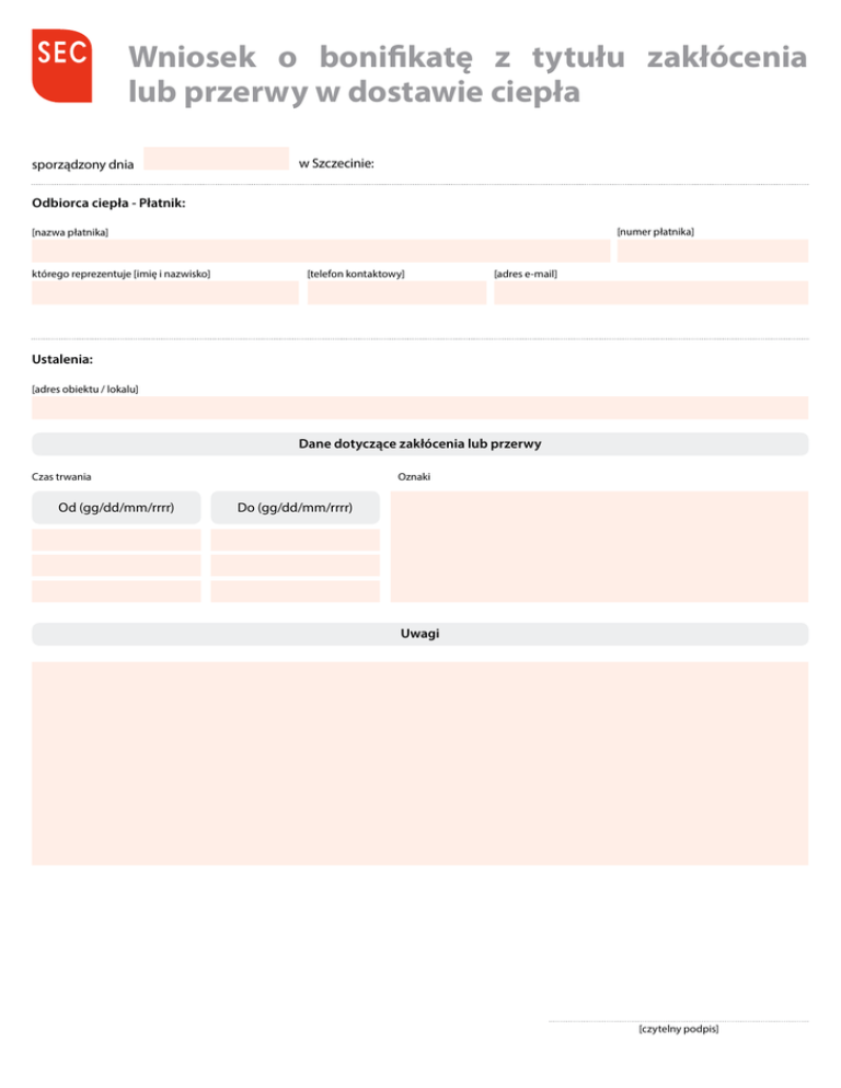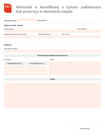 Wniosek o bonifikatę z tytułu zakłócenia lub przerwy w dostawie ciepła sporządzony dnia w Szczecinie: Odbiorca ciepła - Płatnik: [numer płatnika] [nazwa płatnika] którego reprezentuje [imię i nazwisko] [telefon kontaktowy] [adres e-mail] Ustalenia: [adres obiektu / lokalu] Dane dotyczące zakłócenia lub przerwy Czas trwania Od (gg/dd/mm/rrrr) Oznaki Do (gg/dd/mm/rrrr) Uwagi [czytelny podpis]