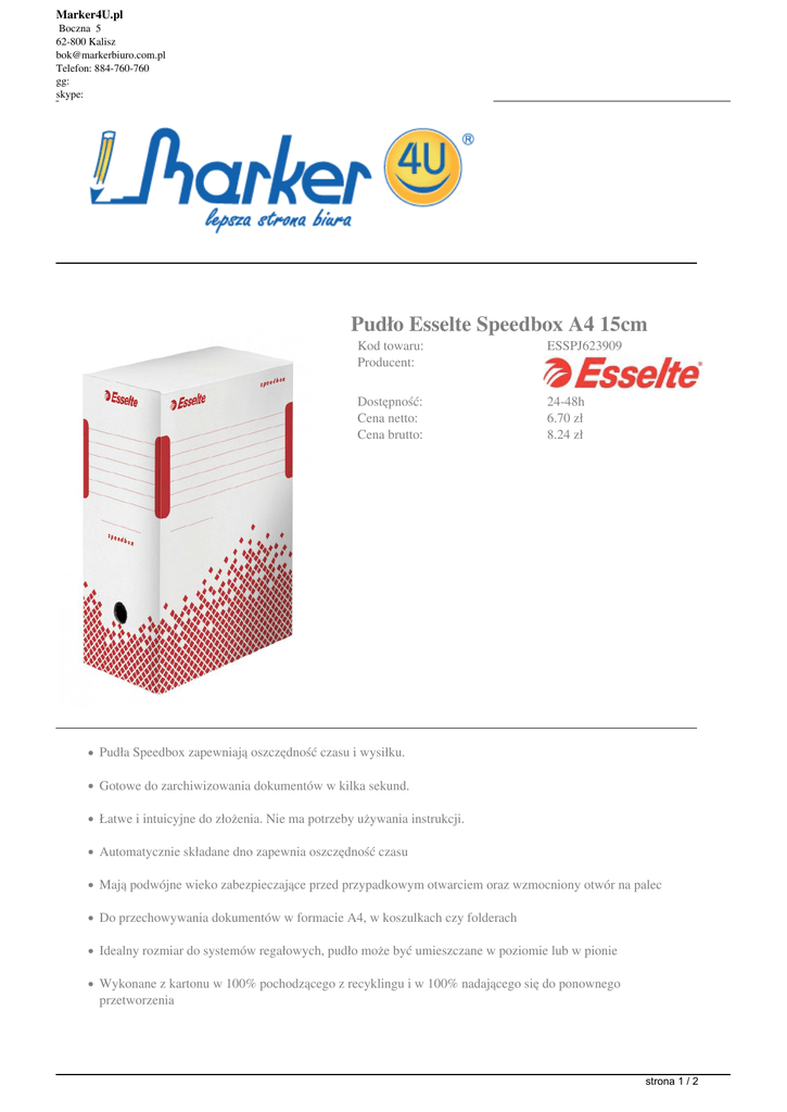 Marker4U.pl Boczna 5 62-800 Kalisz [email protected] Telefon: 884-760-760 gg: skype: Pudło Esselte Speedbox A4 15cm Kod towaru: Producent: ESSPJ623909 Dostępność: Cena netto: Cena brutto: 24-48h 6.70 zł 8.24 zł Pudła Speedbox zapewniają oszczędność czasu i wysiłku. Gotowe do zarchiwizowania dokumentów w kilka sekund. Łatwe i intuicyjne do złożenia. Nie ma potrzeby używania instrukcji. Automatycznie składane dno zapewnia oszczędność czasu Mają podwójne wieko zabezpieczające przed przypadkowym otwarciem oraz wzmocniony otwór na palec Do przechowywania dokumentów w formacie A4, w koszulkach czy folderach Idealny rozmiar do systemów regałowych, pudło może być umieszczane w poziomie lub w pionie Wykonane z kartonu w 100% pochodzącego z recyklingu i w 100% nadającego się do ponownego przetworzenia strona 1 / 2 Marker4U.pl Boczna 5 62-800 Kalisz [email protected] Telefon: 884-760-760 gg: skype: Posiadają certyfikat FSC Wymiary: 150x350x250mm strona 2 / 2 Powered by TCPDF (www.tcpdf.org)