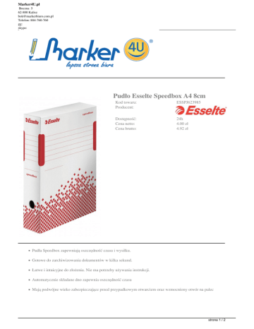 Marker4U.pl Boczna 5 62-800 Kalisz [email protected] Telefon: 884-760-760 gg: skype: Pudło Esselte Speedbox A4 8cm Kod towaru: Producent: ESSPJ623985 Dostępność: Cena netto: Cena brutto: 24h 4.00 zł 4.92 zł Pudła Speedbox zapewniają oszczędność czasu i wysiłku. Gotowe do zarchiwizowania dokumentów w kilka sekund. Łatwe i intuicyjne do złożenia. Nie ma potrzeby używania instrukcji. Automatycznie składane dno zapewnia oszczędność czasu Mają podwójne wieko zabezpieczające przed przypadkowym otwarciem oraz wzmocniony otwór na palec strona 1 / 2 Marker4U.pl Boczna 5 62-800 Kalisz [email protected] Telefon: 884-760-760 gg: skype: Do przechowywania dokumentów w formacie A4, w koszulkach czy folderach Idealny rozmiar do systemów regałowych, pudło może być umieszczane w poziomie lub w pionie Wykonane z kartonu w 100% pochodzącego z recyklingu i w 100% nadającego się do ponownego przetworzenia Posiadają certyfikat FSC Wymiary: 80x350x250mm strona 2 / 2 Powered by TCPDF (www.tcpdf.org)
