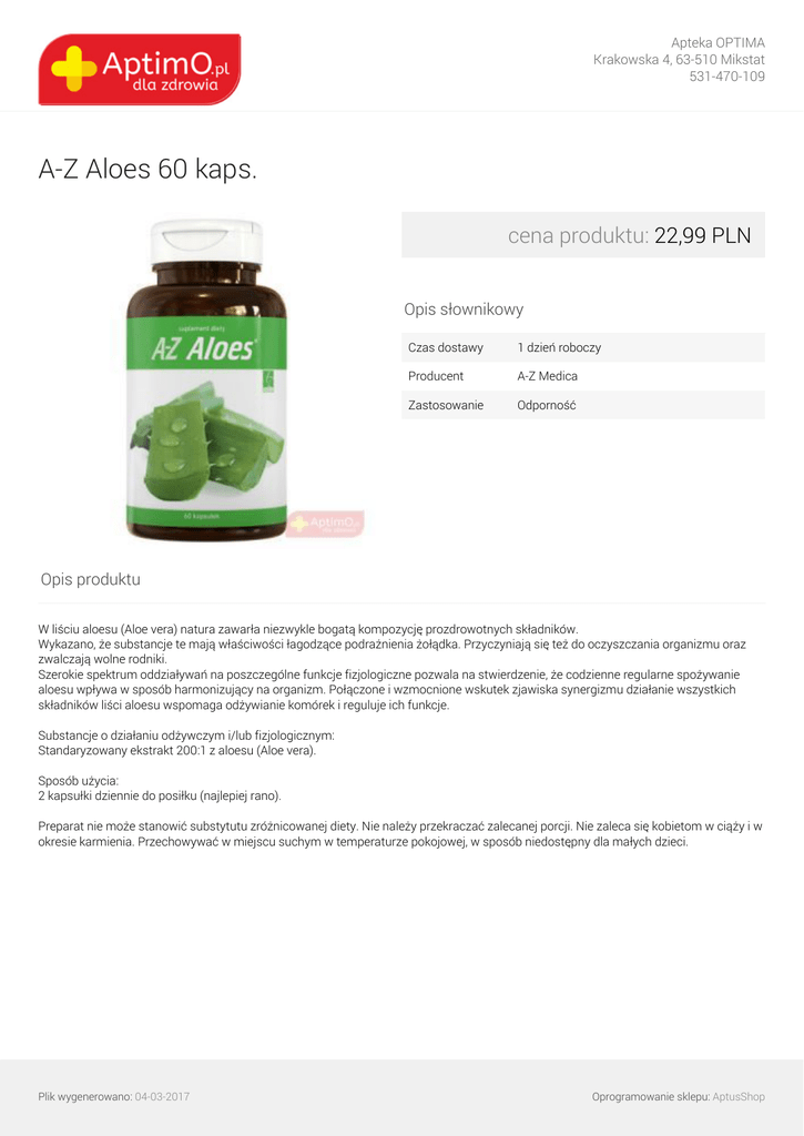 Apteka OPTIMA Krakowska 4, 63-510 Mikstat 531-470-109 A-Z Aloes 60 kaps. cena produktu: 22,99 PLN Opis słownikowy Czas dostawy 1 dzień roboczy Producent A-Z Medica Zastosowanie Odporność Opis produktu W liściu aloesu (Aloe vera) natura zawarła niezwykle bogatą kompozycję prozdrowotnych składników. Wykazano, że substancje te mają właściwości łagodzące podrażnienia żołądka. Przyczyniają się też do oczyszczania organizmu oraz zwalczają wolne rodniki. Szerokie spektrum oddziaływań na poszczególne funkcje fizjologiczne pozwala na stwierdzenie, że codzienne regularne spożywanie aloesu wpływa w sposób harmonizujący na organizm. Połączone i wzmocnione wskutek zjawiska synergizmu działanie wszystkich składników liści aloesu wspomaga odżywianie komórek i reguluje ich funkcje. Substancje o działaniu odżywczym i/lub fizjologicznym: Standaryzowany ekstrakt 200:1 z aloesu (Aloe vera). Sposób użycia: 2 kapsułki dziennie do posiłku (najlepiej rano). Preparat nie może stanowić substytutu zróżnicowanej diety. Nie należy przekraczać zalecanej porcji. Nie zaleca się kobietom w ciąży i w okresie karmienia. Przechowywać w miejscu suchym w temperaturze pokojowej, w sposób niedostępny dla małych dzieci. Plik wygenerowano: 04-03-2017 Powered by TCPDF (www.tcpdf.org) Oprogramowanie sklepu: AptusShop