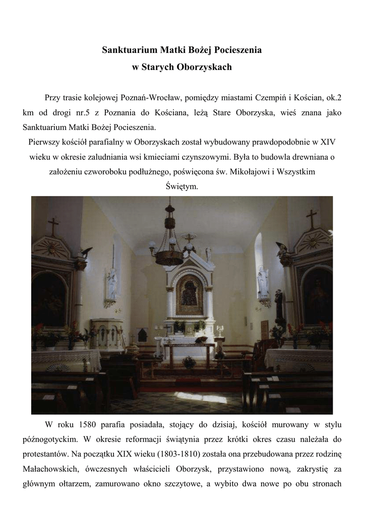 Sanktuarium Matki BoŜej Pocieszenia w Starych Oborzyskach Przy trasie kolejowej Poznań-Wrocław, pomiędzy miastami Czempiń i Kościan, ok.2 km od drogi nr.5 z Poznania do Kościana, leŜą Stare Oborzyska, wieś znana jako Sanktuarium Matki BoŜej Pocieszenia. Pierwszy kościół parafialny w Oborzyskach został wybudowany prawdopodobnie w XIV wieku w okresie zaludniania wsi kmieciami czynszowymi. Była to budowla drewniana o załoŜeniu czworoboku podłuŜnego, poświęcona św. Mikołajowi i Wszystkim Świętym. W roku 1580 parafia posiadała, stojący do dzisiaj, kościół murowany w stylu późnogotyckim. W okresie reformacji świątynia przez krótki okres czasu naleŜała do protestantów. Na początku XIX wieku (1803-1810) została ona przebudowana przez rodzinę Małachowskich, ówczesnych właścicieli Oborzysk, przystawiono nową, zakrystię za głównym ołtarzem, zamurowano okno szczytowe, a wybito dwa nowe po obu stronach ołtarza głównego, starym gotyckim oknom nadano sklepienie okrągłe. Nie zmieniono bramy ostrołukowej u wejścia pod chórem, ani starej framugi obok ołtarza głównego. Pod koniec XIX wieku wzniesiono nową dzwonnicę nad kruchtą, wstawiono sześć kolorowych okien i nowe ołtarze. Wskutek tych zmian i przebudów niewiele zostało śladów stylu gotyckiego. Po odnowieniu kościoła i wymurowaniu wielkiego ołtarza biskup poznański Edward Likowski w dzień odpustu Matki BoŜej Pocieszenia (3 września 1893 r.) dokonał konsekracji i ustalił nowy, obowiązujący do dzisiaj tytuł kościoła. Świątynia Oborzyska od początku swego istnienia posiadała trzy ołtarze, jeden główny, wielki i dwa mniejsze boczne, które w ciągu wieków przyjmowały róŜne wezwania. W ołtarzu głównym umieszczony jest wizerunek Matki BoŜej z Dzieciątkiem (Matki BoŜej ŚnieŜnej) z pierwszej połowy XVII wieku, namalowany na desce przez nieznanego malarza. Obraz ten pojawił się w Oborzyskach po odzyskaniu kościoła z rąk protestantów, a szybko rozwijający się kult maryjny był odpowiedzią, na ruch reformacyjny. U dołu obrazu dawniej widniał napis: „MATKA BOSKA POCIESZENIA W OBORZYSKACH STARZYCH", a obecnie - „MATKO POCIESZENIA - MÓDL SIĘ ZA NAMI". Sukienki Maryi i Dzieciątka oraz korony wykonane są z miedzianej blachy, grubo pozłacanej. Liczne wota, w większości niestety zagubione, świadczyły o cudownej mocy Matki BoŜej w Jej oborzyskim wizerunku. Wśród naszych parafian krąŜy do dzisiaj legenda o początkach kultu maryjnego. Bardzo dawno temu przechodził przez Oborzyska starzec podpierając się kulami. Wstąpił do kościoła, stanął przed obrazem Matki BoŜej i Ŝarliwie się modlił. Trwało to przez kolejne dni, aŜ zauwaŜył, Ŝe Jego nogi są zdrowe. Zostawił przed ołtarzem swoje kule. Lotem błyskawicy rozeszła się wśród ludności wieść o cudownej mocy Matki BoŜej. Ludzie tłumnie odwiedzali nasz kościółek, kaŜdy ze swoimi troskami i zmartwieniami. Kule zostawione przez starca przed cudownym obrazem wisiały w zakrystii do końca XIX wieku. W roku 1771 Oborzyska otrzymały od papieŜa Klemensa XIV pierwszy przywilej odpustowy, związany ze świętem NMP Pocieszenia. Kolejny został wydany w roku 1870 przez papieŜa Piusa IX. Tradycja oborzyskich odpustów jest bardzo długa. Odbywały się one zawsze w pierwszą niedzielę po 28 sierpnia, to jest po obchodach św. Augustyna. W XIX wieku do Oborzyskiego Sanktuarium Maryjnego przybywały licznie pielgrzymki, największe z Kościana, Czempinia, Gołębina, GryŜyny, Konojadu, Modrza, Rąbinia, Wyskoci, a nawet z odległego Stęszewa. Obecnie odpust w Oborzyskach trwa trzy dni (sobota - niedziela - poniedziałek). DuŜe wraŜenie na pątnikach wywiera maryjna pasterka odpustowa, kończąca pierwszy dzień oborzyskiego odpustu. W naszym sanktuarium maryjnym warto równieŜ zobaczyć obraz z XIX wieku przedstawiający Świętą Rodzinę - kopię obrazu Corregia, rokokową chrzcielnicę z końca XVIII wieku oraz figurę świętego Nepomucena z połowy XVII wieku (późnobarokowa).