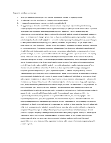Regulamin omnibusa sportowego. 1. W I etapie omnibusa sportowego z listy uczniów wyłonionych zostanie 10 najlepszych osób. 2. 10 najlepszych uczniów przechodzi do II etapu omnibusa sportowego. 3. II etap omnibusa sportowego rozegrany zostanie na zasadzie 1 z 10 4. Do gry przystępuje dziesiątka uczestników. Czas do namysłu i rozpoczęcia odpowiedzi wynosi 3 sekundy. Rozpoczęcie poprawnej odpowiedzi w trakcie sygnału oznaczającego upłynięcie trzech sekund zalicza odpowiedź. W przypadku złej odpowiedzi prowadzący podaje poprawną odpowiedz. Decyzja prowadzącego jest jednoznaczna, ostateczna i wiążąca dla uczestników. Zła odpowiedź lub brak odpowiedzi po upływie ustalonego czasu – to utrata szansy. II etap gry (gracze mają po dwie szanse). Każdemu graczowi prowadzący zadaje jedno pytanie. Za jedną złą odpowiedź lub jej brak – zawodnik traci jedną szansę. Dwa błędy eliminują uczestnika z gry. Ci, którzy odpowiedzieli na co najmniej jedno pytanie, przechodzą dalej do III etapu. W tym etapie każdy z grających ma tyle szans, ile wyniósł z II etapu. Gracze, po udzieleniu poprawnej odpowiedzi, wskazują zawodnika do następnego pytania. Prowadzący rozpoczyna zadawanie pytań od pierwszego w kolejności zawodnika. Jeśli nie udzielił on dobrej odpowiedzi, traci jedną szansę, a prowadzący zadaje kolejno następne pytania kolejnym graczom tak długo, aż padnie poprawna odpowiedź. Jeżeli wskazany gracz nie odpowie poprawnie - traci jedną szansę, a wskazuje nadal gracz, który ostatni udzielił prawidłowej odpowiedzi. III etap trwa do chwili, kiedy pozostaje trzech graczy. IV etap – finał Do IV etapu przechodzą trzej zawodnicy, którzy: dostają po dwie nowe szanse, dostają po tyle punktów, ile szans zachowali po dwóch etapach (czyli maksymalnie mogą dostać dwa punkty). Dwie niedobre odpowiedzi lub ich brak – powodują odpadnięcie z gry (utrata dwóch szans). W tym etapie w puli jest czterdzieści pytań. Etap IV dzieli się na dwie części: I część Prowadzący zadaje pytania wszystkim graczom. Kto pierwszy się zgłosi i poprawnie odpowie na pytanie, otrzymuje dziesięć punktów. Zawodnicy mogą zgłaszać się podczas odczytywania pytania, jednak po zgłoszeniu się do odpowiedzi prowadzący odczytuje pytanie do końca i wtedy zaczyna się pomiar czasu. Zła odpowiedź lub jej brak to strata szansy. Jeżeli żaden z graczy nie zgłosi się do odpowiedzi w ciągu trzech sekund od momentu zadania pytania – wówczas nikt nie traci szansy. Grający, który pierwszy odpowie dobrze na jedno pytania, rozpoczyna drugą część tego etapu. Gracz, który udzielił dobrej odpowiedzi może wskazać innego gracza lub sam odpowiadać na kolejne pytanie. Za dobrą odpowiedź gracz otrzymuje dziesięć punktów, a przy wskazaniu na siebie dwadzieścia punktów. Za odpowiedź błędną lub jej brak w ustalonym czasie - następuje strata jednej szansy i kolejnego pytanego wskazuje zawodnik, który uprzednio udzielił dobrej odpowiedzi. W przypadku gdy gracz wskazał na siebie i nie odpowiedział, prowadzący kieruje pytanie do wszystkich i odpowiada ten, kto pierwszy się zgłosi. Jeżeli odpowiedź jest poprawna, gracz, który jej udzielił, ma znów możliwość wyboru – albo odpowiada sam, albo wskazuje innego zawodnika. Zakończenie gry następuje w takich przypadkach: 1. Zostaje jeden gracz (pozostali dwaj odpadli na skutek utraty dwóch szans) i ten wygrywa, bez względu na liczbę punktów. Zawodnik odpowiada dalej, aż do wyczerpania pytań lub utraty pozostałych szans, uzyskując w ten sposób możliwość powiększenia swego dorobku punktowego. Za każdą zachowaną szansę po wyczerpaniu puli pytań dolicza się po dziesięć punktów. Zwycięzca otrzymuje ustaloną przez organizatorów w danej edycji nagrodę . Kończy się pula 40 pytań. Zawodnikom dolicza się po dziesięć punktów za każdą zachowaną szansę. W tym momencie ustalony jest ostateczny wynik. Wygrywa ten grający, który zgromadził najwięcej punktów. Jeżeli dwóch lub trzech zawodników ma tę samą liczbę punktów, organizator zastrzega sobie prawo wyłonienia jednego zwycięzcy lub podziału nagrody.