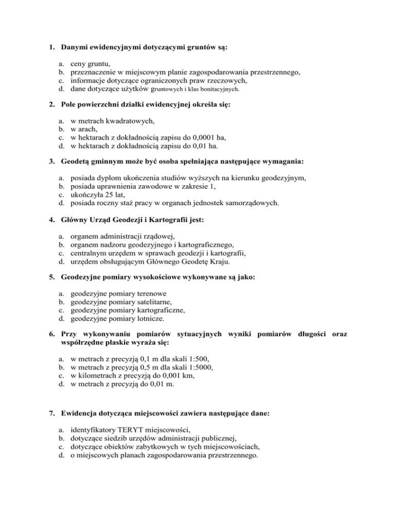 1. Danymi ewidencyjnymi dotyczącymi gruntów są: a. b. c. d. ceny gruntu, przeznaczenie w miejscowym planie zagospodarowania przestrzennego, informacje dotyczące ograniczonych praw rzeczowych, dane dotyczące użytków gruntowych i klas bonitacyjnych. 2. Pole powierzchni działki ewidencyjnej określa się: a. b. c. d. w metrach kwadratowych, w arach, w hektarach z dokładnością zapisu do 0,0001 ha, w hektarach z dokładnością zapisu do 0,01 ha. 3. Geodetą gminnym może być osoba spełniająca następujące wymagania: a. b. c. d. posiada dyplom ukończenia studiów wyższych na kierunku geodezyjnym, posiada uprawnienia zawodowe w zakresie 1, ukończyła 25 lat, posiada roczny staż pracy w organach jednostek samorządowych. 4. Główny Urząd Geodezji i Kartografii jest: a. b. c. d. organem administracji rządowej, organem nadzoru geodezyjnego i kartograficznego, centralnym urzędem w sprawach geodezji i kartografii, urzędem obsługującym Głównego Geodetę Kraju. 5. Geodezyjne pomiary wysokościowe wykonywane są jako: a. b. c. d. geodezyjne pomiary terenowe geodezyjne pomiary satelitarne, geodezyjne pomiary kartograficzne, geodezyjne pomiary lotnicze. 6. Przy wykonywaniu pomiarów sytuacyjnych wyniki pomiarów długości oraz współrzędne płaskie wyraża się: a. b. c. d. w metrach z precyzją 0,1 m dla skali 1:500, w metrach z precyzją 0,5 m dla skali 1:5000, w kilometrach z precyzją do 0,001 km, w metrach z precyzją do 0,01 m. 7. Ewidencja dotycząca miejscowości zawiera następujące dane: a. b. c. d. identyfikatory TERYT miejscowości, dotyczące siedzib urzędów administracji publicznej, dotyczące obiektów zabytkowych w tych miejscowościach, o miejscowych planach zagospodarowania przestrzennego. 8. Danymi opisującymi punkt adresowy są: a. b. c. d. nazwa ulicy lub placu, identyfikatory TERYT nazw ulic i placów, numer porządkowy, nazwa obrębu ewidencyjnego. 9. Mapa punktów adresowych zawiera: a. b. c. d. granice trójstopniowego podziału terytorialnego państwa, punkty adresowe i ich numery porządkowe, granice i nazwy obrębów ewidencyjnych, nazwę województwa, powiatu i gminy. 10. Urzędowy wykaz miejscowości i ich części zawiera między innymi: a. b. c. d. liczbę mieszkańców miejscowości, identyfikator z rejestru granic i jednostek podziałów terytorialnych państwa, informacje dotyczące siedziby organów samorządowych, gminę, w której miejscowość jest położona. 11. Państwowy rejestr granic (PRG) tworzy się na podstawie: a. b. c. d. danych i informacji Głównego Urzędu Statystycznego, kopii zabezpieczających bazy danych zasobu, TERYT, danych i informacji dotyczących terenów zamkniętych. 12. Aktualizacji państwowego rejestru granic w zakresie zasadniczego, trójstopniowego podziału terytorialnego państwa dokonuje się na podstawie: a. b. c. d. baz danych mapy zasadniczej, map topograficznych w skali 1:10000, przepisów prawa wprowadzających zmiany w tym podziale, informacji Głównego Urzędu Statystycznego. 13. Dane państwowego rejestru granic (PRG) podlegają okresowej weryfikacji: a. b. c. d. raz w roku na dzień 01.01, nie rzadziej niż co 5 lat, nie rzadziej niż co 10 lat, w razie potrzeby, którą określa wojewódzki inspektor nadzoru geodezyjnego i kartograficznego. 14. W powiatowej części zasobu geodezyjnego i kartograficznego gromadzone są między innymi: a. b. c. d. oryginały operatów szacunkowych, mapy topograficzne w skali 1:5000, mapy tematyczne obejmujące obszar powiatu, operaty techniczne z prac mających na celu wznowienie znaków granicznych. 15. Oryginał materiału zasobu może być wydany poza miejsce jego przechowywania: a. b. c. d. jeżeli jest to niezbędne do wykonania zadań publicznych określonych przez ustawy, na żądanie sądu, na wniosek wykonawcy tego materiału, na wniosek wojewódzkiego inspektora nadzoru geodezyjnego i kartograficznego. 16. Tereny zamknięte niezbędne dla obronności państwa, na których Minister Obrony Narodowej nadzoruje prace geodezyjne i kartograficzne to: a. magazyny żywności, b. porty, c. tereny przeznaczone w miejscowych planach zagospodarowania przestrzennego pod lotniska wojskowe, d. lotniska. 17. Nadzór nad pracami geodezyjnymi na terenach zamkniętych polega na ocenie: a. b. c. d. posiadania przez wykonawców prac uprawnień zawodowych, przestrzegania przepisów o ochronie informacji niejawnych, stosowania właściwych instrumentów geodezyjnych do wykonywania prac, terminowości wykonania prac. 18. Starosta ma prawo przeprowadzania kontroli przedsiębiorców, wykonujących prace geodezyjne, w zakresie: a. b. c. d. ochrony znaków geodezyjnych, stosowania odpowiedniego sprzętu do wykonywania pomiarów geodezyjnych, wypełniania obowiązku ochrony informacji niejawnych, wypełniania obowiązku zgłaszania prac geodezyjnych. 19. Starosta przeprowadza kontrolę przedsiębiorców w trybie: a. b. c. d. kontroli doraźnej, kontroli kompleksowej, kontroli problemowej, kontroli wieloetapowej. 20. Zrządzający kontrolę przedsiębiorców, zobowiązany jest do powiadomienia kierownika jednostki kontrolowanej: a. b. c. d. niezwłocznie, na 3 dni przed rozpoczęciem kontroli, na 7 dni przed rozpoczęciem kontroli, na 14 dni przed rozpoczęciem kontroli. 21. Kierownik przedsiębiorstwa zawiadamia zarządzającego kontrolę o wykonaniu zaleceń pokontrolnych: a. b. c. d. w ciągu 7 dni od otrzymania zaleceń pokontrolnych, w ciągu 14 dni od otrzymania zaleceń pokontrolnych, w ciągu 30 dni od otrzymania zaleceń pokontrolnych, niezwłocznie po wykonaniu zaleceń. 22. W nagłych wypadkach związanych z wykonaniem pomiarów powykonawczych sieci uzbrojenia terenu zgłoszenie pracy może nastąpić: a. b. c. d. wraz z przekazaniem dokumentacji do zasobu, w ciągu 7 dni po rozpoczęciu pracy, w ciągu 14 dni po rozpoczęciu pracy, po rozpoczęciu pracy, jednak nie później niż w ciągu 3 dni roboczych. 23. Wykonawca prac geodezyjnych zobowiązany jest do zawi