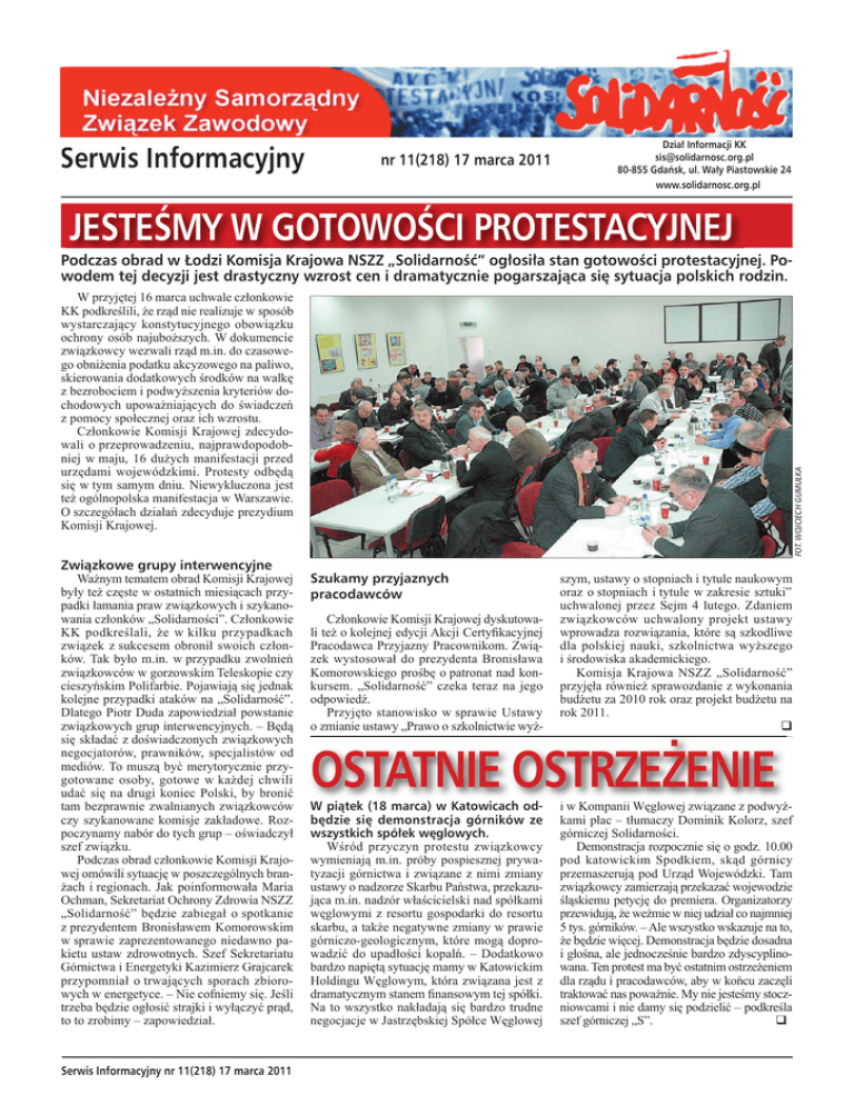Serwis Informacyjny nr 11(218) 17 marca 2011 Dział Informacji KK [email protected] 80-855 Gdańsk, ul. Wały Piastowskie 24 www.solidarnosc.org.pl JESTEŚMY W GOTOWOŚCI PROTESTACYJNEJ Podczas obrad w Łodzi Komisja Krajowa NSZZ „Solidarność” ogłosiła stan gotowości protestacyjnej. Powodem tej decyzji jest drastyczny wzrost cen i dramatycznie pogarszająca się sytuacja polskich rodzin. Związkowe grupy interwencyjne Ważnym tematem obrad Komisji Krajowej były też częste w ostatnich miesiącach przypadki łamania praw związkowych i szykanowania członków „Solidarności”. Członkowie KK podkreślali, że w kilku przypadkach związek z sukcesem obronił swoich członków. Tak było m.in. w przypadku zwolnień związkowców w gorzowskim Teleskopie czy cieszyńskim Polifarbie. Pojawiają się jednak kolejne przypadki ataków na „Solidarność”. Dlatego Piotr Duda zapowiedział powstanie związkowych grup interwencyjnych. – Będą się składać z doświadczonych związkowych negocjatorów, prawników, specjalistów od mediów. To muszą być merytorycznie przygotowane osoby, gotowe w każdej chwili udać się na drugi koniec Polski, by bronić tam bezprawnie zwalnianych związkowców czy szykanowane komisje zakładowe. Rozpoczynamy nabór do tych grup – oświadczył szef związku. Podczas obrad członkowie Komisji Krajowej omówili sytuację w poszczególnych branżach i regionach. Jak poinformowała Maria Ochman, Sekretariat Ochrony Zdrowia NSZZ „Solidarność” będzie zabiegał o spotkanie z prezydentem Bronisławem Komorowskim w sprawie zaprezentowanego niedawno pakietu ustaw zdrowotnych. Szef Sekretariatu Górnictwa i Energetyki Kazimierz Grajcarek przypomniał o trwających sporach zbiorowych w energetyce. – Nie cofniemy się. Jeśli trzeba będzie ogłosić strajki i wyłączyć prąd, to to zrobimy – zapowiedział. Serwis Informacyjny nr 11(218) 17 marca 2011 FOT. WOJCIECH GUMUŁKA W przyjętej 16 marca uchwale członkowie KK podkreślili, że rząd nie realizuje w sposób wystarczający konstytucyjnego obowiązku ochrony osób najuboższych. W dokumencie związkowcy wezwali rząd m.in. do czasowego obniżenia podatku akcyzowego na paliwo, skierowania dodatkowych środków na walkę z bezrobociem i podwyższenia kryteriów dochodowych upoważniających do świadczeń z pomocy społecznej oraz ich wzrostu. Członkowie Komisji Krajowej zdecydowali o przeprowadzeniu, najprawdopodobniej w maju, 16 dużych manifestacji przed urzędami wojewódzkimi. Protesty odbędą się w tym samym dniu. Niewykluczona jest też ogólnopolska manifestacja w Warszawie. O szczegółach działań zdecyduje prezydium Komisji Krajowej. Szukamy przyjaznych pracodawców Członkowie Komisji Krajowej dyskutowali też o kolejnej edycji Akcji Certyfikacyjnej Pracodawca Przyjazny Pracownikom. Związek wystosował do prezydenta Bronisława Komorowskiego prośbę o patronat nad konkursem. „Solidarność” czeka teraz na jego odpowiedź. Przyjęto stanowisko w sprawie Ustawy o zmianie ustawy „Prawo o szkolnictwie wyż- szym, ustawy o stopniach i tytule naukowym oraz o stopniach i tytule w zakresie sztuki” uchwalonej przez Sejm 4 lutego. Zdaniem związkowców uchwalony projekt ustawy wprowadza rozwiązania, które są szkodliwe dla polskiej nauki, szkolnictwa wyższego i środowiska akademickiego. Komisja Krajowa NSZZ „Solidarność” przyjęła również sprawozdanie z wykonania budżetu za 2010 rok oraz projekt budżetu na rok 2011. OSTATNIE OSTRZEŻENIE W piątek (18 marca) w Katowicach odbędzie się demonstracja górników ze wszystkich spółek węglowych. Wśród przyczyn protestu związkowcy wymieniają m.in. próby pospiesznej prywatyzacji górnictwa i związane z nimi zmiany ustawy o nadzorze Skarbu Państwa, przekazująca m.in. nadzór właścicielski nad spółkami węglowymi z resortu gospodarki do resortu skarbu, a także negatywne zmiany w prawie górniczo-geologicznym, które mogą doprowadzić do upadłości kopalń. – Dodatkowo bardzo napiętą sytuację mamy w Katowickim Holdingu Węglowym, która związana jest z dramatycznym stanem finansowym tej spółki. Na to wszystko nakładają się bardzo trudne negocjacje w Jastrzębskiej Spółce Węglowej i w Kompanii Węglowej związane z podwyżkami płac – tłumaczy Dominik Kolorz, szef górniczej Solidarności. Demonstracja rozpocznie się o godz. 10.00 pod katowickim Spodkiem, skąd górnicy przemaszerują pod Urząd Wojewódzki. Tam związkowcy zamierzają przekazać wojewodzie śląskiemu petycję do premiera. Organizatorzy przewidują, że weźmie w niej udział co najmniej 5 tys. górników. – Ale wszystko wskazuje na to, że będzie więcej. Demonstracja będzie dosadna i głośna, ale jednocześnie bardzo zdyscyplinowana. Ten protest ma być ostatnim ostrzeżeniem dla rządu i pracodawców, aby w końcu zaczęli traktować nas poważnie. My nie jesteśmy stoczniowcami i nie damy się podzielić – podkreśla szef górniczej „S”. STAN WOJENNY NIEKONSTYTUCYJNY Protest przeciwko zwoln i e n i o m grupowym w Poczcie Polskiej S.A. i likwidacji części urzędów pocztowych zorganizowali 16 marca w Warszawie, pocztowcy. Powodem protestu są plany zarządu Poczty Polskiej, które zakładają że pracę w spółce może stracić ok. 8 tys. osób. Nawet 5 tys. z nich może być objęte zwolnieniami grupowymi. Firma chce też zastąpić około 3 tys. placówek pocztowych agencjami. W miejsce jednego likwidowanego urzędu mają powstać 2-3 agencje. Zdaniem związkowców będzie to duży problem dla mieszkańców małych miejscowości i wsi, gdzie nie wszędzie powstaną agencje. – Będą oni pozbawieni usług, do których świadczenia Poczta została powołana – mówi Bogumił Nowicki, szef NSZZ „Solidarność” w Poczcie Polskiej. „Łapy precz od Poczty Polskiej” m.in. takie transparenty nieśli ze sobą pocztowcy. Pod Kancelarię Premiera przynieśli trumnę, symbolizującą śmierć Poczt