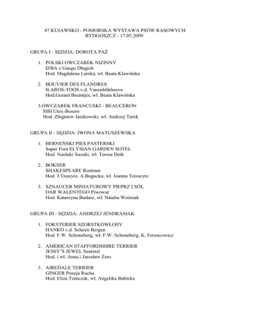 47 KUJAWSKO - POMORSKA WYSTAWA PSÓW RASOWYCH BYDGOSZCZ - 17.05.2009 GRUPA I - SĘDZIA: DOROTA PAŹ 1. POLSKI OWCZAREK NIZINNY IZBA z Gangu Długich Hod. Magdalena Larska, wł. Beata Klawińska 2. BOUVIER DES FLANDRES ILAROS-TOOS v.d. Vanenblikhoeve Hod.Gerard Bruintjes, wł. Beata Klawińska 3.OWCZAREK FRANCUSKI - BEAUCERON SISI Utex-Bosero Hod. Zbigniew Janikowski, wł. Andrzej Turek GRUPA II - SĘDZIA: IWONA MATUSZEWSKA 1. BERNEŃSKI PIES PASTERSKI Super Foot ELYSIAN GARDEN SOTEL Hod. Naoluki Suzuki, wł. Teresa Deik 2. BOKSER SHAKESPEARE Rostrum Hod. J.Tisseyre, A.Bogucka, wł. Joanna Teisseyre 3. SZNAUCER MINIATUROWY PIEPRZ I SÓL DAR WALENTEGO Piwowar Hod. Katarzyna Budasz, wł. Natalia Woźniak GRUPA III - SĘDZIA: ANDRZEJ JENDRASIAK 1. FOKSTERIER SZORSTKOWŁOSY HANKO v.d. Schoen Bergen Hod. F.W. Schoneberg, wł. F.W. Schoneberg, K. Ferencowicz 2. AMERICAN STAFFORDSHIRE TERRIER JESSY’S JEWEL Sentinel Hod. i wł. Anna i Jarosław Żero 3. AIREDALE TERRIER GINGER Poezja Ruchu Hod. Eliza Tomczak, wł. Angelika Babicka GRUPA IV - SĘDZIA: ROMAN SOBKOWICZ 1. JAMNIK DŁUGOWŁOSY STANDARDOWY PRINC z Końskiego Raju Hod. Elżbieta Olszańska, wł. Zbigniew Ziółkowski 2. JAMNIK SZORSTKOWŁOSY MINIATUROWY MAXIPES FIK Vitoraz Hod. Jan Busta, wł. Beata Żyder 3. JAMNIK DŁUGOWŁOSY MINIATUROWY NASH Della Canterana Hod. Daniela Giannini, wł. Marek Juchniewicz GRUPA V - SĘDZIA: ELŻBIETA AUGUSTYNIAK 1. AKITA AMERYKAŃSKA JAZGAR MAD MAX Hod. i wł. Paweł Watral 2. SIBERIAN HUSKY Snowmist’s OSTIA OF ARTROGEA Hod. Kim Ramey Leblanc, wł.Mary Louis Franklin, Żaneta Żmuda Kozina 3. THAI RIDGEBACK DOG FAWN GIRL THAI Bellijess Hod. Kamila Vidova, wł. Maria Baranowska GRUPA VI - SĘDZIA: ELŻBIETA SOBIESZCZAŃSKA 1. GOŃCZY POLSKI WIELKI ŁOWCA Kłusująca Sfora Hod. Grzegorz Weron, wł. Stanisław Manikowski 2. RHODESIAN RIDGEBACK CAR Guernica Hod. i wł. Julian Szałkiewicz 3. POSOKOWIEC BAWARSKI CHOCOLATE Hazba Hod. Beata Zach, wł. Anna i Małgorzata Cysewskie GRUPA VII - SĘDZIA: MAŁGORZATA LORENC 1. WYŻEŁ NIEMIECKI KRÓTKOWŁOSY AGHRA Teogonia Hod. i wł. Joanna Boczkowska 2. WYŻEŁ WEIMARSKI KRÓTKOWŁOSY Bromhund WERWA Hod. Suzanne Mayhew, wł. Dorota Mikus-Koralewska 3. POINTER DRED Sulania Hod. Anna Szwarczewska, wł. Jacek Adamczyk GRUPA VIII - SĘDZIA: PAVEL SULCEK (CZ) 1. COCKER SPANIEL ANGIELSKI X-TREME Ricci Club Hod. i wł. Zofia Konderla 2. SPRINGER SPANIEL ANGIELSKI MAGIC MIST Three Ponds Valley Hod. i wł. Iwona Staniszewska-Noga 3. GOLDEN RETRIEVER LAURENSTAR CANDELA COCKTAIL Hod. Laurencje Jacob, wł. Ewa Szeligowska GRUPA IX - SĘDZIA: ADAM CHABIK 1. SPANIEL KONTYNENTALNY MINIATUROWY - PAPILLON TAMARIN vom Schwabenhof Hod. Marlies Weber, wł. Monika Maurer 2. BULDOG FRANCUSKI CHARLOTTE TEN YEARS AFTER Hod. Katarzyna Hładko, wł. Stella Zawadzka 3. MOPS METEORYT Pomarszczony Czar Hod. i wł. Jolanta Walczak GRUPA X - SĘDZIA: TOMASZ KUSZYK 1. CHART AFGAŃSKI INDISTINGUISHABLE IDEA VARIUS AVIS Hod. Agnieszka Bonk, wł. Eliza Adamowska 2. WHIPPET CLIO z Rawskiego Tataru Hod. Anna Herman, wł. Agata Mijakowska-Klarecka 3. CHART ROSYJSKI BORZOJ MIF MONACH Magnus Borzoj Hod. i wł. Monika Jarczyńska KONKURENCJA „MŁODY PREZENTER” - SĘDZIA: ANDRZEJ JENDRASIAK GRUPA MŁODSZA 1.Małgorzata Tymczak 2. Antonina Zakrzewska 3. Wiktoria Sapała 4. Mikołaj Wyrzykowski GRUPA STARSZA 1. 2. 3. 4. Agata Wilczewska Martyna Sapała Kamila Żmijewska Agnieszka Eufrat ZWYCIĘZCA DNIA: AGATA WILCZEWSKA KONKURENCJE FINAŁOWE NAJPIĘKNIEJSZE SZCZENIĘ WYSTAWY - SĘDZIA: DOROTA KUCZYŃSKASTANDEŁŁO 1. SZNAUCER OLBRZYM CZARNY Jamag-ol THOR Hod. Janusz Madziarek, wł. Aleksandra i Janusz Madziarek 2. GOLDEN RETRIEVER Souvenir BEST OF THE BEST Hod. Tomasz Żmijewski, wł. Kamila Żmijewska 3. LHASA APSO PULP FICTION z Czańca Hod. Anna Dzidt, wł. Dorota Sapała, A. Dzidt NAJPIĘKNIEJSZY JUNIOR WYSTAWY - SĘDZIA: ELŻBIETA SOBIESZCZAŃSKA 1. SZPIC MINIATUROWY (POMERANIAN) LIVE FOREVER Mountain Stream Hod. i wł. Grażyna Andrzejewska 2. BULLMASTIFF AUDREY BULLA Bohemia Hod. Petr Vachek, wł. Magdalena Góras 3. BOUVIER DES FLANDRES YOSCA-LOES v.d. Vanenblikhoeve Hod. Gerard Bruintjes, wł. Beata Klawińska NAJPIĘKNIEJSZY WETERAN WYSTAWY - SĘDZIA: MAŁGORZATA JUREKERENSKA 1. CHIŃSKI GRZYWACZ NABAB Germanika (ur. 16.09.2000) Hod. i wł. Adam Ostrowski 2. BOUVIER DES FLANDRES ILAROS-TOOS v.d. Vanenblikhoeve (ur.28.10.2000) Hod. Gerard Bruintjes, wł. Beata Klawińska 3. SZNAUCER ŚREDNI PIEPRZ I SÓL Argenta’s LOJTNANT LOKE (ur.16.01.2000) Hod. Birgitta Anderson, wł. Dolores i Waldemar Domagalscy NAJPIĘKNIEJSZY PIES RAS POLSKICH - SĘDZIA: MAŁGORZATA LORENC 1. POLSKI OWCZAREK NIZINNY IZBA z Gangu Długich Hod. Magdalena Larska, wł. Beata Klawińska 2. GOŃCZY POLSKI WIELKI ŁOWCA Kłusująca Sfora Hod. Grzegorz Weron, wł. Stanisław Manikowski NAJPIĘKNIEJSZY PIES UŻYTKOWY RAS MYŚLIWSKICH - SĘDZIA: LESZEK SIEJKOWSKI 1. WYŻEŁ NIEMIECKI KRÓTKOWŁOSY AMO Teogonia Hod. Joanna Boczkowska, wł. Joanna Boczkowska i Jiri Drabek 2. JAMNIK SZORSTKOWŁOSY MINIATUROWY POLA RAKSA Brzdąc Hod. i wł. Agnieszka i Katarzyna Klusak 3. GOŃCZY POLSKI BORA Piękna Wieś Hod. Cezary Koss, wł. Joanna Woźniewicz NAJPIĘKNIEJSZY PIES UŻYTKOWY- SĘDZIA: ZBIGNIEW OSTROWSKI 1. DOBERMAN Tira Vento CHOCO Hod. i wł. Dorota i Katarzyna Plewka NAJPIĘKNIEJSZY PIES 47 KUJAWSKO - POMORSKIEJ WYSTAWY PSÓW RASOWYCH - BYDGOSZCZ 2009 BEST IN SHOW 1. BERNEŃSKI PIES PASTERSKI Super Foot ELYSIAN GARDEN SOTEL Hod. Naoluki Suzuki, wł. Teresa Deik 2. SPANIEL KONTYNENTALNY MINIATUROWY (PAPILLON) TAMARIN vom Schwabenhof Hod. Marlies Weber, wł. Monika Maurer 3. AKITA AMERYKAŃSKA Jazgar MAD MAX Hod. i wł. Paweł Watral