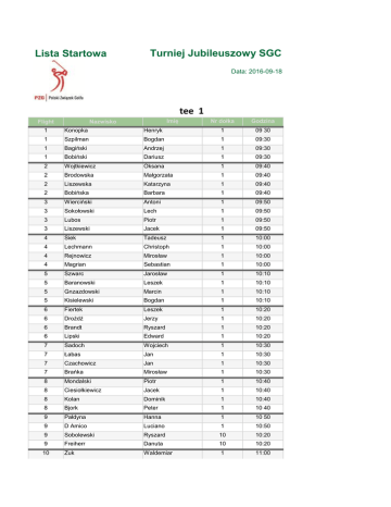 Lista Startowa Turniej Jubileuszowy SGC Data: 2016-09-18 tee 1 Nr dołka Godzina 1 Konopka Henryk 1 09 30 1 Szpilman Bogdan 1 09:30 1 Bagiński Andrzej 1 09:30 1 Bobiński Dariusz 1 09:30 2 Wojtkiewicz Oksana 1 09:40 2 Brodowska Małgorzata 1 09:40 2 Liszewska Katarzyna 1 09:40 2 Bobińska Barbara 1 09:40 3 Wierciński Antoni 1 09:50 3 Sokołowski Lech 1 09:50 3 Lubos Piotr 1 09:50 3 Liszewski Jacek 1 09:50 4 Siek Tadeusz 1 10:00 4 Lechmann Christoph 1 10:00 4 Rejnowicz Mirosław 1 10:00 4 Magrian Sebastian 1 10:00 5 Szwarc Jarosław 1 10:10 5 Baranowski Leszek 1 10:10 5 Gnzazdowski Marcin 1 10:10 5 Kisielewski Bogdan 1 10:10 6 Fiertek Leszek 1 10:20 6 Drożdż Jerzy 1 10:20 6 Brandt Ryszard 1 10:20 6 Lipski Edward 1 10:20 7 Sadoch Wojciech 1 10:30 7 Łabas Jan 1 10:30 7 Czachowicz Jan 1 10:30 7 Brańka Mirosław 1 10:30 8 Mondalski Piotr 1 10:40 8 Ciesiołkiewicz Jacek 1 10:40 8 Kolan Dominik 1 10:40 8 Bjork Peter 1 10 40 9 Pałdyna Hanna 1 10 50 9 D Amico Luciano 1 10:50 9 Sobolewski Ryszard 10 10:20 9 Freiherr Danuta 10 10:20 10 Zuk Waldemiar 1 11:00 Flight Imię Nazwisko 10 Kwidzyńkii Edmund 1 11:00 10 Wilandt Wiktor 1 11:00 10 Prus Wojciech 1 11:00 11 Orzechowski Wiesłąw 1 11:10 11 Lejderman Richard 1 11:10 11 Domosławski Mirosław 1 11:10 11 Domosławska Beata 1 11:10 12 Sadoch Daniel 1 11:20 12 Powszuk Piotr 1 11:20 12 Powszuk Maks 1 11:20 12 Ciesiołkiewicz Marta 1 11:20 Nr dołka Godzina Tee 10 Flight Imię Nazwisko 13 Regliński Andrzej 10 10:00 13 Orliński Mariusz 10 10:00 13 Nowak Jan 10 10:00 13 Giełdoń Kazimierz 10 10:00 14 Rydzkowska Anna 10 10:10 14 Giełdoń Lucyna 10 10:10 14 Stanzecka Zofia 10 10:10 14 Muddmann Anna 10 10:10 15 Ciesiołkiewicz Katarzyna 10 10:20 15 Pietraszko Teresa 10 10:20 15 Pitraszko Zdzisław 10 10 50 15 Karnikowska Dorota 10 10:50 16 Malepszy Piotr 10 10:30 16 Malepszy Sławomir 10 10:30 16 Muddmann Carlo 10 10:30 16 Kowalczykowska Bożena 10 10:30 17 Kiczka Adam 10 10:40 17 Szrubkowska Małgorzata 10 10:40 17 Szmidt Marcin 10 10:40 17 Pienczewski Marian 10 10:40 18 Szpilman Marzena 10 10:50 18 Pohl Mieczysław 10 10:50 18 Starczewski Andrzej 10 10:50 18 Cebula Jawińska Renata 10 10:50 ,
