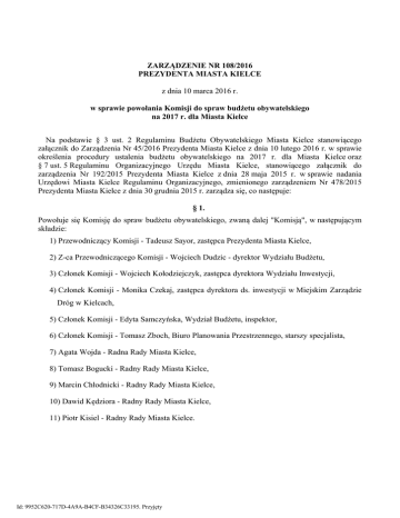 ZARZĄDZENIE NR 108/2016 PREZYDENTA MIASTA KIELCE z dnia 10 marca 2016 r. w sprawie powołania Komisji do spraw budżetu obywatelskiego na 2017 r. dla Miasta Kielce Na podstawie § 3 ust. 2 Regulaminu Budżetu Obywatelskiego Miasta Kielce stanowiącego załącznik do Zarządzenia Nr 45/2016 Prezydenta Miasta Kielce z dnia 10 lutego 2016 r. w sprawie określenia procedury ustalenia budżetu obywatelskiego na 2017 r. dla Miasta Kielce oraz § 7 ust. 5 Regulaminu Organizacyjnego Urzędu Miasta Kielce, stanowiącego załącznik do zarządzenia Nr 192/2015 Prezydenta Miasta Kielce z dnia 28 maja 2015 r. w sprawie nadania Urzędowi Miasta Kielce Regulaminu Organizacyjnego, zmienionego zarządzeniem Nr 478/2015 Prezydenta Miasta Kielce z dnia 30 grudnia 2015 r. zarządza się, co następuje: § 1. Powołuje się Komisję do spraw budżetu obywatelskiego, zwaną dalej "Komisją", w następującym składzie: 1) Przewodniczący Komisji - Tadeusz Sayor, zastępca Prezydenta Miasta Kielce, 2) Z-ca Przewodniczącego Komisji - Wojciech Dudzic - dyrektor Wydziału Budżetu, 3) Członek Komisji - Wojciech Kołodziejczyk, zastępca dyrektora Wydziału Inwestycji, 4) Członek Komisji - Monika Czekaj, zastępca dyrektora ds. inwestycji w Miejskim Zarządzie Dróg w Kielcach, 5) Członek Komisji - Edyta Samczyńska, Wydział Budżetu, inspektor, 6) Członek Komisji - Tomasz Zboch, Biuro Planowania Przestrzennego, starszy specjalista, 7) Agata Wojda - Radna Rady Miasta Kielce, 8) Tomasz Bogucki - Radny Rady Miasta Kielce, 9) Marcin Chłodnicki - Radny Rady Miasta Kielce, 10) Dawid Kędziora - Radny Rady Miasta Kielce, 11) Piotr Kisiel - Radny Rady Miasta Kielce. Id: 9952C620-717D-4A9A-B4CF-B34326C33195. Przyjęty § 2. 1. Komisja obraduje na posiedzeniach zwoływanych, prowadzonych i zamykanych przez Przewodniczącego Komisji, a w przypadku nieobecności lub niemożności pełnienia funkcji przez Przewodniczącego, jego obowiązki pełni Zastępca Przewodniczącego Komisji. 2. Pracami Komisji kieruje Przewodniczący Komisji. 3. W pracach Komisji mogą uczestniczyć inne osoby zaproszone przez Przewodniczącego Komisji lub Zastępcę Przewodniczącego Komisji. § 3. Zadania Komisji określa Regulamin Budżetu Obywatelskiego Miasta Kielce stanowiący załącznik do zarządzenia Nr 45/2016 Prezydenta Miasta Kielce z dnia 10 lutego 2016 r. w sprawie określenia procedury ustalenia budżetu obywatelskiego na 2017 r. dla Miasta Kielce. § 4. Zobowiązuję się kierowników komórek organizacyjnych Urzędu Miasta oraz kierowników miejskich jednostek organizacyjnych do współdziałania oraz udzielania niezbędnej pomocy we wszelkich sprawach związanych z zakresem zadań Komisji, a pozostających we właściwości danej komórki bądź jednostki. § 5. Wykonanie zarządzenia powierza się Zastępcy Prezydenta Miasta Kielce, Panu Tadeuszowi Sayorowi. § 6. Zarządzenie wchodzi w życie z dniem podpisania. Id: 9952C620-717D-4A9A-B4CF-B34326C33195. Przyjęty