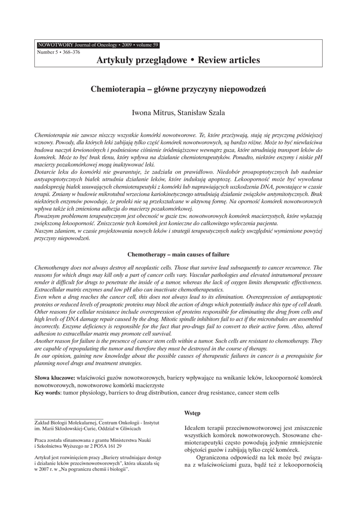 NOWOTWORY Journal of Oncology • 2009 • volume 59 Number 5 • 368–376 Artykuły przeglądowe • Review articles Chemioterapia – główne przyczyny niepowodzeń Iwona Mitrus, Stanisław Szala Chemioterapia nie zawsze niszczy wszystkie komórki nowotworowe. Te, które przeżywają, stają się przyczyną późniejszej wznowy. Powody, dla których leki zabijają tylko część komórek nowotworowych, są bardzo różne. Może to być niewłaściwa budowa naczyń krwionośnych i podniesione ciśnienie śródmiąższowe wewnątrz guza, które utrudniają transport leków do komórek. Może to być brak tlenu, który wpływa na działanie chemioterapeutyków. Ponadto, niektóre enzymy i niskie pH macierzy pozakomórkowej mogą inaktywować leki. Dotarcie leku do komórki nie gwarantuje, że zadziała on prawidłowo. Niedobór proapoptotycznych lub nadmiar antyapoptotycznych białek utrudnia działanie leków, które indukują apoptozę. Lekooporność może być wywołana nadekspresją białek usuwających chemioterapeutyki z komórki lub naprawiających uszkodzenia DNA, powstające w czasie terapii. Zmiany w budowie mikrotubul wrzeciona kariokinetycznego utrudniają działanie związków antymitotycznych. Brak niektórych enzymów powoduje, że proleki nie są przekształcane w aktywną formę. Na oporność komórek nowotworowych wpływa także ich zmieniona adhezja do macierzy pozakomórkowej. Poważnym problemem terapeutycznym jest obecność w guzie tzw. nowotworowych komórek macierzystych, które wykazują zwiększoną lekooporność. Zniszczenie tych komórek jest konieczne do całkowitego wyleczenia pacjenta. Naszym zdaniem, w czasie projektowania nowych leków i strategii terapeutycznych należy uwzględnić wymienione powyżej przyczyny niepowodzeń. Chemotherapy – main causes of failure Chemotherapy does not always destroy all neoplastic cells. Those that survive lead subsequently to cancer recurrence. The reasons for which drugs may kill only a part of cancer cells vary. Vascular pathologies and elevated intratumoral pressure render it difficult for drugs to penetrate the inside of a tumor, whereas the lack of oxygen limits therapeutic effectiveness. Extracellular matrix enzymes and low pH also can inactivate chemotherapeutics. Even when a drug reaches the cancer cell, this does not always lead to its elimination. Overexpression of antiapoptotic proteins or reduced levels of proaptotic proteins may block the action of drugs which potentially induce this type of cell death. Other reasons for cellular resistance include overexpression of proteins responsible for eliminating the drug from cells and high levels of DNA damage repair caused by the drug. Mitotic spindle inhibitors fail to act if the microtubules are assembled incorrectly. Enzyme deficiency is responsible for the fact that pro-drugs fail to convert to their active form. Also, altered adhesion to extracellular matrix may promote cell survival. Another reason for failure is the presence of cancer stem cells within a tumor. Such cells are resistant to chemotherapy. They are capable of repopulating the tumor and therefore they must be destroyed in the course of therapy. In our opinion, gaining new knowledge about the possible causes of therapeutic failures in cancer is a prerequisite for planning novel drugs and treatment strategies. Słowa kluczowe: właściwości guzów nowotworowych, bariery wpływające na wnikanie leków, lekooporność komórek nowotworowych, nowotworowe komórki macierzyste Key words: tumor physiology, barriers to drug distribution, cancer drug resistance, cancer stem cells Wstęp Zakład Biologii Molekularnej, Centrum Onkologii - Instytut im. Marii Skłodowskiej-Curie, Oddział w Gliwicach Praca została sfinansowana z grantu Ministerstwa Nauki i Szkolnictwa Wyższego nr 2 PO5A 161 29 Artykuł jest rozwinięciem pracy „Bariery utrudniające dostęp i działanie leków przeciwnowotworowych”, która ukazała się w 2007 r. w „Na pograniczu chemii i biologii”. Ideałem terapii przeciwnowotworowej jest zniszczenie wszystkich komórek nowotworowych. Stosowane chemioterapeutyki często powodują jedynie zmniejszenie objętości guzów i zabijają tylko część komórek. Ograniczona odpowiedź na lek może być związana z właściwościami guza, bądź też z lekoopornością 369 komórek. Pierwszym problemem jest słaby dostęp leku do niektórych komórek guza. Spadek aktywności leków może być spowodowany niewystarczającą ilością tlenu lub obniżonym pH wewnątrz guza [1-3]. Lekooporność komórek nowotworowych może być związana z pojawiającymi się w nich mutacjami bądź nadekspresją niektórych białek [4]. Dodatkowym problemem jest obecność w guzie nowotworowych komórek macierzystych, które są bardzo oporne na terapię, a po zakończeniu leczenia powodują ponowny wzrost guza [5-7]. W artykule omówiono wybrane problemy związane z dostępem i działaniem leków na komórki nowotworowe. Właściwości guzów litych Guzy nowotworowe są nie tylko zbiorowiskiem komórek nowotworowych [1, 8, 9]. W guzach znajdują się także naczynia krwionośne, limfatyczne, komórki układu odpornościowego, fibroblasty oraz macierz pozakomórkowa. Tworzą one razem swoiste mikrośrodowisko, które odgrywa ważną rolę w progresji nowotworowej, przerzutowaniu, ucieczce spod nadzoru immunologicznego. Mikrośrodowisko to ma wpływ na dostępność leków do komórek nowotworowych, a także na ich działanie w komórkach nowotworowych. Unaczynienie guza nowotworowego W czasie swojego wzrostu guz nowotworowy wytwarza własne naczynia krwionośne oraz limfatyczne [10, 11]. W przeciwieństwie do naczyń prawidłowych naczynia nowotworowe są nieszczelne, kręte, zawierają liczne przewężenia, ślepe zakończenia, itp. Ilość naczyń jest dużo mniejsza w centralnych rejonach guza niż na jego obrzeżach. Nieprawidłowa budowa naczyń powoduje spowolnienie przepływu i zaleganie krw