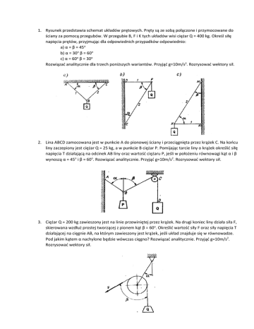 1. Rysunek przedstawia schemat układów prętowych. Pręty są ze sobą połączone i przymocowane do ściany za pomocą przegubów. W przegubie B, F i K tych układów wisi ciężar Q = 400 kg. Określ siłę napięcia prętów, przyjmując dla odpowiednich przypadków odpowiednio: a) α = β = 45o b) α = 30o β = 60o c) α = 60o β = 30o Rozwiązać analitycznie dla trzech poniższych wariantów. Przyjąć g=10m/s2. Rozrysować wektory sił. 2. Lina ABCD zamocowana jest w punkcie A do pionowej ściany i przeciągnięta przez krążek C. Na końcu liny zaczepiony jest ciężar Q = 25 kg, a w punkcie B ciężar P. Pomijając tarcie liny o krążek określić siłę napięcia T działającą na odcinek AB liny oraz wartość ciężaru P, jeśli w położeniu równowagi kąt α i β wynoszą α = 45o i β = 60o. Rozwiązać analitycznie. Przyjąć g=10m/s2. Rozrysować wektory sił. 3. Ciężar Q = 200 kg zawieszony jest na linie przewiniętej przez krążek. Na drugi koniec liny działa siła F, skierowana wzdłuż prostej tworzącej z pionem kąt β = 60o. Określić wartość siły F oraz siły napięcia T działającej na cięgnie AB, na którym zawieszony jest krążek, jeśli układ znajduje się w równowadze. Pod jakim kątem α nachylone będzie wówczas cięgno? Rozwiązać analitycznie. Przyjąć g=10m/s2. Rozrysować wektory sił. 4. Kulka B o ciężarze P = 120 kg, wisząca na nici AB umocowana nieruchomo w punkcie A, opiera się o powierzchnię gładkiej kuli o promieniu r = 0,5 m; odległość punktu A od powierzchni kuli AC = 2 m, długość nici AB = 1 m, prosta CA jest pionowa. Wyznaczyć siłę T w nici i reakcję Q powierzchni kulistej. Promień kulki pominąć. Rozrysować i obliczyć analitycznie. Przyjąć g=10m/s2. Odpowiedzi: 1. a) S1 = S2 = 2828,4N, b) S1 = 2309,4N S2 = 4618,8N c) S1 = 2309,4N S2 = 4618,8N 2.T = 306,19 N, P = 341,5N 3. F = 2000N, T = 3464,1N 4. T = 480N, Q = 240N