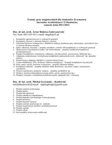 Tematy prac magisterskich dla studentów II semestru kierunku Architektura i Urbanistyka semestr letni 2011/2012 Doc. dr inż. arch. Artur Buława-Gabryszewski Tel. kom. 603-185-431 e-mail: [email protected] 1. Kompleksy agroturystyczne w wybranych gminach. 2. Kompleksy biurowe o złożonej funkcji w mieście. 3. Założenia hotelowe wzbogacone o dodatkowe funkcje (konferencyjne, rekreacyjne, rozrywkowe itp.) w mieście lub poza miastem. 4. Sport, rekreacja, turystyka – projekty ośrodków, centrów lub kompleksów w wybranych gminach. 5. Budownictwo mieszkaniowe jedno- lub wielorodzinne – projekty osiedli lub kompleksów proekologicznych.. 6. Projekty kompleksów związanych z edukacją i oświatą (szkoły, uniwersytety, biblioteki itp.). 7. Adaptacja, modernizacja i rewitalizacja kompleksów poprzemysłowych, „bokowisk” itp. (projekty loftów). 8. Konserwacja i adaptacja obiektów o wartości historycznej. 9. Centra rehabilitacji, SPA, Wellness, Odnowa biologiczna – Projekty kompleksów leczniczych. 10. Kina, teatry, muzea, pawilony wystawowe – projekty obiektów kultury. 11. Kompleksy sakralne – projekty obiektów kultu (kościołów, meczetów, kaplic, krematoriów, cmentarzy). 12. Dworce autobusowe, kolejowe, lotnicze – projekty aeroklubów itp. 13. Hotele o złożonej infrastrukturze (stacje paliw, serwis, gastronomia itp.) 14. Projekty związane z architekturą krajobrazu (parki, aquaparki itp.) i rekreacją. Doc. dr inż. arch. Michał Grzymała – Kazłowski [email protected] [email protected] 1. 2. 3. 4. 5. 6. 7. 8. 9. 10 11. 12. Projekt centrum medycznego Projekt hotelu Projekt hali sportowej Projekt zabudowy uzupełniającej Projekt budynku mieszkalnego wielorodzinnego Projekt biurowca Projekt basenów krytych Projekt centrum sportowego ew. stadionu Projekt modernizacji obiektów architektonicznych Projekt szpitala Projekt szkoły Inne projekty użyteczności publicznej Prof. dr inż. arch. Zygmunt Hofman Tel. Kom. 602-656-161 1. Obiekty rekreacyjne i sportowe: Ośrodki rekreacyjne (nadwodne, górskie, SPA itp.) lokalizowane w atrakcyjnym kontekście krajobrazowym; Hotele miejskie; Ośrodki rekreacyjno – sportowe, także specjalistyczne ( np. centrum nurkowe); Aquaparki. 2. Obiekty edukacyjne i naukowe: Szkoły różnego typu; Wyższe uczelnie; Biblioteki; Instytucje naukowe i laboratoria. 3. Obiekty kulturalne: Muzea i galerie; Domy kultury; Ośrodki kultury innych państw w Polsce; Informatoria. 4. Obiekty administracji i urzędy: Ratusze; Sądy; Ambasady. 5. Obiekty mieszkaniowe: Zabudowa jednorodzinna różnych typów; Zabudowa wielorodzinna – pojedyncze obiekty( w tym wysokościowe) i zespoły mieszkaniowe. 6. Tematy indywidualne – zaproponowane przez dyplomanta. W pracach dyplomowych szczególny nacisk będzie położony na analizę kontekstu przestrzennego i kulturowego oraz uwzględnienie problematyki rozwoju zrównoważonego. Doc. dr inż. arch. Ewa Krzyżanowska tel: 22-810-02-23 (godz. 8.00 – 10.00) 1. Projekt zespołu domów jednorodzinnych wraz z usługami projektowany według zasad New Urbanism, na wybranej przez studenta lokalizacji. 2. Rewaloryzacja terenów osiedlowych wraz z istniejącą zabudową mieszkalną wielorodzinną. 3. Projekt szkoły podstawowej / liceum na wybranej lokalizacji. 4. Adaptacja historycznej tkanki miejskiej, projekt budynku mieszkalnego, wielorodzinnego z usługami w parterze (plomba). 5. Adaptacja istniejącego budynku po przemysłowego na nowe funkcje. 6. Projekt schroniska górskiego dla wybranej lokalizacji. 7. Projekt biblioteki miejskiej dla wybranej lokalizacji. 8. Projekt ośrodka handlowo – usługowego dla wybranej lokalizacji. 9. Dowolny temat zaproponowany przez dyplomanta do uzgodnienia z prowadzącym dyplom Prof. dr hab. Jakub A. Lewicki Kontakt w uzasadnionych przypadkach – 509-436-048 (nie dotyczy zaległych zaliczeń). Konsultacje: mgr inż. arch. Andrzej Miklaszewski Tematy obejmują wzorcowe projekty mieszkaniowe, projekty rewaloryzacji zabytków, kamienic, pałaców, budynków poprzemysłowych, fabryk, nadbudowy i adaptacje zabytków, plomby w zabytkowej zabudowie. Projekt wykonany w duchu współczesnym z precyzyjną analizą historycznej zabudowy i jej wartości. Projekt różni się od projektu inżynierskiego zakresem analiz projektowych i teoretycznych. 1. Projekt wzorcowego budynku mieszkalnego dla Mazowsza w oparciu o przykłady architektury regionu. 2. Projekt wzorcowego budynku mieszkalnego dla zabytkowego małego miasta na Mazowszu (np. Czerwińsk, Zakroczym itp.) w oparciu o przykłady regionalnej architektury. 3. Projekt wzorcowego budynku mieszkalnego dla zabytkowego średniego miasta na Mazowszu (np. Płock, Skierniewice, Radom itp.) w oparciu o regionalnej przykłady architektury. 4. Projekt wzorcowego budynku użyteczności publicznej dla Mazowsza w oparciu o przykłady architektury regionu. 5. Projekt wzorcowego budynku użyteczności publicznej dla małego miasta na Mazowszu (np. Czerwińsk, Zakroczym itp.) w oparciu o przykłady regionalnej architektury. 6. Projekt wzorcowego budynku użyteczności publicznej dla zabytkowego średniego miasta na Mazowszu (np. Płock, Skierniewice, Radom itp.) w oparciu o regionalnej przykłady architektury. 7. Projekt nowego budynku (plomba) w zabytkowej zabudowie dla małego miasta na Mazowszu (np. Czerwińsk, Zakroczym itp.). 8. Projekt nowego budynku (plomba) dla zabytkowego średniego miasta na Mazowszu (np. Płock, Skierniewice, Radom itp.). 9. Projekt nowego budynku (plomba) w zabytkowej zabudowie – wybrany przez studenta rejon w Warszawie lub okolicach. 10. Projekt rewaloryzacji i adaptacji zabytkowego budynku dla małego miasta na Mazowszu (np. Czerwińsk, Zakroczym itp.). 11. Projekt rewaloryzacji i adaptacji zabytkowego budynku dla średniego miasta na Mazowszu (np. Płock, Skierniewice, Radom itp.). 12. Projekt rewaloryzacji i adaptacji zabytkowego budynku – wybrany przez studenta rejon w Warszawie lub okolicach. 13. Pr