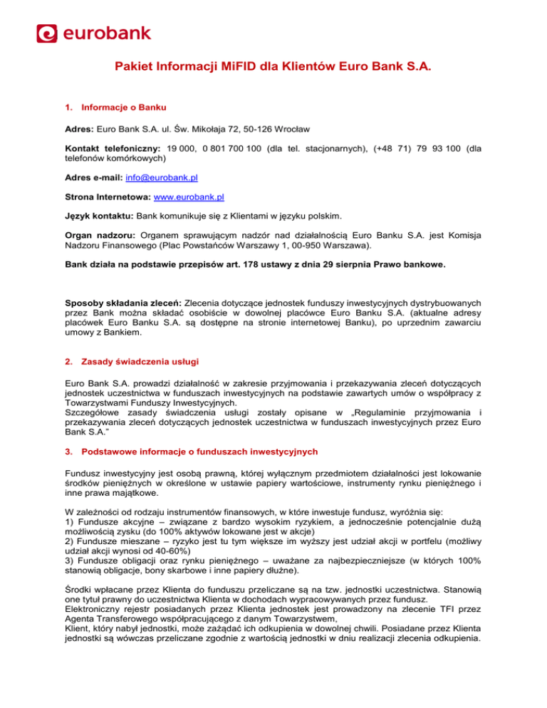 Pakiet Informacji MiFID dla Klientów Euro Bank S.A. 1. Informacje o Banku Adres: Euro Bank S.A. ul. Św. Mikołaja 72, 50-126 Wrocław Kontakt telefoniczny: 19 000, 0 801 700 100 (dla tel. stacjonarnych), (+48 71) 79 93 100 (dla telefonów komórkowych) Adres e-mail: [email protected] Strona Internetowa: www.eurobank.pl Język kontaktu: Bank komunikuje się z Klientami w języku polskim. Organ nadzoru: Organem sprawującym nadzór nad działalnością Euro Banku S.A. jest Komisja Nadzoru Finansowego (Plac Powstańców Warszawy 1, 00-950 Warszawa). Bank działa na podstawie przepisów art. 178 ustawy z dnia 29 sierpnia Prawo bankowe. Sposoby składania zleceń: Zlecenia dotyczące jednostek funduszy inwestycyjnych dystrybuowanych przez Bank można składać osobiście w dowolnej placówce Euro Banku S.A. (aktualne adresy placówek Euro Banku S.A. są dostępne na stronie internetowej Banku), po uprzednim zawarciu umowy z Bankiem. 2. Zasady świadczenia usługi Euro Bank S.A. prowadzi działalność w zakresie przyjmowania i przekazywania zleceń dotyczących jednostek uczestnictwa w funduszach inwestycyjnych na podstawie zawartych umów o współpracy z Towarzystwami Funduszy Inwestycyjnych. Szczegółowe zasady świadczenia usługi zostały opisane w „Regulaminie przyjmowania i przekazywania zleceń dotyczących jednostek uczestnictwa w funduszach inwestycyjnych przez Euro Bank S.A.” 3. Podstawowe informacje o funduszach inwestycyjnych Fundusz inwestycyjny jest osobą prawną, której wyłącznym przedmiotem działalności jest lokowanie środków pieniężnych w określone w ustawie papiery wartościowe, instrumenty rynku pieniężnego i inne prawa majątkowe. W zależności od rodzaju instrumentów finansowych, w które inwestuje fundusz, wyróżnia się: 1) Fundusze akcyjne – związane z bardzo wysokim ryzykiem, a jednocześnie potencjalnie dużą możliwością zysku (do 100% aktywów lokowane jest w akcje) 2) Fundusze mieszane – ryzyko jest tu tym większe im wyższy jest udział akcji w portfelu (możliwy udział akcji wynosi od 40-60%) 3) Fundusze obligacji oraz rynku pieniężnego – uważane za najbezpieczniejsze (w których 100% stanowią obligacje, bony skarbowe i inne papiery dłużne). Środki wpłacane przez Klienta do funduszu przeliczane są na tzw. jednostki uczestnictwa. Stanowią one tytuł prawny do uczestnictwa Klienta w dochodach wypracowywanych przez fundusz. Elektroniczny rejestr posiadanych przez Klienta jednostek jest prowadzony na zlecenie TFI przez Agenta Transferowego współpracującego z danym Towarzystwem, Klient, który nabył jednostki, może zażądać ich odkupienia w dowolnej chwili. Posiadane przez Klienta jednostki są wówczas przeliczane zgodnie z wartością jednostki w dniu realizacji zlecenia odkupienia. Terminy realizacji zleceń dotyczących jednostek funduszy inwestycyjnych są określone w prospektach informacyjnych poszczególnych funduszy. Zasady funkcjonowania danego funduszu inwestycyjnego określone są w jego prospekcie informacyjnym oraz stanowiącym integralną część prospektu statucie funduszu. W Polsce jedynymi podmiotami uprawnionymi do zarządzania funduszami są Towarzystwa Funduszy Inwestycyjnych (TFI). 4. Ryzyko związane z inwestowaniem w fundusze Inwestycja w fundusze związana jest z ryzykiem. Klient lokując środki, nie ma gwarancji zainwestowanego kapitału. Ryzyko inwestycji w fundusze może mieć różnoraki charakter, np.: 1) ryzyko rynkowe – wynikające z faktu, że ceny papierów wartościowych podlegają ogólnym tendencjom rynkowym w kraju i na świecie. 2) ryzyko kredytowe – wynikające z możliwości niewywiązania się emitenta ze zobowiązań wynikających z emisji danego instrumentu finansowego wchodzącego w skład portfela funduszu. 3) ryzyko kursowe (walutowe) wynikające z możliwości niekorzystnej zmiany kursu walut. 4) ryzyko płynności – związane z brakiem możliwości nabycia lub zbycia danego instrumentu finansowego w krótkim czasie bez istotnego wpływu na jego cenę. 5) ryzyko stopy procentowej – wynikające z możliwości zmiany stopy procentowej wpływającej na obniżenie wartości instrumentów finansowych portfela funduszu. Szczegółowe informacje dotyczące wszystkich ryzyk znajdują się Prospektach Informacyjnych i Skrótach prospektów poszczególnych funduszy. 5. Opłaty Klient ponosi koszty opłat należnych Towarzystwu Funduszy Inwestycyjnych z tytułu realizacji transakcji zlecanych przez Klienta, zgodnie z zasadami określonymi w Prospektach Informacyjnych Funduszy i Skrótach prospektów. Prospekty oraz ich skrótach udostępnione są w placówkach Banku. 6. Klasyfikacja Klientów Zgodnie z postanowieniami dyrektywy MiFID, Bank jest zobowiązany do klasyfikowania Klientów chcących za pośrednictwem Banku składać zlecenia dotyczące jednostek funduszy inwestycyjnych. Klasyfikacja przeprowadzana jest przed zawarciem z Klientem Umowy o przyjmowanie i przekazywanie zleceń dotyczących jednostek uczestnictwa w funduszach inwestycyjnych. Klienci Euro Banku S.A. mogą zostać zaklasyfikowani do jednej z poniższych kategorii: Klienci Profesjonalni – Klienci posiadający odpowiednią wiedzę i doświadczenie, które są niezbędne do podejmowania decyzji i oceny ryzyka związanego z wybranymi funduszami inwestycyjnymi, który jest jednym z podmiotów wskazanych w art. 3 pkt. 39b) Ustawy o obrocie instrumentami finansowymi. Klienci Detaliczni – Klienci nienależący do grupy Klientów profesjonalnych nieposiadający doświadczenia ani wiedzy tak szerokiej jak Klient Profesjonalny. Klient Detaliczny jest objęty najwyższym stopniem ochrony polegającym przede wszystkim na przekazywaniu Klientowi informacji wskazanych w rozporządzeniach wykonawczych do Ustawy o obrocie. W celu zapewnienia Klientom najwyższego poziomu ochrony, wszyscy Klienci składający zlecenia za pośrednictwem Euro Banku S.A. klasyfikowani są jako Klienci Detaliczni. Klient w każdej 