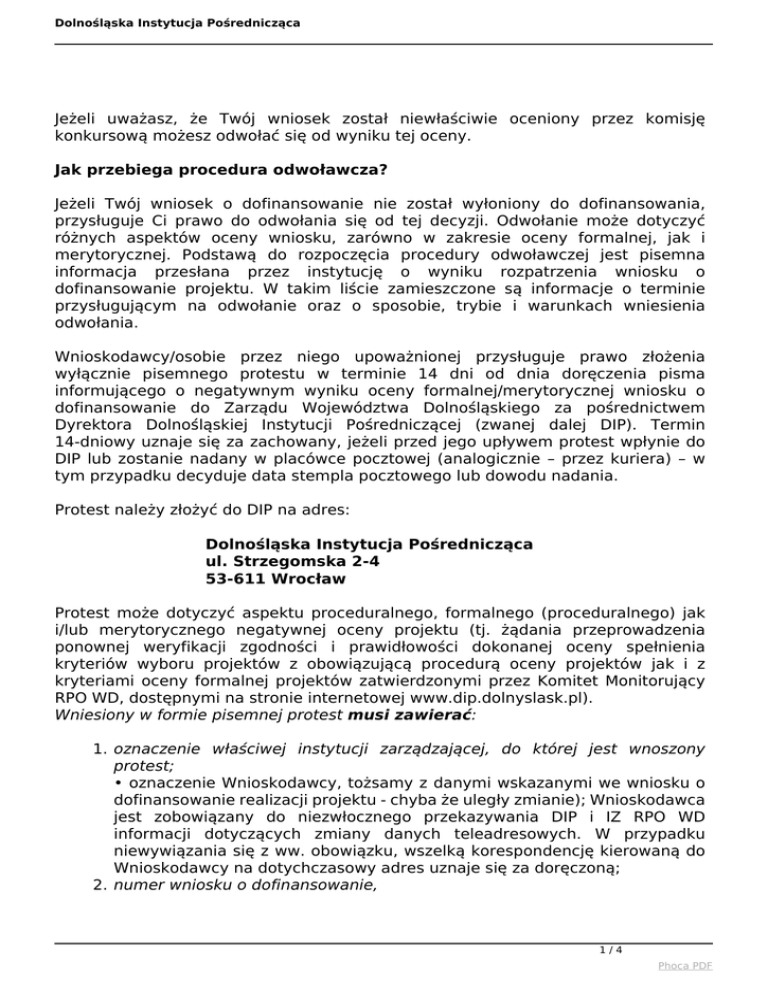 Dolnośląska Instytucja Pośrednicząca Jeżeli uważasz, że Twój wniosek został niewłaściwie oceniony przez komisję konkursową możesz odwołać się od wyniku tej oceny. Jak przebiega procedura odwoławcza? Jeżeli Twój wniosek o dofinansowanie nie został wyłoniony do dofinansowania, przysługuje Ci prawo do odwołania się od tej decyzji. Odwołanie może dotyczyć różnych aspektów oceny wniosku, zarówno w zakresie oceny formalnej, jak i merytorycznej. Podstawą do rozpoczęcia procedury odwoławczej jest pisemna informacja przesłana przez instytucję o wyniku rozpatrzenia wniosku o dofinansowanie projektu. W takim liście zamieszczone są informacje o terminie przysługującym na odwołanie oraz o sposobie, trybie i warunkach wniesienia odwołania. Wnioskodawcy/osobie przez niego upoważnionej przysługuje prawo złożenia wyłącznie pisemnego protestu w terminie 14 dni od dnia doręczenia pisma informującego o negatywnym wyniku oceny formalnej/merytorycznej wniosku o dofinansowanie do Zarządu Województwa Dolnośląskiego za pośrednictwem Dyrektora Dolnośląskiej Instytucji Pośredniczącej (zwanej dalej DIP). Termin 14-dniowy uznaje się za zachowany, jeżeli przed jego upływem protest wpłynie do DIP lub zostanie nadany w placówce pocztowej (analogicznie – przez kuriera) – w tym przypadku decyduje data stempla pocztowego lub dowodu nadania. Protest należy złożyć do DIP na adres: Dolnośląska Instytucja Pośrednicząca ul. Strzegomska 2-4 53-611 Wrocław Protest może dotyczyć aspektu proceduralnego, formalnego (proceduralnego) jak i/lub merytorycznego negatywnej oceny projektu (tj. żądania przeprowadzenia ponownej weryfikacji zgodności i prawidłowości dokonanej oceny spełnienia kryteriów wyboru projektów z obowiązującą procedurą oceny projektów jak i z kryteriami oceny formalnej projektów zatwierdzonymi przez Komitet Monitorujący RPO WD, dostępnymi na stronie internetowej www.dip.dolnyslask.pl). Wniesiony w formie pisemnej protest musi zawierać: 1. oznaczenie właściwej instytucji zarządzającej, do której jest wnoszony protest; • oznaczenie Wnioskodawcy, tożsamy z danymi wskazanymi we wniosku o dofinansowanie realizacji projektu - chyba że uległy zmianie); Wnioskodawca jest zobowiązany do niezwłocznego przekazywania DIP i IZ RPO WD informacji dotyczących zmiany danych teleadresowych. W przypadku niewywiązania się z ww. obowiązku, wszelką korespondencję kierowaną do Wnioskodawcy na dotychczasowy adres uznaje się za doręczoną; 2. numer wniosku o dofinansowanie, 1/4 Phoca PDF Dolnośląska Instytucja Pośrednicząca 3. wskazanie wszystkich kryteriów wyboru projektów, z których oceną Wnioskodawca się nie zgadza, wraz z uzasadnieniem; 4. wskazanie zarzutów o charakterze proceduralnym w zakresie przeprowadzonej oceny, jeżeli zdaniem Wnioskodawcy naruszenie takie miały miejsce, wraz z uzasadnieniem; 5. podpis Wnioskodawcy lub osoby upoważnionej do jego reprezentowania (jeśli we wniosku o dofinansowania brak upoważnienia kopia upoważnienia musi być złożona do protestu), z załączeniem oryginału lub kopii dokumentu poświadczającego umocowanie takiej osoby do reprezentowania Wnioskodawcy. Ponadto protest powinien zawierać: numer działania, schematu i podschematu, w ramach którego wniosek został złożony; w tytule lub w treści pisma powinno pojawić się słowo „protest”; wskazanie dowodów uzasadniających i potwierdzających ww. żądanie; Wszystkie zarzuty Wnioskodawcy powinny zostać ujęte w jednym proteście. Jeżeli, zdaniem Wnioskodawcy, ocena projektu została przeprowadzona niezgodnie z więcej niż jednym kryterium oceny, w proteście należy wskazać wszystkie te kryteria. Wnioskodawca ma prawo do wnoszenia (na zasadach, trybie, sposobie i warunkach jak dla protestu) uzupełnień do złożonego protestu, w tym wyłącznie w terminie właściwym na wniesienie protestu. W przypadku, gdy kwota przeznaczona na dofinansowanie projektów w konkursie nie wystarcza na wybranie projektu do dofinansowania okoliczność ta nie może stanowić wyłącznej przesłanki wniesienia protestu. Protest nie będzie podlegał rozpatrzeniu, jeżeli zostanie złożony: 1. po terminie, 2. przez podmiot wykluczony z możliwości otrzymania dofinansowania, 3. bez wskazania kryteriów wyboru projektów, z których oceną Wnioskodawca się nie zgadza, wraz z uzasadnieniem. Ponadto nie podlega rozpatrzeniu protest powtórnie wniesiony przez Wnioskodawcę od tego samego kryterium oceny w wyniku ponownej negatywnej oceny projektu przeprowadzonej w efekcie uprzednio wniesionego i uwzględnionego protestu lub wycofania uprzednio wniesionego protestu (uwzględniając warunki dopuszczalności ponownego wniesienia protestu) lub wyroku sądu administracyjnego uznającego skargę za zasadną. W przypadku ponownej negatywnej oceny projektu przeprowadzonej w efekcie uprzednio wniesionego i uwzględnionego protestu lub w efekcie wyroku sądu 2/4 Phoca PDF Dolnośląska Instytucja Pośrednicząca administracyjnego uwzględniającego skargę za zasadną Wnioskodawcy, w terminie 14 dni od dnia otrzymania niniejszego pisma, przysługuje prawo wniesienia do sądu administracyjnego skargi, zgodnie z art. 3 § 3 ustawy z dnia 30 sierpnia 2002 r. Prawo o postępowaniu przed sądami administracyjnymi , na warunkach przewidzianych przepisem art. 61 ustawy z dnia 11 lipca 2014 r. o zasadach realizacji programów w zakresie polityki spójności finansowanych w perspektywie finansowej 2014-2020. Skargę należy wnieść bezpośrednio do Wojewódzkiego Sądu Administracyjnego we Wrocławiu, ul. Św. Mikołaja 78/79, 50-126 Wrocław, wraz z kompletną dokumentacją w sprawie, obejmującą wniosek o dofinansowanie wraz z informacją o wynikach oceny projektu, kopie wniesionych środków odwoławczych oraz informację o wynikach procedury odwoławczej. Skarga podlega opłacie sądowej. Nie odnosi się to do sytuacji gdy, zdaniem Wnioskoda