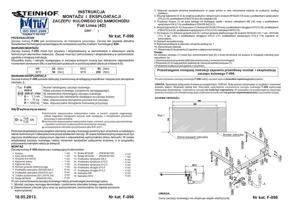 INSTRUKCJA MONTA¯U I EKSPLOATACJI ZACZEPU KULOWEGO DO SAMOCHODU: Fiat Linea (4D) (2007 - ®) Certyfikat 71 100 J 618 Nr kat. F-096 PRZEZNACZENIE Zaczep kulowy F-096 jest przeznaczony do holowania przyczepy. Zaczep ten posiada aktualne Œwiadectwo Homologacji uprawniaj¹ce do oznaczenia wyrobu znakiem homologacji E20. WARUNKI MONTA¯U Zaczep kulowy F-096 mo¿e byæ u¿ywany i eksploatowany w samochodzie o w³aœciwym stanie technicznym elementów nadwozia. Zaczep musi byæ zamontowany i eksploatowany w samochodzie zgodnie z niniejsz¹ instrukcj¹. Wszystkie œruby i nakrêtki wystêpuj¹ce w zaczepie kulowym musz¹ byæ dokrêcone odpowiednim momentem obrotowym (Mo) o wartoœciach podanych w poni¿szej tabeli (dla œrub w klasie 8.8): M8 25 (Nm) M12 85 (Nm) M10 50 (Nm) M16 - 200 (Nm) WARUNKI EKSPLOATACJI Zaczep kulowy F-096 posiada tabliczkê znamionow¹ okreœlaj¹c¹ prawid³owe i bezpieczne obci¹¿enie zaczepu, tj. : Typ: F-096 A50-X E20 55R-01 3164 D = 7,3 kN S = 75 kg R = 1200 kg Numer katalogowy zaczepu kulowego Klasa zaczepu kulowego (urz¹dzenia sprzêgaj¹cego) Nr œwiadectwa Homologacji zaczepu kulowego Teoretyczna si³a odniesienia dzia³aj¹ca na zaczep kulowy Max. dopuszczalne obci¹¿enie pionowe kuli zaczepu Max. dopuszczalne obci¹¿enie holowanej przyczepy 3. Wykonaæ wyciêcie otworów kwadratowych w pasie tylnym w celu udro¿nienia wejœcia do pod³u¿nic wed³ug szablonu. 4. Wsun¹æ k¹towniki (4, 5) do wnêtrza pod³u¿nic i skrêciæ luŸno œrubami M10x35 (10) wraz z podk³adkami sprê¿ystymi Ø10,2 (14), podk³adkami Ø30/Ø10,5x3 (8) i tulejkami (9). 5. Przy³o¿yæ korpus (1) do pasa tylnego na wystaj¹ce szpilki i skrêciæ nakrêtkami M8 (18) wraz z podk³adkami sprê¿ystymi Ø8,2 (13) i podk³adkami Ø24/Ø8,5x2,5 (7). 6. Skrêciæ k¹towniki (4, 5) z korpusem (1) œrubami M10x35 (10) wraz z podk³adkami okr¹g³ymi Ø10,5 (16), podk³adkami Ø30/Ø10,2x3 (8), podk³adkami sprê¿ystymi i Ø10,2 (14) i nakrêtkami M10 (19). 7. Do korpusu (1) dokrêciæ gniazdo kuli (3) i uchwyt gniazda elektrycznego (6) œrubami M12x30 (12) -1 szt. i M12x25 (11)- 3 szt. wraz z podk³adkami okr¹g³ymi Ø13,0 (17), podk³adkami sprê¿ystymi Ø12,2 (15) (zgodnie ze schematem). 8. Dokrêciæ wszystkie œruby. 9. Wykonaæ podciêcie w zderzaku od spodu wed³ug rys. 1. 10. Zamontowaæ zderzak. 11. Wpi¹æ kulê (2) do gniazda (3) zgodnie z za³¹czon¹ instrukcj¹. Uwaga: Do korpusu zaczepu (1) mo¿e byæ zamontowana kula (2) o innej konstrukcji ni¿ podano w niniejszej instrukcji pod warunkiem, ¿e: 1.Zastosowana kula posiada tabliczkê znamionow¹ z numerem homologacji. 2.Parametry D i S maj¹ wartoœæ wiêksz¹ lub równ¹ od wartoœci korpusu (1). 3.Po³o¿enia œrodka kuli jest zgodne z rysunkiem. Przestrzeganie niniejszej instrukcji zapewnia prawid³owy monta¿ i eksploatacjê zaczepu kulowego F-096. Po zamontowaniu zaczepu kulowego F-096 nale¿y uzyskaæ wpis w dowodzie rejestracyjnym pojazdu. UWAGA: Sprawdzaæ po³¹czenia œrubowe po przejechaniu 1000 km. Kulê zawsze utrzymywaæ w czystoœci i smarowaæ smarem sta³ym. Stosowaæ os³onê kuli. Wszystkie uszkodzenia mechaniczne zaczepu kulowego F-096 wykluczaj¹ dalsz¹ jego eksploatacjê. Uszkodzony zaczep nie mo¿e byæ naprawiany. W przypadku nie przestrzegania opisanego sposobu monta¿u lub niew³aœciwego jego u¿ytkowania producent nie ponosi odpowiedzialnoœci za powsta³e szkody. SCHEMAT MONTA¯U: 240 200 Si³ê D wylicza siê ze wzoru: Rys.1 110 D= gx TxR kN T+R T-technicznie dopuszczalna maksymalna masa, w tonach, pojazdu ci¹gn¹cego (tak¿e ci¹gników holuj¹cych) ³¹cznie, jeœli wystêpuje, z obci¹¿eniem pionowym przyczepy z osiê centraln¹. R-technicznie dopuszczalna maksymalna masa, w tonach, przyczepy samochodowej z dyszlem ruchomym w p³aszczyŸnie pionowej lub naczepy. g- przyspieszenie ziemskie (przyjmowane jako 9,81 m/s2) Podczas eksploatacji poszczególne elementy zaczepu kulowego powinny byæ utrzymane w nale¿ytym stanie technicznym i zabezpieczone przed dzia³aniem korozji. W czasie holowania przyczepa musi byæ z³¹czona dodatkowym elastycznym z³¹czem o odpowiedniej wytrzyma³oœci (linka, ³añcuch). W czasie eksploatacji zaczepu kulowego nale¿y okresowo sprawdzaæ po³¹czenia œrubowe, a w przypadku poluzowania nakrêtek nale¿y je dokrêciæ. MONTA¯ Zaczep kulowy F-096 sk³ada siê z nastêpuj¹cych elementów: - 1 szt. 1 szt. 1 szt. 1 szt. 1 szt. 1 szt. 6 szt. 6 szt. 2 szt. 6 szt. 11. Œruba M12x25 (PN/M-82105) 12. Œruba M12x30 (PN/M-82105) 13. Podk³adka sprê¿ysta Ø8,2 14. Podk³adka sprê¿ysta Ø10,2 15. Podk³adka sprê¿ysta Ø12,2 16. Podk³adka okr¹g³a Ø10,5 17. Podk³adka okr¹g³a Ø13,0 18. Nakrêtka M8 19. Nakrêtka M10 - Œrodek zderzaka Dolna krawêdŸ zderzaka 5 3 szt. 1 szt. 6 szt. 6 szt. 4 szt. 4 szt. 4 szt. 6 szt. 4 szt. 347,2 10 14 8 9 10 16 8 14 19 W celu zamontowania zaczepu kulowego nale¿y przestrzegaæ poni¿szego opisu: 1. Monta¿ zaczepu wymaga demonta¿u i podcinania zderzaka tylnego samochodu. 2. Zdemontowaæ zderzak tylny wraz ze wzmocnieniem (wzmocnienie nie bêdzie ponownie wykorzystane). Nr kat. F-096 11 15 17 11 15 17 3 18 13 7 UWAGA: 18.05.2013. 18 13 7 1 10 14 8 9 22 1. Korpus 2. Kula (ACS-3008) 3. Gniazdo kuli (ACS) 4. K¹townik prawy 5. K¹townik lewy 6. Uchwyt gniazda elektrycznego 7. Podk³adka specjalna Ø24/Ø8,5x2,5 8. Podk³adka specjalna Ø30/Ø10,5x3 9. Tulejka dystansowa Ø21,3/Ø16,7x6 10. Œruba M10x35 (PN/M-82105) 10 16 8 14 19 4 Cena zaczepu kulowego nie obejmuje wi¹zki elektrycznej. 2 6 12 15 17 Nr kat. F-096 TOW BAR FOR Fiat Linea (4D) (2007 - ®) FITTING AND OPERATION MANUAL Cat. No.F-096 DESTINATION Tow bar F-096 is designed for towing a trailer. This ball hook has a current certification of approval authorizing the product with E20 certification sign. FITTING CONDITIONS Tow bar F-096 can be used and operated in a car with proper technical conditions of body elements. Those parts cannot be mechanically damaged . The