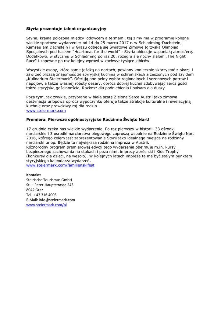 Styria prezentuje talent organizacyjny Styria, kraina położona między lodowcem a termami, tej zimy ma w programie kolejne wielkie sportowe wydarzenie: od 14 do 25 marca 2017 r. w Schladming-Dachstein, Ramsau am Dachstein i w Grazu odbędą się Światowe Zimowe Igrzyska Olimpiad Specjalnych pod hasłem “Heartbeat for the world” - Styria obiecuje wspaniałą atmosferę. Dodatkowo, w styczniu w Schladming po raz 20. rozegra się nocny slalom „The Night Race“ i zapewne po raz kolejny wprawi w zachwyt tysiące kibiców. Wszystkie osoby, które same jeżdżą na nartach, powinny koniecznie skorzystać z okazji i zawrzeć bliższą znajomość ze styryjską kuchnią w schroniskach zrzeszonych pod szyldem „Kulinarium Steiermark”. Oferują one pełny wybór regionalnych i sezonowych potraw i napojów, a także własnej roboty desery, oprócz dobrej kuchni zdobywając serca gości także styryjską gościnnością. Rozkosz dla podniebienia i balsam dla duszy. Poza tym, jak zwykle, przybrane w białą szatę Zielone Serce Austrii jako zimowa destynacja urlopowa oprócz wypoczynku oferuje także atrakcje kulturalne i rewelacyjną kuchnię oraz prawdziwy raj dla rodzin. www.steiermark.com Premiera: Pierwsze ogólnostyryjske Rodzinne Święto Nart! 17 grudnia czeka nas wielkie wydarzenie. Po raz pierwszy w historii, 33 ośrodki narciarskie i 3 ośrodki narciarstwa biegowego zaproszą wspólnie na Rodzinne Święto Nart 2016, którego celem jest zaprezentowanie Styrii jako idealnego miejsca na rodzinny narciarski urlop. Będzie to największa rodzinna impreza w Austrii. Różnorodny program premierowej edycji tego wydarzenia obejmuje m.in. kursy bezpiecznego zachowania na stokach i poza nimi, imprezy aprés ski i Kids Trophy (konkursy dla dzieci, na wesoło). W kolejnych latach impreza ta ma być stałym punktem styryjskiego kalendarza wydarzeń. www.steiermark.com/familienskifest Kontakt: Steirische Tourismus GmbH St. – Peter-Hauptstrasse 243 8042 Graz Tel. + 43 316 4003 E-Mail: [email protected] www.steiermark.com/pl