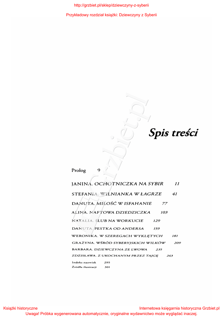 http://grzbiet.pl/sklep/dziewczyny-z-syberii Przykładowy rozdział książki: Dziewczyny z Syberii Spis Prolog treści 9 JANINA. OCHOTNICZKA NA SYBIR 11 STEFANIA. WILNIANKA W LAGRZE 41 DANUTA. MIŁOŚĆ W ISFAHANIE 77 ALINA. NAFTOWA DZIEDZICZKA 103 NATALIA. ŚLUB NA WORKUCIE 129 DANUTA. PESTKA OD ANDERSA 159 "W"ERONIKA. VV SZEREGACH \X7'YKLĘTYCH 181 GRAŻYNA. "W'ŚRÓD SYBERYJSKICH \VILKÓ"W' BARBARA. DZIE'JVCZYNA ZE L\VO\VA ZDZISŁA'X-'A. Z UKOCHANYJV1 PRZEZ Indeks nazwisk 295 Źródła ilusr.racji 301 209 235 TAJGĘ 263 Książki historyczne Internetowa księgarnia historyczna Grzbiet.pl Uwaga! Próbka wygenerowana automatycznie, oryginalne wydawnictwo może wyglądać inaczej. http://grzbiet.pl/sklep/dziewczyny-z-syberii Przykładowy rozdział książki: Dziewczyny z Syberii Prolog B ahater nie musi wałczyć z bronią w ręku. Nie musi być żołnie rzem. Bohaterem może być kobieta, której jedyną bronią są silna wola i determinacja. Dowodem na to mogą być losy Polek, które podczas II wojny światowej znalazły się na Syberii. W dwóch wiel kich falach deportacji (w latach 1939-1941 i po roku 1944) w głąb Związku Sowieckiego wywieziono ich kilkaset tysięcy. Każdy dzień zesłania był walką o przetrwanie - swoje, swoich dzieci, mężów, rodziców. Ścierały się w śmiertelnym boju z dziką syberyj ską przyrodą, głodem, chorobami i najgorszym wrogiem człowieka drugim człowiekiem. Pracowały w kołchozach i kopalniach, cier piały w lochach NKWD i nieludzkich łagrach. Były upokarzane, bite, okradane. Na ich rękach umierali najbliżsi. Nigdy się jednak nie poddały. Ich losy to opowieść o klęsce, nadziei i heroicznej walce zwieńczonej zwycięstwem. Poprosiłam dziesięć z nich, aby opowie działy o swoich dramatycznych losach. Oto one ... Książki historyczne Internetowa księgarnia historyczna Grzbiet.pl Uwaga! Próbka wygenerowana automatycznie, oryginalne wydawnictwo może wyglądać inaczej. http://grzbiet.pl/sklep/dziewczyny-z-syberii Przykładowy rozdział książki: Dziewczyny z Syberii 294 ANNA HERBICH l DZIEWCZYNY Z SYBERII Często wracam myślami na Syberię. Do Mietka, do naszej dra matycznej ucieczki. Do tego czasu, który spędziliśmy razem w taj dze, pod gałęziami świerków i rozgwieżdżonym niebem. Do tych krótkich chwil wolności. Tak dobrze pamiętam, jak wtedy wyglą dał i co mówił. Długo zastanawiałam się, dlaczego to akurat on wtedy umarł. Dlaczego nie ja. Kiedy pracowałam później w delegaturze w Ar changielsku i przeglądałam ewidencję zgonów, zwróciłam uwagę na zaskakującą prawidłowość. Najczęściej na zesłaniu umierały dzieci, starzy ludzie i właśnie młodzi mężczyźni. Kobiecych nazwisk na listach było mniej. Dało mi to dużo do myślenia, ale wszystko zro zumiałam dopiero po wielu latach, kiedy patrzyłam wstecz na swoje życie. Zesłanie, śmierć ukochanego, siedem sowieckich więzień, a potem czterdzieści lat ciężkiej pracy w siermiężnym PRL. Mimo tych wszystkich dramatycznych przeżyć dożyłam stu lat. I wcale nie uważam swojego życia za zakończone. Jest jeszcze tyle do zro bienia. To dowód na to, że kobiety wcale nie są płcią słabą. Są sil niejsze, bardziej wytrzymałe od mężczyzn. Na zesłaniu widziałam wiele kobiet, które każdego dnia z zaciś niętymi zębami toczyły walkę o przetrwanie. Swoje, swoich dzieci, mężów, rodziców. Wiele z nich tę walkę wygrało. Nie było takich przeciwności i przeszkód, których nie mogły pokonać. Nic, ale to nic nie było w stanie nas złamać. Zdzisława Wójcik (rocznik 1915) Książki historyczne Internetowa księgarnia historyczna Grzbiet.pl Uwaga! Próbka wygenerowana automatycznie, oryginalne wydawnictwo może wyglądać inaczej. http://grzbiet.pl/sklep/dziewczyny-z-syberii Przykładowy rozdział książki: Dziewczyny z Syberii Indeks osób \gara, prawnuczka Weroniki Oleszkie- Bohm Maria, bratowa Barbary 237, 239, 248, 256, 257, 259 wicz 208 Bucban Andrew 176 \małia, służąca w domu Aliny Vincenz Buksztynowa, Żydówka z Augustowa 215 105, 109 Ambroziewicz Jadwiga 155 Cejko Wanda 155 Anders Irena zob. Jarosiewicz Irena Anders Władysław 27, 29, 37. 89, 91- Chodkowski Jerzy, mąż Aliny Vincenz 128 92, 98-100, 119, 122, 170. 246, 247, Chopin Fryderyk 254 254,256.283.286 Churchill Winston 53 Andrzej, lekarz w łagrze 199 Chwieduk Bronisław .,Cietrzew" 190, Bańkowski Antoni .. Eliasz" 190 193 .,Cietrzew" zob. Chwieduk Bronisław Beriing Zygmunt 257 .,Cygan" zob. Stojanowski Michał Bernardzikiewicz Stefan 162 Czkałow Wałery 221 Biesiadecka Aniela 250 Bincer Wiktor 290 Danczowska Ata 269 Błoński Stanisław 256 Danczowska Kaja 269 Bogumilscy, polscy zesłańcy 225 Bohm Anna de domo Janicka, matka Dmowski Roman 246, 249 Barbary 241, 242, 247. 248, 253, Donitz Karl 176 254,256-258 Bohm Barbara, później Litwiniuk 235- .. Eliasz" zob. Bańkowski Antoni Elite;estońska pianistka 133 262 Bohm Edward, brat Barbary 241, 244, Emilia, koleżanka Weroniki Ołeszkie· wicz z łagru 201 247,248,262 Bohm Edward, ojciec Barbary 241, 242, Fedorowicz Tadeusz 255, 256, 262 245,248,253,25Z258,262 Bohm Jadwiga, siostra Barbary 241, 248, Frania, kobieta z kołchozu 30, 31 Franko Iwan 126 255, 257, 259-261 Książki historyczne Internetowa księgarnia historyczna Grzbiet.pl Uwaga! Próbka wygenerowana automatycznie, oryginalne wydawnictwo może wyglądać inaczej. http://grzbiet.pl/sklep/dziewczyny-z-syberii Przykładowy rozdział książki: Dziewczyny z Syberii INDEKS OSÓB Giedroyć Jerzy 233 Giedroyć Karol 16 Gienia, ciotka Janiny Szrodeckiej 15, 35 Grzelakowie, polscy zesłańcy 225 Habsburg Franciszek Józef 265 Habsburg Stefan 242 "Hanka" zob. Ursyn-Szantyr Stefania Hanka, kuzynka Janiny Szrodeckiej 35 Hartenstein Werner 176 Heczko Gustaw "Skorpion" 148 Hewanicki Adam 177-179 Hitler Adolf 48, 269 Jonkajtys Marian, brat Grażyny 214 219, 231 Jonkajtys Teresa, siostra Grażyny 214 222,223,229 Jonkajtys Zofia, siostra Gra