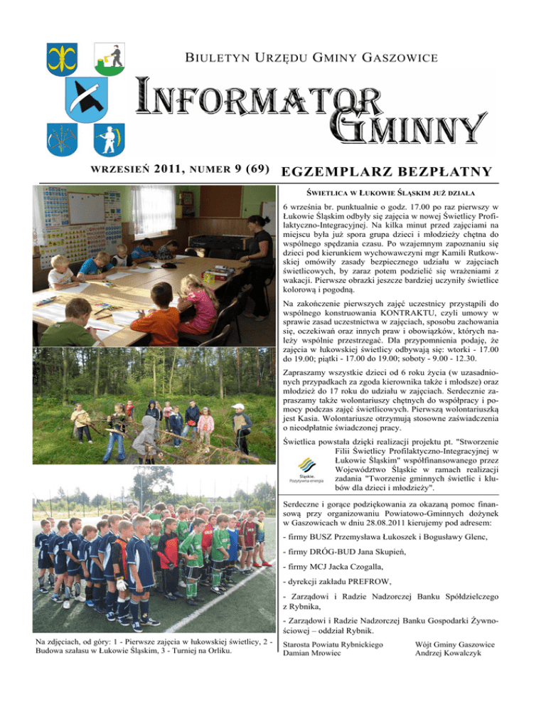 B IULETYN U RZĘDU G MINY G ASZOWICE WRZESIEŃ 2011, NUMER 9 (69) EGZEMPLARZ BEZPŁATNY ŚWIETLICA W ŁUKOWIE ŚLĄSKIM JUŻ DZIAŁA 6 września br. punktualnie o godz. 17.00 po raz pierwszy w Łukowie Śląskim odbyły się zajęcia w nowej Świetlicy Profilaktyczno-Integracyjnej. Na kilka minut przed zajęciami na miejscu była już spora grupa dzieci i młodzieży chętna do wspólnego spędzania czasu. Po wzajemnym zapoznaniu się dzieci pod kierunkiem wychowawczyni mgr Kamili Rutkowskiej omówiły zasady bezpiecznego udziału w zajęciach świetlicowych, by zaraz potem podzielić się wrażeniami z wakacji. Pierwsze obrazki jeszcze bardziej uczyniły świetlice kolorową i pogodną. Na zakończenie pierwszych zajęć uczestnicy przystąpili do wspólnego konstruowania KONTRAKTU, czyli umowy w sprawie zasad uczestnictwa w zajęciach, sposobu zachowania się, oczekiwań oraz innych praw i obowiązków, których należy wspólnie przestrzegać. Dla przypomnienia podaję, że zajęcia w łukowskiej świetlicy odbywają się: wtorki - 17.00 do 19.00; piątki - 17.00 do 19.00; soboty - 9.00 - 12.30. Zapraszamy wszystkie dzieci od 6 roku życia (w uzasadnionych przypadkach za zgoda kierownika także i młodsze) oraz młodzież do 17 roku do udziału w zajęciach. Serdecznie zapraszamy także wolontariuszy chętnych do współpracy i pomocy podczas zajęć świetlicowych. Pierwszą wolontariuszką jest Kasia. Wolontariusze otrzymują stosowne zaświadczenia o nieodpłatnie świadczonej pracy. Świetlica powstała dzięki realizacji projektu pt. "Stworzenie Filii Świetlicy Profilaktyczno-Integracyjnej w Łukowie Śląskim" współfinansowanego przez Województwo Śląskie w ramach realizacji zadania "Tworzenie gminnych świetlic i klubów dla dzieci i młodzieży". Serdeczne i gorące podziękowania za okazaną pomoc finansową przy organizowaniu Powiatowo-Gminnych dożynek w Gaszowicach w dniu 28.08.2011 kierujemy pod adresem: - firmy BUSZ Przemysława Łukoszek i Bogusławy Glenc, - firmy DRÓG-BUD Jana Skupień, - firmy MCJ Jacka Czogalla, - dyrekcji zakładu PREFROW, - Zarządowi i Radzie Nadzorczej Banku Spółdzielczego z Rybnika, - Zarządowi i Radzie Nadzorczej Banku Gospodarki Żywnościowej – oddział Rybnik. Na zdjęciach, od góry: 1 - Pierwsze zajęcia w łukowskiej świetlicy, 2 Budowa szałasu w Łukowie Śląskim, 3 - Turniej na Orliku. Starosta Powiatu Rybnickiego Damian Mrowiec Wójt Gminy Gaszowice Andrzej Kowalczyk S TR . 2 WRZESIEŃ ZAPROSZENIE 2011, NUMER 9 (69) BEZPŁATNA MAMMOGRAFIA Zapraszamy na cyfrową mammografię panie pomiędzy 50 a 69 rokiem życia (rocznik 1942-1961). Mammografia „Kolektory Słoneczne z dotacją 45 %”. jest darmowa, gdy od ostatniego badania finansowanego Spotkanie odbędzie się w dniu 18.10.2011 r. (wtorek) przez NFZ upłynęły pełne 2 lata. w OKiS Gaszowice o godzinie 18.00. Termin wykonania mammografii: Firma Taurus zaprasza na spotkanie informacyjne: Dofinansowanie NFOŚiGW. Spotkanie jest bezpłatne 17 października br. w godzinach 12.00 – 17.00, i nie zobowiązuje do zakupu urządzeń. 18 października br. w godzinach 9.00 – 16.00. Szczegóły pod nr telefonu 32/ 2038188 lub 600702635. Adres postoju mammobusu: Gaszowice, parking przy Wstęp wolny, Zapraszamy ! Ośrodku Kultury i Sportu, ul.Rydułtowska 7 ZBIÓRKA ZUŻYTEGO SPRZĘTU ELEKTRYCZNEGO I ELEKTRONICZNEGO ORAZ OPON Urząd Gminy Gaszowice organizuje w dniach od 19 do 21 października 2011r. (środa - piątek) zbiórkę zużytego kompletnego sprzętu elektrycznego i elektronicznego. Zbiórką objęte są m.in.: lodówki, zamrażalki, duży i mały sprzęt AGD, monitory i telewizory, sprzęt komputerowy i telekomunikacyjny, urządzenia elektryczne i elektroniczne. Więcej informacji pod nr telefonu: 32/2789896. Wcześniejsza rejestracja nie jest wymagana. Z udziału w programie wykluczone są pacjentki leczone z powodu rozpoznanego raka piersi! Dokumenty jakie należy zabrać ze sobą: - karta chipowa lub dokument potwierdzający ubezpieczenie zdrowotne, - dowód tożsamości z numer PESEL, KOMPLETNY sprzęt można pozostawić nieodpłatnie na tyłach budynku Urzędu Gminy (pomieszczenia byłej pie- - jeśli to możliwe zdjęcie z poprzedniej mammografii – karni) w godzinach 8.00 - 14.00. Przypominamy, że zuży- jest to ważne dla oceny badania. ty sprzęt elektryczny i elektroniczny jest odpadem i nie Nie odkładaj badań na później! można go umieszczać w pojemnikach z odpadami komuUpewnij się, że jesteś zdrowa! nalnymi. Jednocześnie w dniach 19-21 października br. na terenie GODZINY PRACY ŚWIETLICY Zakładu Obsługi Komunalnej w Gaszowicach przeprowadzona będzie zbiórka zużytych opon samochodów osoboPROFILAKTYCZNO - INTEGRACYJNEJ wych dostawczych i ciężarowych. Opony powinny być czyste, bez zanieczyszczeń (piasek, ziemia i inne ). Opo- W GASZOWICACH ny prosimy dostarczać do siedziby ZOK w Gaszowicach (Ośrodek Kultury i Sportu, pok. 25): przy ul.Rydułtowskiej w godzinach 7.00 -14.00. WTOREK, 14:30 - 17:00 LICZBA DZIECI I UCZNIÓW W PLACÓWKACH OŚWIATOCZWARTEK,14:00 - 16:30 WYCH GMINY GASZOWICE - ROK SZKOLNY 2011/2012 W PIECACH Nazwa placówki Liczba oddziałów Liczba dzieci/ uczniów Przedszkole w Czernicy 4 93 Przedszkole w Gaszowicach 5 Szkoła Podstawowa w Czernicy 6 Szkoła Podstawowa w Gaszowicach 12 250 Szkoła Podstawowa w Szczerbicach 6 131 2 odziały zerowe 43 - 5 i 6 latków 11 224 Gimnazjum w Piecach (Zielony budynek obok restauracji – pizzerii): PONIEDZIAŁEK, 14:00 – 17:30 CZWARTEK,14:00 – 17:30 125 SERDECZNIE ZAPRASZAMY! 159 Szczegółowe informacje w świetlicy, zapraszamy również na naszą stronę: www.komisja.gaszowice.pl WYSTAWA W GASZOWICACH Zrzeszenie Miłośników Drobnego Inwentarza w Radlinie organizuje II wystawę ptaków egzotycznych w dniach 1 – 2 października 2011 w hali OKiS –u Gaszowice. Godziny otwarcia wystawy w dniu 1.10.2011 (sobota) od 9.00-21.00 oraz w dniu 2.10.2011 (niedziela) od 8.00-17.00. S