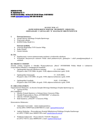 AGENCJA 64 PLUS Ul . Ogińskiego 67 / 5 66-400 Gorzów Wlkp. tel/fax 0-95 729-90-79 kom . 0-607 806152 e-mail: [email protected] NIP: 599-118-86-09 K O M U NI K A T OGÓLNOPOLSKICH IGRZYSK MŁODZIEśY SZKOLNEJ, GIMNAZJADY I LICEALADY W SZACHACH DRUśYNOWYCH I. Patronat honorowy: Zarząd Główny Szkolnego Związku Sportowego Wojewoda Lubuski KGHM Polska Miedź S.A. Patronat medialny Telewizja Regionalna TVP3 Gorzów Wlkp. Radio Zachód Gazeta Lubuska II. CEL Popularyzacja i wzrost zainteresowania szachami w środowisku szkolnym. Wyłonienie druŜynowych mistrzów Polski szkół podstawowych, gimnazjów i szkół ponadgimnazjalnych w szachach. III. MIEJSCE I TERMIN Zawody zostaną rozegrane w Ośrodku Wypoczynkowym „Sława” INTERFERIE Polska Miedź w Lubiatowie (województwo lubuskie) w następujących terminach: • Ogólnopolskie Igrzyska MłodzieŜy Szkolnej 12 - 15.05.2006 r. Przyjazd w dniu 12.05.2006r. do godz. 19.00, odprawa techniczna o godz. 20.00. • Ogólnopolska Gimnazjada 15 - 18.05.2006 r. Przyjazd w dniu 15.05.2006 r. do godz. 19.00, odprawa techniczna o godz. 20.00. • Ogólnopolska Licealiada 18.05. - 21.05.2006 r. Przyjazd w dniu 18.05.2006 r. do godz. 19.00, odprawa techniczna o godz. 20.00. IV. ORGANIZATORZY: Organizatorami Mistrzostw na zlecenie Zarządu Głównego Szkolnego Związku Sportowego są: Agencja 64 Plus przy współpracy: Szkolny Związek Sportowy w Zielonej Górze i Gorzowie Wlkp., Ośrodek Wypoczynkowy Sława „INTERFERIE” w Lubiatowie, UKS EL-TUR SP 3 Bogatynia, Klub Szachowy „STILON” w Gorzowie Wlkp. Kierownictwo Mistrzostw: Aleksander Czerwoński – mistrz międzynarodowy, tel./fax (095) 7299079 lub tel.0607806152 e-mail: [email protected] Andrzej Modzelan – Przewodniczący Komisji MłodzieŜowej Polskiego Związku Szachowego tel. (095) 7370003, kom. 0606921188 e-mail: [email protected] Waldemar GałaŜewski – Prezes UKS EL-TUR SP 3 Bogatynia tel. (075) 7783731, kom. 0600952587, e-mail: [email protected] V. SYSTEM ROZGRYWEK Mistrzostwa zostaną rozegrane systemem szwajcarskim druŜynowym na dystansie 11 rund - kojarzenie komputerowe, lub systemem kołowym. DruŜyna szkolna w kaŜdej kategorii wiekowej składać się będzie z 4 zawodników - 3 chłopców i 1 dziewczyny. Kolejność zawodników w druŜynie, łącznie z rezerwowymi, ustalona na odprawie technicznej przed zawodami, nie moŜe ulec zmianie w trakcie rozgrywek. Na szachownicy chłopca moŜe zostać zgłoszona dziewczyna, jednakŜe pozbawia to ją prawa gry na szachownicy dziewczyny. Kolejność druŜyn przed pierwszą rundą ustala się na podstawie średnich rankingów druŜyny (udokumentowanych wpisem w legitymacji szachowej), przy identycznych średnich rankingach zostanie przeprowadzone dodatkowe losowanie numerów startowych. Zmianę składu druŜyny naleŜy podać sędziemu najpóźniej na 10 minut przed rozpoczęciem rundy. VI. TEMPO I PRZEPISY GRY Tempo gry - 30 minut na partię dla zawodnika. W turnieju obowiązują przepisy zawarte w Kodeksie Szachowym PZSzach. z 2002 roku. VII. UCZESTNICTWO W mistrzostwach mogą uczestniczyć: IMS - uczniowie szkół podstawowych ur. w 1993 i młodsi, Gimnazjada - uczniowie szkół gimnazjalnych ur. w latach 1990 i młodsi, Licealiada - uczniowie szkół ponadgimnazjalnych ur. w latach 1986 i młodsi. uczęszczający do danej szkoły - minimum od września 2005 r., po zgłoszeniu i przedstawieniu waŜnej legitymacji szkolnej. W turnieju udział biorą medaliści wojewódzkich IMS, Gimnazjad i Licealiad. W przypadku rezygnacji powyŜszych następne zespoły z województw. Organizatorzy mają prawo (w przypadku małej liczby druŜyn) dopuszczenia do zawodów innych zespołów tj. więcej niŜ trzech z województwa. VIII. PUNKTACJA I OCENA WYNIKÓW Wyniki partii oceniane są następująco: wygrana - 1 p., remis - 0,5 p., przegrana - 0 p.. Kolejność miejsc w zawodach będzie ustalona na podstawie liczby zdobytych punktów duŜych (tzw. meczowe), wygranie meczu - 2 p., remis - 1 p., przegrana - 0 p., a przy ich równości decydują kolejno: punkty małe (za partie) wartościowanie średnie Buchholza (system szwajcarski) wartościowanie pełne Buchholza (system szwajcarski) wynik bezpośredniego spotkania, lepszy wynik na pierwszej, ewentualnie kolejnych szachownicach. O tytule Mistrza Polski - w przypadku równej ilości wszystkich dodatkowych kryteriów - decyduje dodatkowy mecz z tempem 15 minut na partię dla zawodnika. Przy remisie o tytule decydować będą kolejno wyniki na pierwszej i kolejnych szachownicach. W przypadku nieparzystej ilości uczestniczących druŜyn, druŜyna pauzująca otrzymuje punkt meczowy (duŜy) i 50% punktów (małych) moŜliwych do zdobycia w meczu. IX. STARTOWE Startowe do MP Szkół Podstawowych, Gimnazjady i Licealiady w wysokości 50 zł od druŜyny naleŜy wpłacić na konto Agencji 64 PLUS (jak niŜej) w terminie do dnia 30.04.2006 r. lub na miejscu. X. ZAKWATEROWANIE I WYśYWIENIE Koszt udziału w Mistrzostwach wyniesie 147 zł od jednej osoby - 3 dni x 49zł dziennie (zakwaterowanie + pełne wyŜywienie). Koszty zakwaterowania, wyŜywienia i startowego naleŜy wpłacić na konto: Agencja 64 PLUS, ul. Ogińskiego 67/5, 66-400 Gorzów Wlkp. PKO BP II O/Gorzów Wlkp. 96 10201967 0000 8202 0004 0444 XI. ZGŁOSZENIA Zgłoszenia do udziału w Mistrzostwach naleŜy nadsyłać pisemnie, e-mailem bądź faksem: e-mail: [email protected], Aleksander Czerwiński, ul. Ogińskiego 67/5, 66-400 Gorzów Wlkp., tel/fax (095) 7299079 Termin zgłoszeń ustala się na 30.04.2006 r. XII. NAGRODY I WYRÓśNIENIA Zwycięska druŜyna otrzyma odpowiednio tytuł mistrza: Ogólnopolskich Igrzysk MłodzieŜy Szkolnej, Ogólnopolskiej Gimnazjady, Ogólnopolskiej Licealiady, Zawodnicy trzech najlepszych druŜyn otrzymają medale, puchary i dyplomy, Trzech najlepszych zawodników na poszczególnych szachownicach otrzyma dyplomy i nagrody rzeczowe. Wszystkie druŜyny otrzymają dyplomy uczestnictwa. XIII. SPRAWY RÓśNE Op