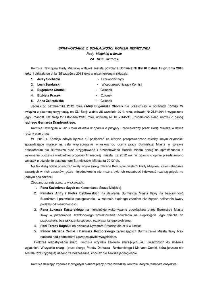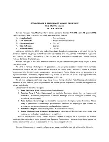 SPRAWOZDANIE Z DZIAŁALNOŚCI KOMISJI REWIZYJNEJ Rady Miejskiej w Iławie ZA ROK 2013 rok Komisja Rewizyjna Rady Miejskiej w Iławie została powołana Uchwałą Nr II/9/10 z dnia 15 grudnia 2010 roku i działała do dnia 25 września 2013 roku w niezmienionym składzie: 1. Jerzy Sochacki - Przewodniczący 2. Lech Żendarski - 3. Eugeniusz Chomik - Członek 4. Elżbieta Prasek - Członek 5. Anna Zakrzewska - Członek Wiceprzewodniczący Komisji Jednak od października 2012 roku, radny Eugeniusz Chomik nie uczestniczył w obradach Komisji. W związku z pisemną rezygnacją, na XLI Sesji w dniu 25 września 2013 roku, uchwałą Nr XLI/420/13 wygaszono jego mandat. Na Sesji 27 listopada 2013 roku, uchwałą Nr XLIV/445/13 uzupełniono skład Komisji o osobę radnego Gerharda Drapiewskiego. Komisja Rewizyjna w 2013 roku działała w oparciu o przyjęty i zatwierdzony przez Radę Miejską w Iławie roczny plan pracy. W 2012 r. Komisja odbyła łącznie 19 posiedzeń na których przeprowadzono miedzy innymi czynności sprawdzające mające na celu wypracowanie wniosków do oceny pracy Burmistrza Miasta w sprawie absolutorium dla Burmistrza oraz przygotowano i przedstawiono Radzie Miasta opinię do sprawozdania z wykonanie budżetu i wieloletniej prognozy finansowej miasta za 2012 rok. W oparciu o opinię przedstawiono wniosek o udzielenie absolutorium Burmistrzowi Miasta za 2012 rok. Na tak dużą liczbę posiedzeń miały wpływ skargi zlecane Komisji uchwałami Rady Miejskiej, celem zbadania zawartych w nich zarzutów, gdzie niejednokrotnie nie można było ich rozpatrzeć i dokonać rozstrzygnięcia na jednym posiedzeniu Zbadano zarzuty zawarte w skargach: 1. Pana Kazimierza Szych na Komendanta Straży Miejskiej 2. Państwa Anny i Piotra Dąbkowskich na działania Burmistrza Miasta Iławy na bezczynność Burmistrza i przewlekłe postępowanie w zakresie błędnego zdaniem skarżących naliczenia kwoty podatku od nieruchomości. 3. Pana Łukasza Kasterskiego na nienależyte wykonywanie obowiązków przez Burmistrza Miasta Iławy w przedmiocie szablonowego potraktowania odwołania na nieprzyjęcie jego dziecka do przedszkola, bez wskazania sposobu rozwiązania jego problemu; 4. Pani Teresy Bagniuk na działania Dyrektora Przedszkola nr 4 w Iławie; 5. Panów Mariana Cemki i Dariusza Rozborskiego zarzucających Burmistrzowi Miasta Iławy brak nadzoru nad podmiotami zarządzającymi wysypiskiem. Podczas rozpatrywania skarg komisja wzywała zarówno skarżących jak i skarżonych do złożenia wyjaśnień. Wszystkie skargi, (poza skargą Panów Dariusza Rozborskiego i Mariana Cemki, która jeszcze nie została rozstrzygnięta) uznano za bezzasadne, chociaż nie zawsze jednogłośnie. Komisja działając zgodnie z przyjętym planem pracy przeprowadziła kontrole których tematyka dotyczyła: • Kontrola realizacji wniosków pokontrolnych z roku 2012 r. • Kontrola zatrudnienia w ICK oraz jego koszty • Kontrola eksploatacji i funkcjonowania „Orlików” • Analiza skutków podwyżki cen biletów autobusowych z 2012 roku • Kontrola wydatków związanych z funkcjonowaniem schroniska dla psów • Kontrola prawidłowości wypłacania diet radnych za pierwsze półrocze 2013 roku • Kontrola działalności oraz przychodów i wydatków w Ośrodku Psychoedukacji Profilaktyki Uzależnień i Pomocy Rodzinie • Kontrola efektów działania Wydziału Promocji i Współpracy z Zagranicą Podczas kontroli komisja zapoznawała się z dokumentacją będącą przedmiotem kontroli jak również z protokołami kontroli zewnętrznych przeprowadzanych w wydziałach lub jednostkach. Bywało, że podczas przeprowadzanej kontroli dokonywała również wizji lokalnej infrastruktury jednostki jak to miało miejsce na obiekcie „Orlika” na Osiedlu Lubawskim czy Schroniska dla Bezdomnych Zwierząt przy ul. Komunalnej. W wyniku powyższych kontroli Komisja nie stwierdziła nieprawidłowości. Wnioski pokontrolne zostały przekazane do Burmistrza celem realizacji . Podczas jednej z sesji, członek Komisji Rewizyjnej Anna Zakrzewska, wnioskowała o zlecenie Komisji Rewizyjnej kontroli zasadności przyznawania ulg i umorzeń w podatkach– temat ten został ujęty w propozycji planu pracy na rok 2014. Przyjęty plan pracy na 2013 rok komisja zrealizowała w 100%. Frekwencja w minionym roku wyniosła 80% (na dzień 30 listopada br.) Wpływ na jej obniżenie miała głównie nieobecność na Komisjach radnego Eugeniusza Chomika spowodowana jego stanem zdrowia. W imieniu członków Komisji Rewizyjnej dziękuję wszystkim tym, którzy przyczynili się do sprawnej pracy komisji, dzielili się swoją wiedzą oraz wykazali zrozumienie dla prac komisji. Z wyrazami szacunku Przewodniczący Komisji /-/Jerzy Sochacki Grudzień, 2013r.