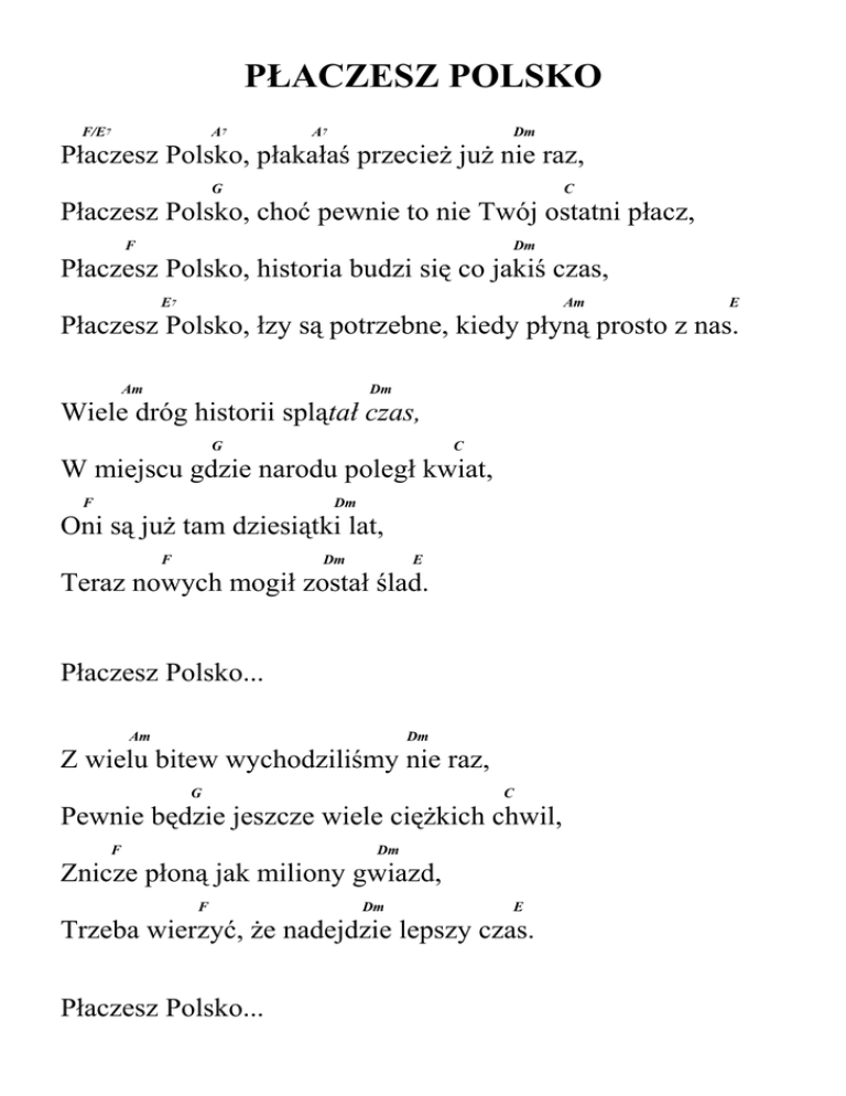 PŁACZESZ POLSKO F/E7 A7 A7 Dm Płaczesz Polsko, płakałaś przecież już nie raz, G C Płaczesz Polsko, choć pewnie to nie Twój ostatni płacz, F Dm Płaczesz Polsko, historia budzi się co jakiś czas, E7 Am E Płaczesz Polsko, łzy są potrzebne, kiedy płyną prosto z nas. Am Dm Wiele dróg historii splątał czas, G C W miejscu gdzie narodu poległ kwiat, F Dm Oni są już tam dziesiątki lat, F Dm E Teraz nowych mogił został ślad. Płaczesz Polsko... Am Dm Z wielu bitew wychodziliśmy nie raz, G C Pewnie będzie jeszcze wiele ciężkich chwil, F Dm Znicze płoną jak miliony gwiazd, F Dm E Trzeba wierzyć, że nadejdzie lepszy czas. Płaczesz Polsko...