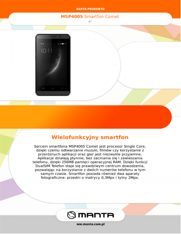 MSP4005SmartfonComet 4" Wielofunkcyjnysmartfon SercemsmartfonaMSP4005CometjestprocesorSingleCore, dziękiczemuodtwarzaniemuzyki,filmówczykorzystaniez przeróżnychaplikacjiorazgierjestniezwykleprzyjemne. Aplikacjedziałająpłynnie,bezzacinaniasięizawieszania telefonu,dzięki256MBpamięcioperacyjnejRAM.Dziękifunkcji DualSIMTelefonstajesięprawdziwymcentrumdowodzenia, pozwalającnakorzystaniezdwóchnumerówtelefonuwtym samymczasie.Smartfonposiadarównieżdwaaparaty fotograficzne:przedniomatrycy0,3Mpxitylny2Mpx. MSP4005SmartfonComet 4" Specyfikacja Bluetooth DziękizastosowaniutechnologiiBluetooth SmartfonMantaMSP4005Cometbezproblemu połączysiębezprzewodowonietylkozinnymi smartfonamialetakżezewszystkimiurządzeniami obsługującymitętechnologię,wtymzgłośnikami Manta.Dziękitemu,jedensmartfonmożestaćsię uniwersalnympilotemdlacałegodomu! Specyfikacja MantaMSP4005Cometposiadarównieżaż512MB pamięciflashorazmożliwośćinstalacjikarty pamięciMicroSD,umożliwiającejrozszerzenie pamięciażo32GB,dziękiczemunaurządzeniu pomieszcząsięwszystkieaplikacje.Wartozwrócić teżuwagęnanowoczesnydesigntegourządzenia, którysprawia,żesmartfonbędziedoskonałym pomysłemnaprezentzarównodlamłodszychjaki starszychużytkowników. Systemoperacyjny Android2.3 Procesor SingleCore RAM 256MB FLASH 512MB Wi-Fi IEEE802.11B/G Dual-SIM Tak Bluetooth Tak GPS NIE Aparat 0.3MPix(front)/2MPix(back) Gniazdokartpamięci MicroSD(Max32GB) GniazdoUSB MicroUSB RadioFM Tak http://www.manta.com.pl/pl/msp4005 EAN:5902510600082