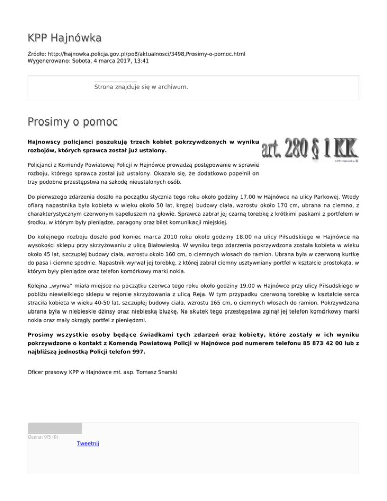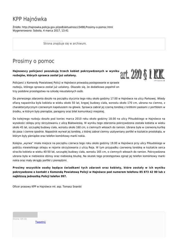 KPP Hajnówka Źródło: http://hajnowka.policja.gov.pl/po8/aktualnosci/3498,Prosimy-o-pomoc.html Wygenerowano: Sobota, 4 marca 2017, 13:41 Strona znajduje się w archiwum. Prosimy o pomoc Hajnowscy policjanci poszukują trzech kobiet pokrzywdzonych w wyniku rozbojów, których sprawca został już ustalony. Policjanci z Komendy Powiatowej Policji w Hajnówce prowadzą postępowanie w sprawie rozboju, którego sprawca został już ustalony. Okazało się, że dodatkowo popełnił on trzy podobne przestępstwa na szkodę nieustalonych osób. Do pierwszego zdarzenia doszło na początku stycznia tego roku około godziny 17.00 w Hajnówce na ulicy Parkowej. Wtedy ofiarą napastnika była kobieta w wieku około 50 lat, krępej budowy ciała, wzrostu około 170 cm, ubrana na ciemno, z charakterystycznym czerwonym kapeluszem na głowie. Sprawca zabrał jej czarną torebkę z krótkimi paskami z portfelem w środku, w którym były pieniądze, paragony oraz bilet komunikacji miejskiej. Do kolejnego rozboju doszło pod koniec marca 2010 roku około godziny 18.00 na ulicy Piłsudskiego w Hajnówce na wysokości sklepu przy skrzyżowaniu z ulicą Białowieską. W wyniku tego zdarzenia pokrzywdzona została kobieta w wieku około 45 lat, szczupłej budowy ciała, wzrostu około 160 cm, o ciemnych włosach do ramion. Ubrana była w czerwoną kurtkę do pasa i ciemne spodnie. Napastnik wyrwał jej torebkę, z której zabrał ciemny usztywniany portfel w kształcie prostokąta, w którym były pieniądze oraz telefon komórkowy marki nokia. Kolejna „wyrwa” miała miejsce na początku czerwca tego roku około godziny 19.00 w Hajnówce przy ulicy Piłsudskiego w pobliżu niewielkiego sklepu w rejonie skrzyżowania z ulicą Reja. W tym przypadku czerwoną torebkę w kształcie serca straciła kobieta w wieku 40-50 lat, szczupłej budowy ciała, wzrostu 165 cm, o ciemnych włosach do ramion. Pokrzywdzona ubrana była w niebieskie dżinsy oraz niebieską bluzkę. Na skutek tego przestępstwa zginął jej telefon komórkowy marki nokia oraz mały okrągły portfel z pieniędzmi. Prosimy wszystkie osoby będące świadkami tych zdarzeń oraz kobiety, które zostały w ich wyniku pokrzywdzone o kontakt z Komendą Powiatową Policji w Hajnówce pod numerem telefonu 85 873 42 00 lub z najbliższą jednostką Policji telefon 997. Oficer prasowy KPP w Hajnówce mł. asp. Tomasz Snarski Ocena: 0/5 (0) Tweetnij