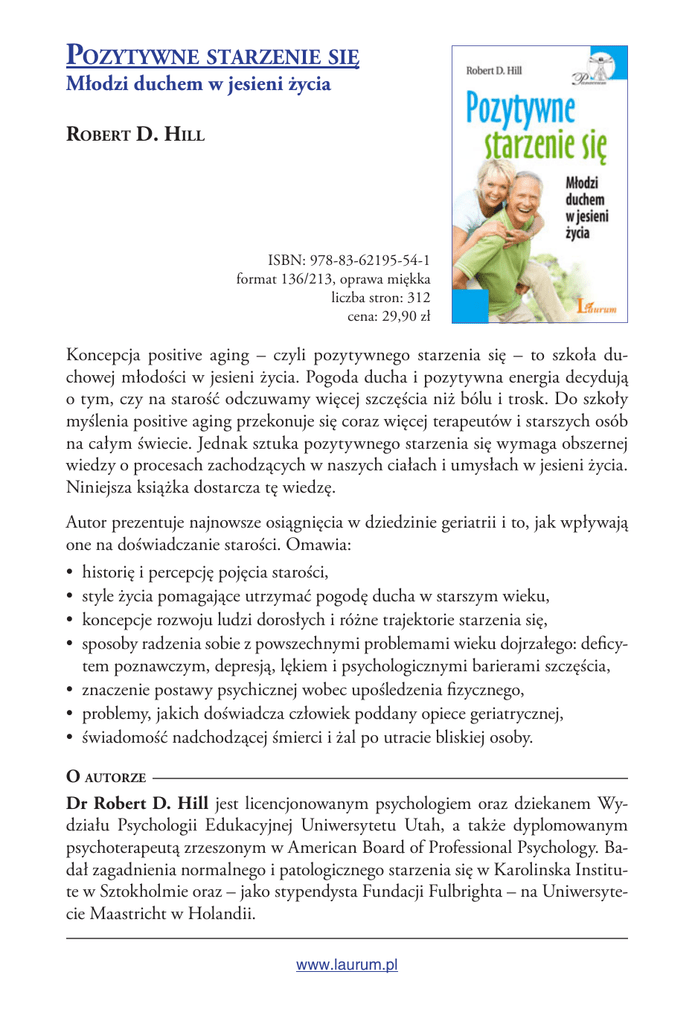 Pozytywne starzenie się Młodzi duchem w jesieni życia Robert D. Hill ISBN: 978-83-62195-54-1 format 136/213, oprawa miękka liczba stron: 312 cena: 29,90 zł Koncepcja positive aging – czyli pozytywnego starzenia się – to szkoła duchowej młodości w jesieni życia. Pogoda ducha i pozytywna energia decydują o tym, czy na starość odczuwamy więcej szczęścia niż bólu i trosk. Do szkoły myślenia positive aging przekonuje się coraz więcej terapeutów i starszych osób na całym świecie. Jednak sztuka pozytywnego starzenia się wymaga obszernej wiedzy o procesach zachodzących w naszych ciałach i umysłach w jesieni życia. Niniejsza książka dostarcza tę wiedzę. Autor prezentuje najnowsze osiągnięcia w dziedzinie geriatrii i to, jak wpływają one na doświadczanie starości. Omawia: • historię i percepcję pojęcia starości, • style życia pomagające utrzymać pogodę ducha w starszym wieku, • koncepcje rozwoju ludzi dorosłych i różne trajektorie starzenia się, • sposoby radzenia sobie z powszechnymi problemami wieku dojrzałego: deficytem poznawczym, depresją, lękiem i psychologicznymi barierami szczęścia, • znaczenie postawy psychicznej wobec upośledzenia fizycznego, • problemy, jakich doświadcza człowiek poddany opiece geriatrycznej, • świadomość nadchodzącej śmierci i żal po utracie bliskiej osoby. O autorze Dr Robert D. Hill jest licencjonowanym psychologiem oraz dziekanem Wydziału Psychologii Edukacyjnej Uniwersytetu Utah, a także dyplomowanym psychoterapeutą zrzeszonym w American Board of Professional Psychology. Badał zagadnienia normalnego i patologicznego starzenia się w Karolinska Institute w Sztokholmie oraz – jako stypendysta Fundacji Fulbrighta – na Uniwersytecie Maastricht w Holandii. www.laurum.pl Pozytywne starzenie się Pozytywne starzenie siĊ 7 Spis treści Wprowadzenie ................................................................. 11 Rozdział 1. Zarys koncepcji pozytywnego starzenia się 21 Normalne starzenie się ...................................................... Długowieczność a normalne starzenie się ........................... Czynniki socjoekonomiczne wpływające na oczekiwaną długość życia.................................................................. Pomyślne starzenie się....................................................... Pozytywne starzenie się ..................................................... Cechy charakterystyczne pozytywnego starzenia się ............. Podsumowanie.................................................................. 22 28 29 38 42 44 52 Rozdział 2. Trzy modele starzenia się w okresie całego życia ............................................................ 53 Teoria faz rozwoju psychospołecznego Eriksona ................. 53 Podstawowa ufność a podstawowa nieufność ......................... Autonomia a wstyd i zwątpienie ........................................... Inicjatywa a poczucie winy.................................................... Pracowitość a poczucie niższości ............................................ Tożsamość a niepewność roli ................................................. Intymność a izolacja ............................................................. Kreatywność a egocentryzm ................................................. Integralność a rozpacz .......................................................... 54 55 55 56 56 57 57 58 Teoria Eriksona a pozytywne starzenie się ......................... 58 Zastosowanie praktyczne ...................................................... 60 www.laurum.pl www.laurum.pl 8 Pozytywne się Pozytywne starzenie starzenie siĊ Teoria ciągłości ................................................................. 65 Ciągłość wewnętrzna ............................................................ Ciągłość zewnętrzna ............................................................. Nieciągłość ........................................................................... Teoria ciągłości a pozytywne starzenie się .............................. Zastosowanie praktyczne ...................................................... 66 67 71 73 75 Teoria selektywności, optymalizacji i kompensacji ............. 78 Selektywność ........................................................................ Optymalizacja ...................................................................... Kompensacja ........................................................................ Teoria SOC a pozytywne starzenie się ................................... Zastosowanie praktyczne ...................................................... 78 79 79 84 85 Podsumowanie.................................................................. 87 Rozdział 3. Związane z wiekiem pogarszanie się stanu zdrowia i jego skutki ................................. 89 Trajektorie związanego z wiekiem pogarszania się stanu zdrowia ........................................................................ Związane z wiekiem upośledzenie funkcji kognitywnych ... Pogarszanie się pamięci w wieku podeszłym ...................... 90 93 99 Strategie radzenia sobie z wynikającą z choroby deterioracją pamięci ................................................................................. Strategie radzenia sobie ze związaną z wiekiem deterioracją pamięci .............................................................. Trening pamięci – kompensowanie deficytów pamięci umiejętnościami ........................................................... Jak zapamiętać PIN? ...................................................... Mądrość jako pozytywny skutek zmian związanych z wiekiem..................................................................... Podsumowanie.................................................................. 101 103 107 108 109 115 Rozdział 4. Strategie i instrumenty oceny ...........