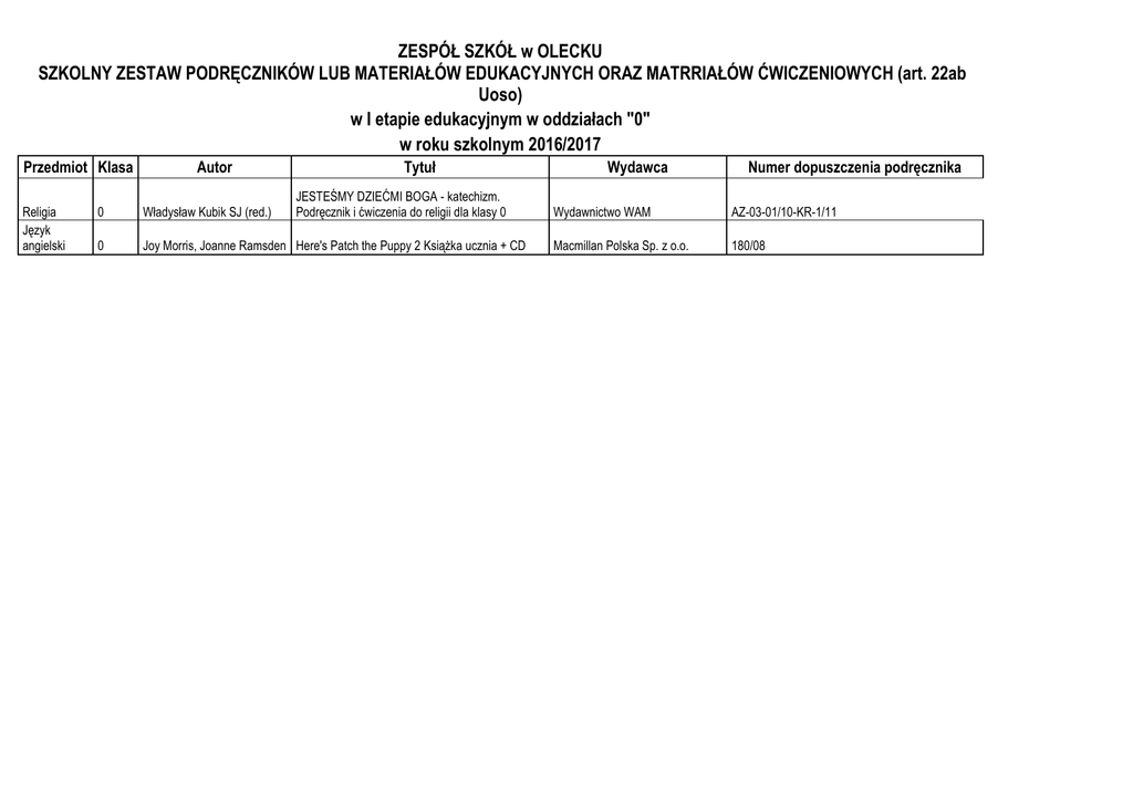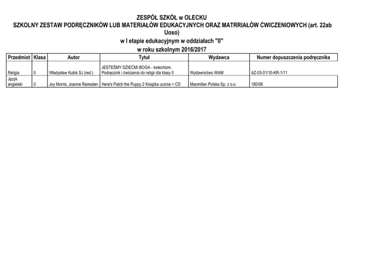 ZESPÓŁ SZKÓŁ w OLECKU SZKOLNY ZESTAW PODRĘCZNIKÓW LUB MATERIAŁÓW EDUKACYJNYCH ORAZ MATRRIAŁÓW ĆWICZENIOWYCH (art. 22ab Uoso) w I etapie edukacyjnym w oddziałach "0" w roku szkolnym 2016/2017 Przedmiot Klasa Religia Język angielski Autor Tytuł JESTEŚMY DZIEĆMI BOGA - katechizm. Podręcznik i ćwiczenia do religii dla klasy 0 0 Władysław Kubik SJ (red.) 0 Joy Morris, Joanne Ramsden Here's Patch the Puppy 2 Książka ucznia + CD Wydawca Numer dopuszczenia podręcznika Wydawnictwo WAM AZ-03-01/10-KR-1/11 Macmillan Polska Sp. z o.o. 180/08 ZESPÓŁ SZKÓŁ w OLECKU SZKOLNY ZESTAW PODRĘCZNIKÓW LUB MATERIAŁÓW EDUKACYJNYCH ORAZ MATRRIAŁÓW ĆWICZENIOWYCH (art. 22ab Uoso) w I etapie edukacyjnym w klasach I w roku szkolnym 2016/2017 Przedmiot P. religia Klasa Autor Tytuł JESTEŚMY W RODZINIE PANA JEZUSA - katechizm. Podręcznik do religii dla klasy I szkoły podstawowej Wydawnictwo WAM JESTEŚMY W RODZINIE PANA JEZUSA – zeszyt ucznia. Ćwiczenia do religii dla klasy I szkoły podstawowej Wydawnictwo WAM 1 Władysław Kubik SJ (red.) 1 Władysław Kubik SJ (red.) edukacja wczesnoszkolna 1 Podręczniki zapewnia Ministerstwo Edukacji Narodowej (szkoła wypożyczy je uczniom) edukacja wczesnoszkolna 1 edukacja wczesnoszkolna 1 Język angielski 1 Ćw. Język angielski 1 Ćw. P. Ćw. Ćw. P. religia Wydawca Podręczniki zakupuje szkoła z dotacji udzielonej przez Ministerstwo Edukacji Narodowej i wypożycza je uczniom. Ćwiczenia i materiały ćwiczeniowe zakupuje szkoła z dotacji udzielonej przez Ministerstwo Edukacji Narodowej i przekazuje je uczniom. Uwagi ZESPÓŁ SZKÓŁ w OLECKU SZKOLNY ZESTAW PODRĘCZNIKÓW LUB MATERIAŁÓW EDUKACYJNYCH ORAZ MATRRIAŁÓW ĆWICZENIOWYCH (art. 22ab Uoso) w I etapie edukacyjnym w klasach II w roku szkolnym 2016/2017 Przedmiot Klasa edukacja wczesnoszkolna 2 edukacja wczesnoszkolna 2 edukacja wczesnoszkolna 2 edukacja wczesnoszkolna 2 P. Język angielski 2 Ćw. Język angielski 2 P. Ćw. Ćw. Ćw. P. Ćw. religia religia Autor Tytuł Wydawca Podręczniki zapewnia Ministerstwo Edukacji Narodowej (szkoła wypożyczy je uczniom) Podręczniki zakupuje szkoła z dotacji udzielonej przez Ministerstwo Edukacji Narodowej i wypożycza je uczniom. Ćwiczenia i materiały ćwiczeniowe zakupuje szkoła z dotacji udzielonej przez Ministerstwo Edukacji Narodowej i przekazuje je uczniom. 2 Władysław Kubik SJ (red.) KOCHAMY PANA JEZUSA - katechizm. Podręcznik do religii dla klasy II szkoły podstawowej Wydawnictwo WAM 2 Władysław Kubik SJ (red.) KOCHAMY PANA JEZUSA - zeszyt ucznia. Ćwiczenia do religii dla klasy II szkoły podstawowej Wydawnictwo WAM Uwagi ZESPÓŁ SZKÓŁ w OLECKU SZKOLNY ZESTAW PODRĘCZNIKÓW LUB MATERIAŁÓW EDUKACYJNYCH ORAZ MATRRIAŁÓW ĆWICZENIOWYCH (art. 22ab Uoso) w I etapie edukacyjnym w klasach III w roku szkolnym 2016/2017 Przedmiot Klasa edukacja wczesnoszkolna 3 edukacja wczesnoszkolna 3 edukacja wczesnoszkolna 3 edukacja wczesnoszkolna 3 P. Język angielski 3 Ćw. Język angielski 3 P. Ćw. Ćw. Ćw. P. Ćw. religia religia Autor Tytuł Wydawca Podręczniki zapewnia Ministerstwo Edukacji Narodowej (szkoła wypożyczy je uczniom) Podręczniki zakupuje szkoła z dotacji udzielonej przez Ministerstwo Edukacji Narodowej i wypożycza je uczniom. Ćwiczenia i materiały ćwiczeniowe zakupuje szkoła z dotacji udzielonej przez Ministerstwo Edukacji Narodowej i przekazuje je uczniom. 3 Władysław Kubik SJ (red) PRZYJMUJEMY PANA JEZUSA - katechizm. Podręcznik do religii dla klasy III szkoły podstawowej Wydawnictwo WAM 3 Władysław Kubik SJ (red) PRZYJMUJEMY PANA JEZUSA - zeszyt ucznia. Ćwiczenia do religii dla klasy III szkoły podstawowej Wydawnictwo WAM Uwagi ZESPÓŁ SZKÓŁ w OLECKU SZKOLNY ZESTAW PODRĘCZNIKÓW LUB MATERIAŁÓW EDUKACYJNYCH ORAZ MATRRIAŁÓW ĆWICZENIOWYCH (art. 22ab Uoso) w II etapie edukacyjnym w klasach IV w roku szkolnym 2016/2017 Przedmiot Klasa P. Religia 4 Ćw. P. P. Ćw. P. Ćw. P. Ćw. Ćw. Ćw. P. Ćw. P. P. Ćw. P. Ćw. P. Ćw. P. Religia Język polski Język polski Język polski Historia i społeczeństwo Historia i społeczeństwo Matematyka Matematyka Matematyka Matematyka Przyroda Przyroda Zajęcia techniczne Język angielski Język angielski Zajęcia komputerowe Zajęcia komputerowe Muzyka Muzyka Plastyka 4 4 4 4 4 4 4 4 4 4 4 4 4 4 4 4 4 4 4 4 Autor Zbigniew Marek SJ (red.) Zbigniew Marek SJ (red.) Tytuł ZAPROSZENI PRZEZ BOGA - katechizm. Podręcznik do religii dla IV klasy szkoły podstawowej ZAPROSZENI PRZEZ BOGA - zeszyt ucznia. Zeszyt ucznia do religii dla IV klasy szkoły podstawowej Wydawca Wydawnictwo WAM Wydawnictwo WAM Podręczniki zakupuje szkoła z dotacji udzielonej przez Ministerstwo Edukacji Narodowej i wypożycza je uczniom. Ćwiczenia i materiały ćwiczeniowe zakupuje szkoła z dotacji udzielonej przez Ministerstwo Edukacji Narodowej i przekazuje je uczniom. Uwagi ZESPÓŁ SZKÓŁ w OLECKU SZKOLNY ZESTAW PODRĘCZNIKÓW LUB MATERIAŁÓW EDUKACYJNYCH ORAZ MATRRIAŁÓW ĆWICZENIOWYCH (art. 22ab Uoso) w II etapie edukacyjnym w klasach V w roku szkolnym 2016/2017 Przedmiot Klasa P. Religia 5 Ćw. P. P. Ćw. P. Ćw. P. Ćw. Ćw. Ćw. P. Ćw. P. Ćw. P. Ćw. P. Ćw. P. Ćw. P. Ćw. P. Religia Język polski Język polski Język polski Historia i społeczeństwo Historia i społeczeństwo Matematyka Matematyka Matematyka Matematyka Przyroda Przyroda Zajęcia techniczne Zajęcia techniczne Zajęcia komputerowe Zajęcia komputerowe Wych. do życia w rodz. Wych. do życia w rodz. Język angielski Język angielski Muzyka Muzyka Plastyka 5 5 5 5 5 5 5 5 6 5 5 5 5 5 5 5 5 5 5 5 5 5 5 Autor Zbigniew Marek SJ, Anna Walulik CSFN (red.) Zbigniew Marek SJ, Anna Walulik CSFN (red.) Tytuł OBDAROWANI PRZEZ BOGA - katechizm. Podręcznik do religii dla klasy V szkoły podstawowej OBDAROWANI PRZEZ BOGA - zeszyt ucznia. Zeszyt ucznia do religii dla V klasy szkoły podstawowej Wydawca Wydawnictwo WAM Wydawnictwo WAM Podręczniki zakupuje szkoła z dotacji udzielonej przez Ministerstwo Edukacji