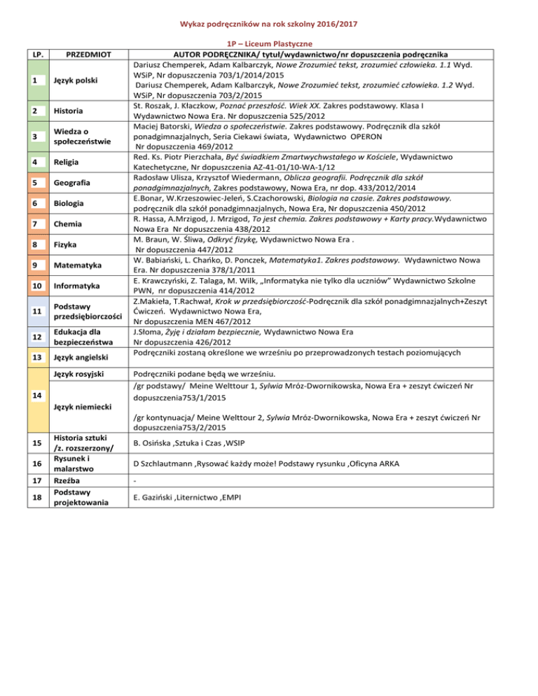 Wykaz podręczników na rok szkolny 2016/2017 1P – Liceum