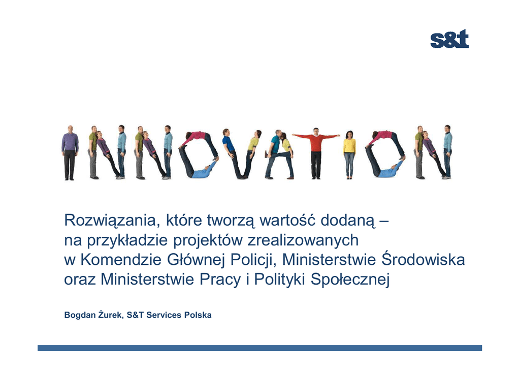 Rozwiązania, które tworzą wartość dodaną – na przykładzie projektów zrealizowanych w Komendzie Głównej Policji, Ministerstwie Środowiska oraz Ministerstwie Pracy i Polityki Społecznej Bogdan Żurek, S&T Services Polska Plan prezentacji ■ ■ Nowoczesny System gromadzenia danych biometrycznych w Policji ■ Krajowy System Monitoringu Rynku Pracy oraz Portal dla Publicznych Służb ds. Zatrudnienia – system wspierający monitorowanie i analizę rynku pracy, kojarzenie bezrobotnych z pracodawcami Eko agregat – narzędzie usprawniające gromadzenie, przetwarzanie i udostępnianie danych o ochronie środowiska zarówno dla instytucji administracji, jak i społeczeństwa 2 Rozwiązania, które tworzą wartość – projekty S&T Główne wartości: ■ ■ Czynny udział S&T w informatyzacji służb publicznych. ■ ■ Nowa jakość pracy urzędników. Powszechny dostęp do informacji oraz poczucie bezpieczeństwa obywatela dzięki zastosowaniu najnowocześniejszych technologii. Dodatkowa wartość: poczucie łączności z Europą; współpraca systemów polskich i unijnych. 3 System gromadzenia danych biometrycznych w Policji ■ Zintegrowany system gromadzenia i przetwarzania informacji biometrycznych w służbie państwa ■ 300 zintegrowanych stanowisk rejestracji danych identyfikacyjnych − Informacja demograficzna (imię, nazwisko, adres, inne dane osobowe) − Odciski palców oraz dłoni − Zdjęcia sygnalityczne ■ Rozbudowana sieć serwisowa w całej Polsce daje gwarancję udzielenia szybkiej, profesjonalnej pomocy w przypadku wystąpienia jakiegokolwiek problemu w funkcjonowaniu systemu. 4 System gromadzenia danych biometrycznych w Policji – architektura 5 System gromadzenia danych biometrycznych w Policji – korzyści ■ Integracja informacji biometrycznej na poziomie ogólnopolskim z centralnymi systemami wspomagającymi pracę Policji oraz Urzędu Repatriacji i Cudzoziemców ■ Integracja systemu z europejskimi systemami zbierania informacji biometrycznej (EURODAC) ■ Unifikacja informacji biometrycznej według obowiązującego standardu ANSI/NIST ITL 1-2000 version 4.22b ■ Unifikacja techniczna stanowisk rejestracyjnych ułatwiająca ich utrzymywanie i serwisowanie 6 Eko agregat – Ministerstwo Środowiska / Centrum Informacji o Środowisku ■ Umożliwienie lepszego stosowania się do zobowiązań wynikających z acquis communautaire Funkcje: ■ Komunikacja i przepływ danych pochodzących z rejestrów i baz danych dotyczących środowiska ■ Zapewnienie możliwości wykonywania zbiorczych analiz danych znajdujących się w wyżej wymienionych bazach ■ ■ Zapewnienie wizualizacji danych z systemu przy wykorzystaniu GIS Zapewnienie dostępności danych (włączając w to wstępną obróbkę i wizualizację) na portalu internetowym Ekoportal (www.ekoportal.gov.pl). 7 Eko agregat – architektura 8 KSMRP – Krajowy System Monitorowania Rynku Pracy ■ Cel systemu: monitorowanie zjawisk zachodzących na rynku pracy Przebieg prac: ■ 2003 – Ministerstwo Pracy i Polityki Społecznej – zamiar stworzenia Krajowego Systemu Monitoringu Rynku Pracy. ■ ■ ■ 2005 – zakończenie budowy systemu HoP-SYRIUSZ ■ Portal Publicznych Służb Zatrudnienia oraz Centralna Baza Ofert Pracy zintegrowana z systemem EURES (European Employment Services) 2005 - 2008 – wdrażanie systemu 2009 - 2010 – rozszerzanie i dostosowywanie systemu do zmian przepisów, wymagań użytkowych oraz zmian otoczenia. 9 HoP-SYRIUSZ – komponenty i użytkownicy Komponenty: ■ ■ ■ ■ ■ KSRMP – Krajowy System Monitoringu Rynku Pracy, CBOP – Centralna Baza Ofert Pracy Portal PSZ – Portal Publicznych Służb Zatrudnienia PWD – Podsystem Wymiany Danych Codzienne zasilanie danymi z powiatowych urzędów pracy (łącznie ponad 400 jednostek) Użykownicy: ■ ■ ■ ■ departamenty MPiPS GUS pracownicy PSZ użytkownicy publiczni (w części portalowej) 10 HoP-SYRIUSZ – korzyści ■ Możliwość wprowadzania, wyszukiwania, analizowania i monitorowania − ofert pracy − danych osób poszukujących pracy − informacji o rynku pracy. ■ Udostępnianie części informacji w Internecie − Wspieranie obniżania stopy bezrobocia poprzez ułatwione kojarzenie poszukujących pracy z pracodawcami. 11 Przepływ danych pomiędzy kluczowymi systemami obsługującymi polski rynek pracy 12 Dziękuję za uwagę 13