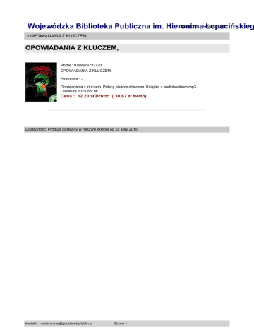 Utworzono : 04Łopacińskieg March 2017 Wojewódzka Biblioteka Publiczna im. Hieronima > OPOWIADANIA Z KLUCZEM, OPOWIADANIA Z KLUCZEM, Model : 9788376723730 OPOWIADANIA Z KLUCZEM, Producent : Opowiadania z kluczem, Polscy pisarze dzieciom. Książka z audiobookiem mp3..., Literatura 2015 opr.tw. Cena : 32,20 zł Brutto ( 30,67 zł Netto) Dostępność: Produkt dostępny w naszym sklepie od 22 May 2015 kontakt : - [email protected] Strona 1