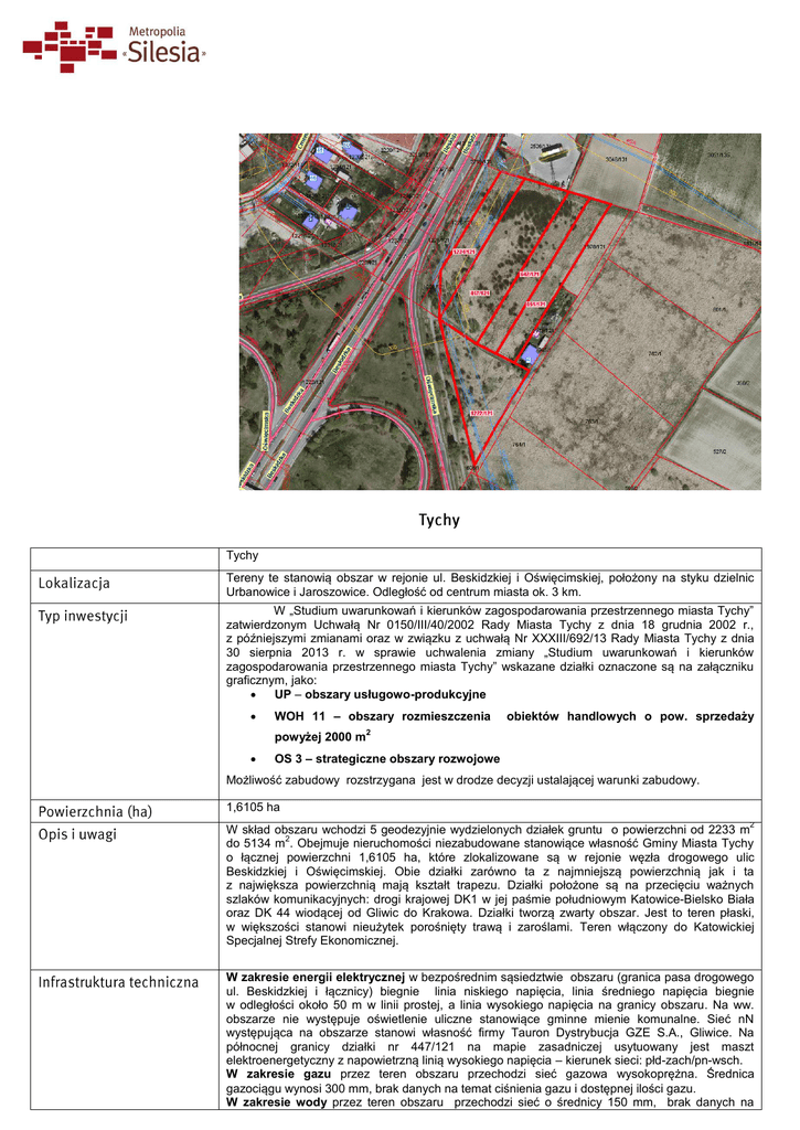 Tychy Tereny te stanowią obszar w rejonie ul. Beskidzkiej i Oświęcimskiej, położony na styku dzielnic Urbanowice i Jaroszowice. Odległość od centrum miasta ok. 3 km. W „Studium uwarunkowań i kierunków zagospodarowania przestrzennego miasta Tychy” zatwierdzonym Uchwałą Nr 0150/III/40/2002 Rady Miasta Tychy z dnia 18 grudnia 2002 r., z późniejszymi zmianami oraz w związku z uchwałą Nr XXXIII/692/13 Rady Miasta Tychy z dnia 30 sierpnia 2013 r. w sprawie uchwalenia zmiany „Studium uwarunkowań i kierunków zagospodarowania przestrzennego miasta Tychy” wskazane działki oznaczone są na załączniku graficznym, jako: UP – obszary usługowo-produkcyjne WOH 11 – obszary rozmieszczenia powyżej 2000 m obiektów handlowych o pow. sprzedaży 2 OS 3 – strategiczne obszary rozwojowe Możliwość zabudowy rozstrzygana jest w drodze decyzji ustalającej warunki zabudowy. 1,6105 ha 2 W skład obszaru wchodzi 5 geodezyjnie wydzielonych działek gruntu o powierzchni od 2233 m 2 do 5134 m . Obejmuje nieruchomości niezabudowane stanowiące własność Gminy Miasta Tychy o łącznej powierzchni 1,6105 ha, które zlokalizowane są w rejonie węzła drogowego ulic Beskidzkiej i Oświęcimskiej. Obie działki zarówno ta z najmniejszą powierzchnią jak i ta z największa powierzchnią mają kształt trapezu. Działki położone są na przecięciu ważnych szlaków komunikacyjnych: drogi krajowej DK1 w jej paśmie południowym Katowice-Bielsko Biała oraz DK 44 wiodącej od Gliwic do Krakowa. Działki tworzą zwarty obszar. Jest to teren płaski, w większości stanowi nieużytek porośnięty trawą i zaroślami. Teren włączony do Katowickiej Specjalnej Strefy Ekonomicznej. W zakresie energii elektrycznej w bezpośrednim sąsiedztwie obszaru (granica pasa drogowego ul. Beskidzkiej i łącznicy) biegnie linia niskiego napięcia, linia średniego napięcia biegnie w odległości około 50 m w linii prostej, a linia wysokiego napięcia na granicy obszaru. Na ww. obszarze nie występuje oświetlenie uliczne stanowiące gminne mienie komunalne. Sieć nN występująca na obszarze stanowi własność firmy Tauron Dystrybucja GZE S.A., Gliwice. Na północnej granicy działki nr 447/121 na mapie zasadniczej usytuowany jest maszt elektroenergetyczny z napowietrzną linią wysokiego napięcia – kierunek sieci: płd-zach/pn-wsch. W zakresie gazu przez teren obszaru przechodzi sieć gazowa wysokoprężna. Średnica gazociągu wynosi 300 mm, brak danych na temat ciśnienia gazu i dostępnej ilości gazu. W zakresie wody przez teren obszaru przechodzi sieć o średnicy 150 mm, brak danych na temat ciśnienia wody i dostępnej ilości wody. Przez obszar przechodzi wodociąg przesyłowy Ø 1600 (Gocza II). Odległość kanalizacji sanitarnej od granicy działki wynosi dla sieci o średnicy Ø 200 około 230 m w linii prostej , wzdłuż ul. Oświęcimskiej, dla sieci o średnicy Ø 250 około 290 m w linii prostej , w ciągu ul. Goździków, a dla sieci o średnicy Ø 1000 około 500 m w linii prostej. Brak danych na temat ograniczenia zrzutu ścieków ilościowego i jakościowego. Odległość kanalizacji deszczowej od granicy działki wynosi w linii prostej około 110 m dla średnicy kolektora deszczowego wynoszącego Ø 300 (wzdłuż ul. Oświęcimskiej), około 300 m dla średnicy kolektora deszczowego wynoszącego Ø 315, (w ciągu ul. Goździków), około 125 m dla średnicy kolektora deszczowego wynoszącego Ø 400 (wzdłuż ul. Oświęcimskiej ) i około 35 m dla średnicy kolektora deszczowego wynoszącego Ø 600 ( w ciągu ul. Beskidzkiej ). Całość wód deszczowych przewidzianych do odprowadzenia powinna odpowiadać warunkom określonym w Rozporządzeniu Ministra Środowiska z 24 lipca 2006 r. w sprawie warunków, jakie należy spełnić przy wprowadzaniu ścieków do wód lub do ziemi oraz w sprawie substancji szczególnie szkodliwych dla środowiska wodnego (Dz.U. z 2006 r. Nr 137 poz. 984 z późn. zm.). Proponuje się odprowadzenie wód deszczowych do rowu przebiegającego w obrębie działek nr 198/9, 1043/8, 1049/8, 1042/8, 1050/8, 1053/8, 202/12, 147/13, 148/13, 751/14, 614/16, 744/15, 745/15. Odprowadzenie wód deszczowych do ww. odbiornika możliwe będzie pod warunkiem jego wydzielenia, uregulowania stanu prawnego gruntów pod ciekiem oraz przeprowadzenia modernizacji w celu jego dostosowania do odbioru wód z projektowanej zabudowy oraz terenu. Na wykonanie urządzeń wodnych i odprowadzenie wód opadowych z terenu planowanej inwestycji zgodnie z art. 122 ust.1 pkt 1, 3 ustawy z dnia 18 lipca 2001 r. Prawo wodne (Dz.U. z 2001, Nr 115, poz. 1229 z późn. zm.) należy uzyskać pozwolenie wodnoprawne. Przebudowa urządzeń wodnych zgodnie z art. 9 ust. 2 pkt 2 ustawy z dnia 18 lipca 2001 r. Prawo wodne (Dz.U. z 2001, Nr 115, poz. 1229 z późn. zm.), wymaga uzyskania pozwolenia wodnoprawnego. Na terenie obszaru i w bezpośrednim jego sąsiedztwie nie ma oczyszczalni ścieków, a najbliższa oczyszczalnia znajduje się w Tychach-Urbanowicach. Odległość przyłącza sieci telekomunikacyjnej od granicy obszaru wynosi około 45 m w linii prostej. W zakresie liczby dostępnych linii analogowych i linii ISDN brak danych. Nieruchomości te położone są na terenie atrakcyjnym pod względem swobody komunikacyjnej tj. posiadają dostęp do autostrady A4- węzeł Mysłowice- Brzęczkowice (z S1) – około 16,4 km, węzeł Katowice-Murckowska (z DK 86) – około 14,5 km., dróg krajowych DK1 i DK44 oraz bocznicy kolejowej – około 5,8 km. Odległość od ul. Beskidzkiej wynosi odpowiednio: około 25 m w linii prostej, bez możliwości zjazdu w stronę obszaru, około 150 m poprzez drogę gruntową równoległą do DK1 ze zjazdem do salonu samochodowego oraz stacji benzynowej oraz około 450 m poprzez pola uprawne i ul. Goździków. Odległość od DK44 wynosi około 160 m od rozwidlenia łącznicy i ul. Oświęcimskiej bez możliwości zjazdu w stronę obszaru. W bezpośred