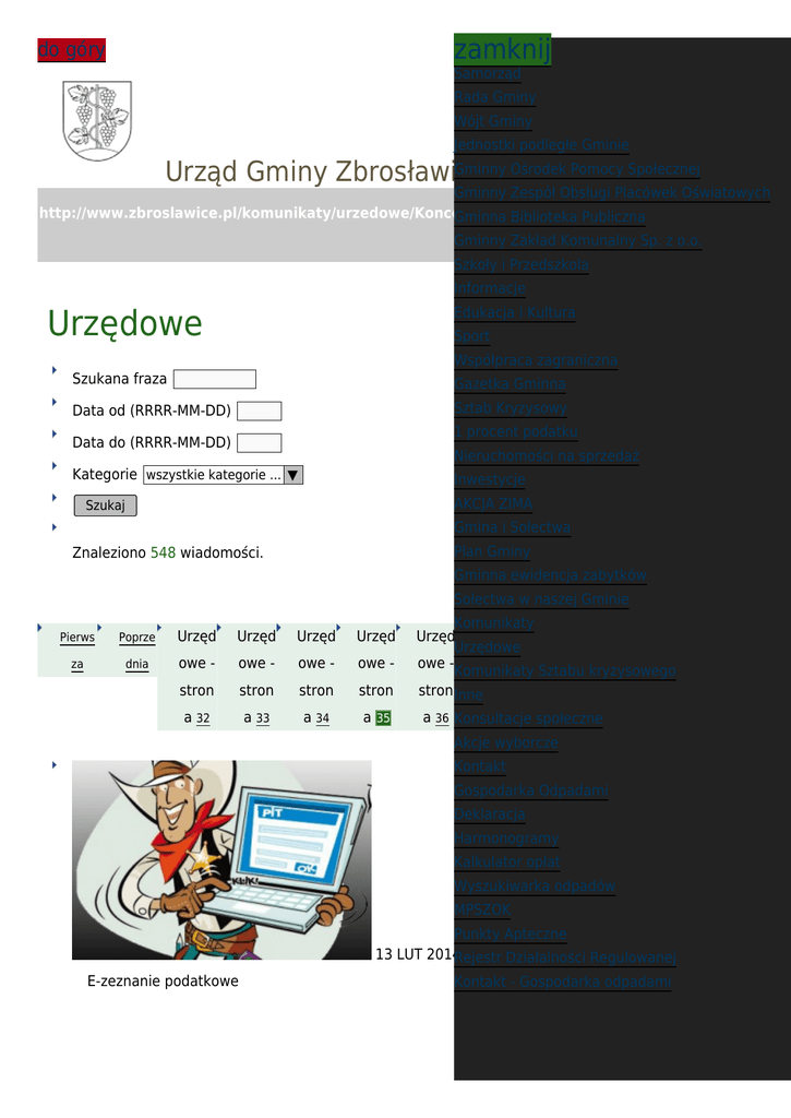 zamknij do góry Samorząd Rada Gminy Wójt Gminy Jednostki podległe Gminie Gminny Ośrodek Pomocy Społecznej Urząd Gminy Zbrosławice Gminny Zespół Obsługi Placówek Oświatowych http://www.zbroslawice.pl/komunikaty/urzedowe/Koncert-Mala-Akademia-Gitary-i-Spiewu/id/ Gminna Biblioteka Publiczna Gminny Zakład Komunalny printpdf/st:35 Sp. z o.o. Szkoły i Przedszkola Informacje Urzędowe Edukacja i Kultura Sport Współpraca zagraniczna Szukana fraza Gazetka Gminna Data od (RRRR-MM-DD) Sztab Kryzysowy 1 procent podatku Data do (RRRR-MM-DD) Nieruchomości na sprzedaż Kategorie wszystkie kategorie ... ▼ Inwestycje AKCJA ZIMA Szukaj Gmina i Sołectwa Plan Gminy Znaleziono 548 wiadomości. Gminna ewidencja zabytków Sołectwa w naszej Gminie Pierws Poprze Urzęd Urzęd Urzęd Urzęd za dnia owe - owe - owe - owe - stron stron stron stron a 32 a 33 a 34 a 35 Komunikaty Urzęd Urzęd Urzęd Następ Ostatni Urzędowe owe owe owe na a Komunikaty Sztabu kryzysowego stron Innestron stron a 36 Konsultacje a 37 a 38 społeczne Akcje wyborcze Kontakt Gospodarka Odpadami Deklaracja Harmonogramy Kalkulator opłat Wyszukiwarka odpadów MPSZOK Punkty Apteczne 13 LUT 2014Rejestr Działalności Regulowanej E-zeznanie podatkowe kategoria: Kontakt - Gospodarka odpadami Komunikaty urzędowe Naczelnik Urzędu Skarbowego w Tarnowskich Górach zaprasza na szkolenie multimedialne dotyczące elektronicznego wysyłania zeznań, które odbędzie się w Urzędzie Skarbowym w Tarnowskich Górach w sali nr 39 II piętro o godzinie 16:00 w poniedziałki: 24.02.2014, 10.03.2014, 24.03.2014.Ponadto od 10.02.2014 roku do 25.04.2014 roku w godzinach od 8:00 do 14:00 w tamtejszym Urzędzie na Sali A na stanowisku nr 7 uruchomiony został punkt 07 LUT 2014 Marek Minkus Człowiekiem Roku 2013 Powiatu Tarnogórskiego! kategoria: Komunikaty urzędowe Choć oficjalne wyniki nie zostały jeszcze podane, to my już wiemy - Marek Minkus został wybrany Człowiekiem Roku 2013 Powiatu Tarnogórskiego!W zakończonym 3 lutego plebiscycie Dziennika Zachodniego oraz serwisu naszemiasto.pl organizowanym przez „Polskapresse” Sp. z o.o. mieszkańcy powiatu nie pozostawili wątpliwości, komu ten tytuł się należy. Marek Minkus otrzymał ponad dwukrotnie więcej głosów (1277) od Marii Ożgi, 07 LUT 2014 "Nie bądź jeleń, weź paragon!" kategoria: Komunikaty urzędowe Zakład Gospodarki Komunalnej i Mieszkaniowej w Zbrosławicach informuje, że w dniu dzisiejszym, tj. 5 lutego, w miejscowościach Zbrosławice, Ptakowice i Wilkowice w godzinach 9.50 – 18.00 nastąpi przerwa w dostawie wody, spowodowana awarią sieci wodociągowej. Za utrudnienia przepraszamy! 07 LUT 2014 kategoria: Kasa urzędu czynna krócej w piątek Komunikaty urzędowe W związku z remontem pomieszczenia kasy Urzedu Gminy Zbrosławice przy ul. Oświęcimskiej 2 7 lutego (piątek) KASA będzie czynna do godziny 10:00 05 LUT 2014 AWARIA SIECI WODOCIĄGOWEJ kategoria: Komunikaty urzędowe Zakład Gospodarki Komunalnej i Mieszkaniowej w Zbrosławicach informuje, że w dniu dzisiejszym, tj. 5 lutego, w miejscowościach Zbrosławice, Ptakowice i Wilkowice w godzinach 9.50 – 18.00 nastąpi przerwa w dostawie wody, spowodowana awarią sieci wodociągowej. Za utrudnienia przepraszamy! 29 STY 2014 kategoria: Obowiązek informowania o azbeście Komunikaty urzędowe Wójt Gminy Zbrosławice przypomina, że osoby fizyczne mają obowiązek co roku, do dnia 31 stycznia przekazywać informacje o rodzaju, ilości i miejscach występowania wyrobów azbestowych.W związku z powyższym Wójt Gminy Zbrosławice zwraca się do mieszkańców Gminy, którzy nie dopełnili ww. obowiązku o dostarczenie do Urzędu Gminy Zbrosławice wypełnionego formularza „Informacji o wyrobach zawierających azbest". W celu 23 STY 2014 Akcja Zima kategoria: Komunikaty urzędowe Koordynatorem oraz osobą nadzorującą prowadzoną Akcję Zima na poziomie gminy jest Naczelnik Wydziału Gospodarki Komunalnej Pan Jakub Kukliński (tel. 604 417 895 i 32 666 44 01) oraz Zastępca Naczelnika w/w Wydziału Pan Rafał Barszcz (tel. 696 434 681 i 32 666 44 00).Generalnym Wykonawcą jest Zakład Gospodarki Komunalnej i Mieszkaniowej z siedzibą w Zbrosławicach przy ul. Oświęcimskiej 6.Dyżury Akcji Zimowej prowadzone będą 22 STY 2014 Halowe Regionalne Zawody Konne 15 STY 2014 kategoria: Rozstrzygnięcie otwartego konkursu ofert Komunikaty urzędowe Rozstrzygnięcie otwartego konkursu ofert na realizację zadania publicznego Gminy Zbrosławice w 2014 roku w zakresie wspierania i upowszechniania kultury fizycznej. Dokument do pobrania tutaj 09 STY 2014 Koncert noworoczny WOŚP Pierws Poprze Urzęd Urzęd Urzęd Urzęd Urzęd Urzęd Urzęd Następ Ostatni za dnia owe - owe - owe - owe - owe - owe - owe - na a stron stron stron stron stron stron stron a 32 a 33 a 34 a a 36 a 37 a 38 35