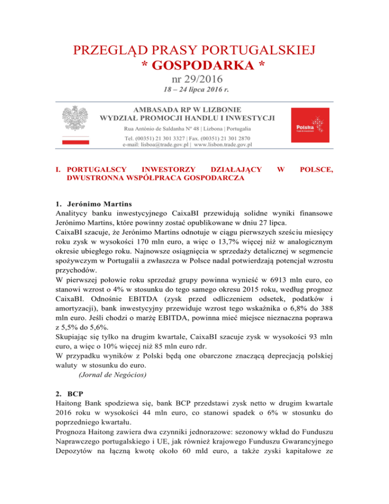 PRZEGLĄD PRASY PORTUGALSKIEJ * GOSPODARKA * nr 29/2016 18 – 24 lipca 2016 r. AMBASADA RP W LIZBONIE WYDZIAŁ PROMOCJI HANDLU I INWESTYCJI Rua António de Saldanha Nº 48 | Lizbona | Portugalia Tel. (00351) 21 301 3327 | Fax. (00351) 21 301 2870 e-mail: [email protected] | www.lisbon.trade.gov.pl I. PORTUGALSCY INWESTORZY DZIAŁAJĄCY DWUSTRONNA WSPÓŁPRACA GOSPODARCZA W POLSCE, 1. Jerónimo Martins Analitycy banku inwestycyjnego CaixaBI przewidują solidne wyniki finansowe Jerónimo Martins, które powinny zostać opublikowane w dniu 27 lipca. CaixaBI szacuje, że Jerónimo Martins odnotuje w ciągu pierwszych sześciu miesięcy roku zysk w wysokości 170 mln euro, a więc o 13,7% więcej niż w analogicznym okresie ubiegłego roku. Najnowsze osiągnięcia w sprzedaży detalicznej w segmencie spożywczym w Portugalii a zwłaszcza w Polsce nadal potwierdzają potencjał wzrostu przychodów. W pierwszej połowie roku sprzedaż grupy powinna wynieść w 6913 mln euro, co stanowi wzrost o 4% w stosunku do tego samego okresu 2015 roku, według prognoz CaixaBI. Odnośnie EBITDA (zysk przed odliczeniem odsetek, podatków i amortyzacji), bank inwestycyjny przewiduje wzrost tego wskaźnika o 6,8% do 388 mln euro. Jeśli chodzi o marżę EBITDA, powinna mieć miejsce nieznaczna poprawa z 5,5% do 5,6%. Skupiając się tylko na drugim kwartale, CaixaBI szacuje zysk w wysokości 93 mln euro, a więc o 10% więcej niż 85 mln euro rdr. W przypadku wyników z Polski będą one obarczone znaczącą deprecjacją polskiej waluty w stosunku do euro. (Jornal de Negócios) 2. BCP Haitong Bank spodziewa się, bank BCP przedstawi zysk netto w drugim kwartale 2016 roku w wysokości 44 mln euro, co stanowi spadek o 6% w stosunku do poprzedniego kwartału. Prognoza Haitong zawiera dwa czynniki jednorazowe: sezonowy wkład do Funduszu Naprawczego portugalskiego i UE, jak również krajowego Funduszu Gwarancyjnego Depozytów na łączną kwotę około 60 mld euro, a także zyski kapitałowe ze PRZEGLĄD PRASY PORTUGALSKIEJ “GOSPODARKA” - nr 29/2016 sprzedaży udziałów posiadanych przez polską spółkę zależną w Visa Europe w wysokości ok. 58 mln euro. Na rynku portugalskim Haitong oczekuje strat netto w wysokości 12 mln euro w drugim kwartale 2016 roku, spowodowanych wkładem do Funduszu Gwarancji Depozytów oraz Funduszu Naprawczego. Wyłączając ten sezonowy wpływ, Haitong Bank przewiduje wzrost o 28% w zakresie wyników przed dokonaniem odpisów na rezerwy, wspierany przez rosnące przychody odsetkowe netto (osiągnięty poprzez obniżenie kosztów finansowania za pomocą depozytów) oraz poprawę wyników handlowych z poprzedniego kwartału. Do tych dwóch komponentów dochodzi niewielki spadek w wysokości 3% w zakresie rezerw, co wyjaśnia poprawę powtarzalnych wyników krajowych, z 2 mln euro w I kwartale, do 33 mln euro w II kwartale. Na arenie międzynarodowej oczekiwana jest poprawa dochodu netto w stosunku do poprzedniego kwartału o 24%, tj. z 45 mln euro do 55 mln euro. Jednak, jak już wspomniano, zawdzięczana jest ona jednorazowym zyskom kapitałowym ze sprzedaży Visa Europa w Polsce. Wykluczając tę pozycję przewiduje się spadek o 10% podstawowego zysku netto głównie w wyniku znacznego osłabienia złotego (Polska) i meticalu (Mozambik). Oczekuje się także pewnego wzrostu rezerw w Polsce w porównaniu do poprzedniego kwartału i utrzymania kosztów ryzyka na poziomie 55 punktów bazowych w II kwartale, co jest zgodne ze średnią z 2015 roku oraz reprezentuje wzrost w porównaniu do 37 punktów bazowych odnotowanych w ostatnim kwartale przez polską spółkę zależną. BCP zwrócił się już do EBC o pozwolenie na spłatę pierwszej części 200-250 mln euro ostatniej transzy pożyczki (750 mln euro), jaką musi oddać w instrumentach CoCos na rzecz portugalskiego państwa. Instrument ten musi być przekształcony w kapitał do końca miesiąca czerwca 2017 roku, z rabatem 35% w stosunku do cen rynkowych. Wskaźnik kapitału CET1 BCP w wersji fully loaded spada z 10,1% w marcu 2016 r. do 9,5% pro-forma ze względu na spłatę 250 mln euro. Każda informacja na temat negocjacji spłaty z regulatorami może mieć ważne następstwa dla ceny akcji BCP. Zielone światło dla pierwszej spłaty transzy może wskazywać, że EBC akceptuje pozycję kapitałową i ryzyko BCP. Jednakże, jeśli nie zostanie ona ostatecznie zatwierdzona, lub jeśli zostanie odroczona, może mieć negatywne skutki dla BCP. Bank BCP przedstawi wyniki półroczne w dniu 27 lipca 2016 roku. (Diário Económico) 3. Efacec Firma Efacec wygrała znaczący kontrakt z Porsche na dostawę szybkich ładowarek dla pojazdów elektrycznych tej marki. Będą to pierwsze ładowarki na świecie o mocy 320 KW. 2| PRZEGLĄD PRASY PORTUGALSKIEJ “GOSPODARKA” - nr 29/2016 Efacec, światowy lider w dziedzinie infrastruktury szybkiego ładowania dla pojazdów elektrycznych, dostarczy „pod klucz” tego typu urządzenia w różnych miejscach w Europie. Ładowarki „made in” Efacec są przeznaczone do wewnętrznego użytku Porsche do pojazdów o napędzie elektrycznym o wysokim napięciu i mocy 320 kW na wyjściu. Obecnie pojazdy elektryczne wykorzystują 50 kW do szybkiego ładowania, więc urządzenia te są pierwszymi na świecie zapewniającymi taką moc. Urządzenia Efacec są wykorzystywane w wielu krajach, zwłaszcza w Europie i Stanach Zjednoczonych, a także w kilku innych regionach, jak na Bliskim Wschodzie, w Ameryce Łacińskiej, Azji i Afryki. Oferta Efacec jest bardzo kompletna, jako że oprócz szybkiego ładowania, dostarcza rozwiązania dla ładowania prywatnego i publicznego, a także dla transportu publicznego. Prezes Efacec podkreśla, że firma w dziedzinie mobilności elektrycznej współpracuje z wszystkimi markami grupy Volkswagen, a wszyscy główni producenci pracujący nad produktami w tym segmencie, czy to w 100% elektrycznymi, czy też hybrydowymi 'plug-in', utrzymują bardzo bliskie r