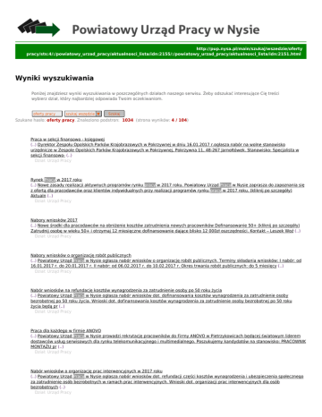 http://pup.nysa.pl/main/szukaj/wszedzie/oferty pracy/sts:4/:/powiatowy_urzad_pracy/aktualnosci_lista/idn:2155/:/powiatowy_urzad_pracy/aktualnosci_lista/idn:2151.html Wyniki wyszukiwania Poniżej znajdziesz wyniki wyszukiwania w poszczególnych działach naszego serwisu. Żeby odszukać interesujące Cię treści wybierz dział, który najbardziej odpowiada Twoim oczekiwaniom. oferty pracy szukaj wszędzie ▼ Szukaj Szukane hasło: oferty pracy. Znaleziono podstron: 1034 (strona wyników: 4 / 104) 31 Praca w sekcji finansowo - księgowej (..) Dyrektor Zespołu Opolskich Parków Krajobrazowych w Pokrzywnej w dniu 16.01.2017 r.ogłasza nabór na wolne stanowisko urzędnicze w Zespole Opolskich Parków Krajobrazowych w Pokrzywnej, Pokrzywna 11, 48-267 Jarnołtówek. Stanowisko: Specjalista w sekcji finansowo- (..) Dział: Urząd Pracy 32 Rynek Pracy w 2017 roku (..) Nowe zasady realizacji aktywnych programów rynku pracy w 2017 roku. Powiatowy Urząd Pracy w Nysie zaprasza do zapoznania się z ofertą dla pracodawców oraz klientów indywidualnych przy realizacji programów rynku pracy w 2017 roku. (kliknij po szczegóły) Aktualn (..) Dział: Urząd Pracy 33 Nabory wniosków 2017 (..) Nowe środki dla pracodawców na obniżenie kosztów zatrudnienia nowych pracowników Dofinansowanie 50+ (kliknij po szczegóły) Zatrudnij osobę w wieku 50+ i otrzymaj 12 miesięczne dofinansowanie dające blisko 12 000zł oszczędności. Kontakt – Leszek Woź (..) Dział: Urząd Pracy 34 Nabory wniosków o organizację robót publicznych (..) Powiatowy Urząd Pracy w Nysie ogłasza nabór wniosków o organizację robót publicznych. Terminy składania wniosków: I nabór: od 16.01.2017 r. do 20.01.2017 r. II nabór: od 06.02.2017 r. do 10.02.2017 r. Okres trwania robót publicznych: do 5 miesięcy (..) Dział: Urząd Pracy 35 Nabór wniosków na refundację kosztów wynagrodzenia za zatrudnienie osoby po 50 roku życia (..) Powiatowy Urząd Pracy w Nysie ogłasza nabór wniosków dot. dofinansowania kosztów wynagrodzenia za zatrudnienie osoby bezrobotnej po 50 roku życia. Wnioski dot. dofinansowania kosztów wynagrodzenia za zatrudnienie osoby bezrobotnej po 50 roku życia będą pr (..) Dział: Urząd Pracy 36 Praca dla każdego w firmie ANOVO (..) Powiatowy Urząd Pracy w Nysie prowadzi rekrutację pracowników do Firmy ANOVO w Pietrzykowicach będącej światowym liderem dostawców usług serwisowych dla rynku telekomunikacyjnego i multimedialnego. Poszukujemy kandydatów na stanowisko: PRACOWNIK MONTAŻU pr (..) Dział: Urząd Pracy 37 Nabór wniosków o organizację prac interwencyjnych w 2017 roku (..) Powiatowy Urząd Pracy w Nysie ogłasza nabór wniosków dot. refundacji części kosztów wynagrodzenia i ubezpieczenia społecznego za zatrudnienie osób bezrobotnych w ramach prac interwencyjnych. Wnioski dot. organizacji prac interwencyjnych dla osób bezrobotnych (..) Dział: Urząd Pracy 38 Pracuj w firmie Amazon (..) Powiatowy Urząd Pracy w Nysie prowadzi rekrutację dla amerykańskiego przedsiębiorstwa handlowego Amazon na stanowisko: Pracownik magazynu miejsce pracy: Bielany Wrocławskie Wymagania pracodawcy: - chęci do pracy, - zdolność do podnoszenia ciężarów do 15 k (..) Dział: Urząd Pracy 39 Praca w MEDIA EXPERT w Nysie (..) Powiatowy Urząd Pracy w Nysie prowadzi rekrutację do firmy TERG.Poszukujemy kandydatów na stanowisko: SPRZEDAWCA/DORADCA KLIENTA Wymagania pracodawcy:- wykształcenie min.średnie- zainteresowanie branżą RTV, AGDdoświadczenie w sprzedaży bezpośredniej o (..) Dział: Urząd Pracy 40 Praca w firmie Dagny (..) Poszukujemy osób chętnych do pracy w renomowanej nyskiej firmie istniejącej od 1908 roku. Firma Dagny jest znanym producentem lizaków i krówek. Oferuje zatrudnienie na następujących stanowiskach: 1. Sprzątaczka – wykształcenie zawodowe, sumienno (..) Dział: Urząd Pracy ● ● ● ● ● ● ● ● ● ● ● 1 2 3 4 5 6 7 8 9 Następna > Ostatnia »