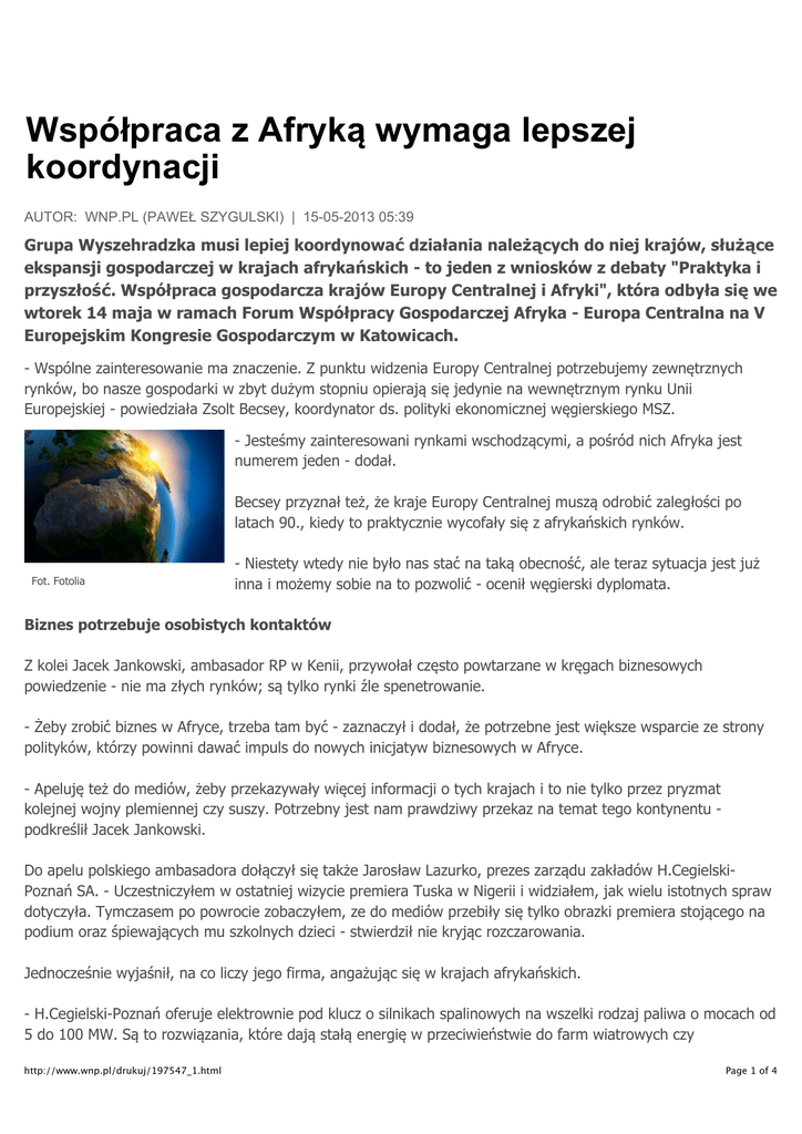 Wspó!praca z Afryk" wymaga lepszej koordynacji AUTOR: WNP.PL (PAWE$ SZYGULSKI) | 15-05-2013 05:39 Grupa Wyszehradzka musi lepiej koordynowa! dzia"ania nale#$cych do niej krajów, s"u#$ce ekspansji gospodarczej w krajach afryka%skich - to jeden z wniosków z debaty "Praktyka i przysz"o&!. Wspó"praca gospodarcza krajów Europy Centralnej i Afryki", która odby"a si' we wtorek 14 maja w ramach Forum Wspó"pracy Gospodarczej Afryka - Europa Centralna na V Europejskim Kongresie Gospodarczym w Katowicach. - Wspólne zainteresowanie ma znaczenie. Z punktu widzenia Europy Centralnej potrzebujemy zewn!trznych rynków, bo nasze gospodarki w zbyt du"ym stopniu opieraj# si! jedynie na wewn!trznym rynku Unii Europejskiej - powiedzia$a Zsolt Becsey, koordynator ds. polityki ekonomicznej w!gierskiego MSZ. - Jeste%my zainteresowani rynkami wschodz#cymi, a po%ród nich Afryka jest numerem jeden - doda$. Becsey przyzna$ te", "e kraje Europy Centralnej musz# odrobi& zaleg$o%ci po latach 90., kiedy to praktycznie wycofa$y si! z afryka'skich rynków. Fot. Fotolia - Niestety wtedy nie by$o nas sta& na tak# obecno%&, ale teraz sytuacja jest ju" inna i mo"emy sobie na to pozwoli& - oceni$ w!gierski dyplomata. Biznes potrzebuje osobistych kontaktów Z kolei Jacek Jankowski, ambasador RP w Kenii, przywo$a$ cz!sto powtarzane w kr!gach biznesowych powiedzenie - nie ma z$ych rynków; s# tylko rynki (le spenetrowanie. - )eby zrobi& biznes w Afryce, trzeba tam by& - zaznaczy$ i doda$, "e potrzebne jest wi!ksze wsparcie ze strony polityków, którzy powinni dawa& impuls do nowych inicjatyw biznesowych w Afryce. - Apeluj! te" do mediów, "eby przekazywa$y wi!cej informacji o tych krajach i to nie tylko przez pryzmat kolejnej wojny plemiennej czy suszy. Potrzebny jest nam prawdziwy przekaz na temat tego kontynentu podkre%li$ Jacek Jankowski. Do apelu polskiego ambasadora do$#czy$ si! tak"e Jaros$aw Lazurko, prezes zarz#du zak$adów H.CegielskiPozna' SA. - Uczestniczy$em w ostatniej wizycie premiera Tuska w Nigerii i widzia$em, jak wielu istotnych spraw dotyczy$a. Tymczasem po powrocie zobaczy$em, ze do mediów przebi$y si! tylko obrazki premiera stoj#cego na podium oraz %piewaj#cych mu szkolnych dzieci - stwierdzi$ nie kryj#c rozczarowania. Jednocze%nie wyja%ni$, na co liczy jego firma, anga"uj#c si! w krajach afryka'skich. - H.Cegielski-Pozna' oferuje elektrownie pod klucz o silnikach spalinowych na wszelki rodzaj paliwa o mocach od 5 do 100 MW. S# to rozwi#zania, które daj# sta$# energi! w przeciwie'stwie do farm wiatrowych czy http://www.wnp.pl/drukuj/197547_1.html Page 1 of 4 fotowoltanicznych. Przy tym, s# one bardzo potrzebne w Afryce, gdzie wyst!puj# du"e niedobory energii elektrycznej - powiedzia$ Lazurko. Dlatego pozna'ska firma od pewnego czasu zabiega o rynki pa'stw Afryki Zachodniej. - To bardzo dobry moment, by skoncentrowa& wysi$ki w tym celu. Zw$aszcza, "e dotychczasowi tamtejsi inwestorzy, g$ównie z krajów BRICKS, zd#"yli te" ju" pokaza& swoje s$abo%ci. My mo"emy to wykorzysta& - przekonywa$ Jaros$aw Lazurko, dodaj#c, "e jego firmie uda$o si! ju" przej#& jeden kontrakt, który nie by$ terminowo realizowany przez pierwotnego wykonawc!. - S$ysz!, "e jest wi!cej takich projektów i s$ysz! te" o chi'skiej jako%ci. Bo Chiny nie dostarczaj# tam produktów najwy"szej klasy i my%l!, "e to stwarza bardzo du"# szans! dla naszego biznesu - oceni$ prezes firmy H.Cegielski-Pozna' SA. Coraz mniejsze ryzyko Z kolei Artur Zdybicki, prezes dzia$aj#cej m.in. w Senegalu firmy Fair Minds zauwa"y$, "e nie nale"y tylko zwraca& uwagi na zaanga"owanie polityków z Europy Centralnej, ale przede wszystkim szuka& wsparcia u polityków afryka'skich. - Bardzo wa"n# rzecz# jest to, by%my nie bali si! tamtejszych polityków. Nale"y z nimi rozmawia& i prosi& ich o wsparcie, bo oni chc# przecie" rozwija& Afryk! i przez to s# otwarci na kontakt z nami - t$umaczy$. Powo$ywa$ si! przy tym na do%wiadczenia, które zebra$ osobi%cie w trakcie kilkuletniej swojej dzia$alno%ci na Czarnym L#dzie. - Od d$u"szego czasu mamy ju" biuro w Dakarze i musze powiedzie&, "e jestem zachwycony Senegalczykami i czuj! si! w ich kraju bardzo bezpiecznie - stwierdzi$ Artur Zdybicki. Kwestii bezpiecze'stwa dotkn!li te" obecni na sesji przedstawiciele tego kraju, którzy starali si! przekonywa&, "e tradycyjny obraz Afryki jako miejsca niebezpiecznego i ma$o stabilnego ma coraz mniej wspólnego z rzeczywisto%ci#. - Senegal wzmacnia instytucje pa'stwowe tak, by zapewni& inwestorom poczucie bezpiecze'stwa. Bo jest ono podstawowym warunkiem, by w ogóle mówi& o wspó$pracy - stwierdzi$ Diene Farba Sarr, dyrektor generalny APIX, agencji promuj#cej inwestycje w Senegalu. Przyk"ady udanej ekspansji Go%cie z Afryki podkre%lali tez potrzeb! utrzymywania bezpo%rednich kontaktów przez przedsi!biorców z obu kontynentów. - Najpierw musimy si! dobrze pozna&, by potem przej%& do interesów. Potrzebne jest otwarcie na wzajemne relacje - przekonywa$ Baidy Agne, przewodnicz#cy senegalskiego National Council of Employers. - Pierwsze kontakty mamy ju" zreszt# za sob#. Zacz!li%my wspó$prac! z Grup# Azoty w zakresie transportu fosforytu do Polski. Mam nadziej!, "e to dopiero wst!p do pog$!bienia wspó$pracy gospodarczej - doda$. - Afryka'skie obroty Grupy Azoty wynosz# ju" oko$o 150 mln euro - wyja%ni$ Krzysztof Ja$osi'ski, wiceprezes zarz#du Grupy Azoty SA. - Generuje je zak$ad w Policach, który kupuje fosforyty w Maroku, Tunezji i Egipcie. Teraz do grona tych krajów do$#cza tak"e Senegal. http://www.wnp.pl/drukuj/197547_1.html Page 2 of 4 Ja$osi'ski przyzna$ jednak, "e nawi#zanie owocnej wspó$pracy zaj!$o w Senegalu ponad rok i wymaga$o znacznego zaanga"owania ze strony Grupy Azoty. - Pierwszy statek z fosforytami jest ju" tam jednak dla nas $adowany - poinformowa$. - Mamy tez projekty budowy pewnych fabryk w Senegalu i Maroku, które by$yby zwi#zane z surowcami - doda$ nieco tajemniczo. Wyja%ni$ te", "e w zamian za fosforyty, Grupa Azoty chce sprzedawa& do Afryki siark!
