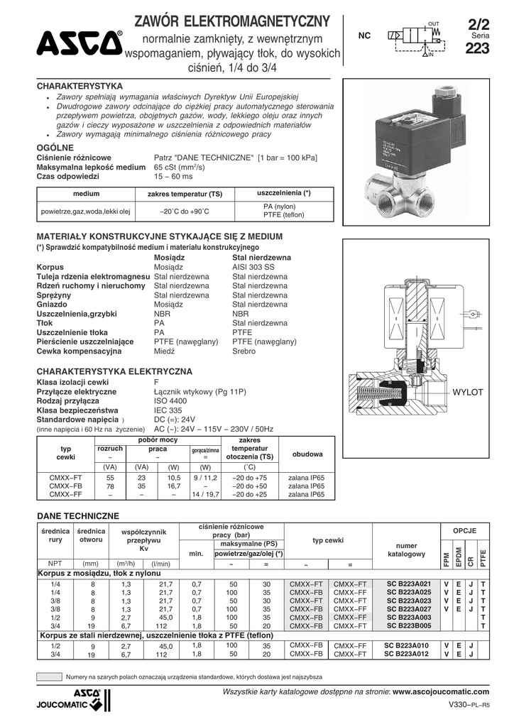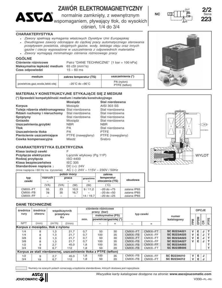 ZAWÓR ELEKTROMAGNETYCZNY 2/2 OUT NC normalnie zamknięty, z wewnętrznym wspomaganiem, pływający tłok, do wysokich ciśnień, 1/4 do 3/4 Seria 223 IN CHARAKTERYSTYKA Zawory spełniają wymagania właściwych Dyrektyw Unii Europejskiej Dwudrogowe zawory odcinające do ciężkiej pracy automatycznego sterowania przepływem powietrza, obojętnych gazów, wody, lekkiego oleju oraz innych gazów i cieczy wyposażone w uszczelnienia z odpowiednich materiałów Zawory wymagają minimalnego ciśnienia różnicowego pracy OGÓLNE Ciśnienie różnicowe Maksymalna lepkość medium Czas odpowiedzi Patrz "DANE TECHNICZNE" [1 bar = 100 kPa] 65 cSt (mm2/s) 15 − 60 ms medium zakres temperatur (TS) uszczelnienia (*) powietrze,gaz,woda,lekki olej −20˚C do +90˚C PA (nylon) PTFE (teflon) MATERIAŁY KONSTRUKCYJNE STYKAJĄCE SIĘ Z MEDIUM (*) Sprawdzić kompatybilność medium i materiału konstrukcyjnego Mosiądz Stal nierdzewna Korpus Mosiądz AISI 303 SS Tuleja rdzenia elektromagnesu Stal nierdzewna Stal nierdzewna Rdzeń ruchomy i nieruchomy Stal nierdzewna Stal nierdzewna Sprężyny Stal nierdzewna Stal nierdzewna Gniazdo Mosiądz Stal nierdzewna Uszczelnienia,grzybki NBR NBR Tłok PA Stal nierdzewna Uszczelnienie tłoka PA PTFE Pierścienie uszczelniające PTFE (nawęglany) PTFE (nawęglany) Cewka kompensacyjna Miedź Srebro CHARAKTERYSTYKA ELEKTRYCZNA Klasa izolacji cewki Przyłącze elektryczne Rodzaj przyłącza Klasa bezpieczeństwa Standardowe napięcia F Łącznik wtykowy (Pg 11P) ISO 4400 IEC 335 DC (=): 24V AC (~): 24V − 115V − 230V / 50Hz ) (inne napięcia i 60 Hz na życzenie) pobór mocy rozruch typ praca ~ ~ cewki (VA) (VA) (W) CMXX−FT CMXX−FB CMXX−FF 23 35 − 55 78 − 10,5 16,7 − = zakres temperatur otoczenia (TS) (W) 9 / 11,2 − 14 / 19,7 −20 do +75 −20 do +50 −20 do +25 gorąca/zimna WYLOT obudowa (˚C) zalana IP65 zalana IP65 zalana IP65 DANE TECHNICZNE (m3/h) (l/min) OPCJE typ cewki numer katalogowy ~ = ~ = 50 100 50 100 100 50 30 35 30 35 35 20 CMXX−FT CMXX−FB CMXX−FT CMXX−FB CMXX−FB CMXX−FB CMXX−FT CMXX−FF CMXX−FT CMXX−FF CMXX−FF CMXX−FT CMXX−FB CMXX−FB CMXX−FF CMXX−FT V V V V E E E E J J J J V V E E J J PTFE (mm) ciśnienie różnicowe pracy (bar) maksymalne (PS) min. powietrze/gaz/olej (*) CR NPT współczynnik przepływu Kv EPDM średnica otworu FPM średnica rury Korpus z mosiądzu, tłok z nylonu 1/4 1/4 3/8 3/8 1/2 3/4 8 8 8 8 9 19 1,3 1,3 1,3 1,3 2,7 6,7 21,7 21,7 21,7 21,7 45,0 112 0,7 0,7 0,7 0,7 1,8 1,8 SC B223A021 SC B223A025 SC B223A023 SC B223A027 SC B223A003 SC B223B005 T T T T T T Korpus ze stali nierdzewnej, uszczelnienie tłoka z PTFE (teflon) 1/2 3/4 9 19 2,7 6,7 45,0 112 1,8 1,8 100 50 35 20 SC B223A010 SC B223A012 Numery na szarych polach oznaczają urządzenia standardowe, których dostawa jest najszybsza Wszystkie karty katalogowe dostępne na stronie: www.ascojoucomatic.com V330−PL−R5 ZAWORY ELEKTROMAGNETYCZNE SERIA 223 WYPOSAŻENIE DODATKOWE Zawory mogą być wyposażone w membrany i uszczelnienia z FPM (fluoroelastomer / viton), EPDM (etyleno−propylen), CR (chloropren / neopren) i PTFE (teflon). Użyć odpowiedniej końcówki literowej w zamówieniu dla identyfikacji. Obudowa wodoszczelna ze śrubowym mocowaniem kabla spełniającym warunki klasy zabezpieczenia IP67, CEE−10 Obudowa przeciwwybuchowa do pracy w obszarach zagrożonych zgodna z normą "CENELEC" i standardami narodowymi Obudowa przeciwwybuchowa i wodoszczelna zgodna z normą "NEMA" Zgodność ze standardami "UL" i "CSA" Wykonanie o małym poborze mocy Możliwość zamówienia zaworu normalnie otwartego Wtyczka ze wskaźnikiem wizualnym i/lub filtrem przeciwzakłóceniowym lub z kablem o długości 2 m INSTALACJA Zawory elektromagnetyczne mogą być montowane w dowolnej pozycji Rodzaj gwintu przyłącza rurowego: B = NPT (ANSI 1.20.3) Inne rodzaje gwintów przyłączy rurowych dostępne na życzenie Użytkownika Instrukcje instalacji i obsługi dostarczane do każdego zaworu Dostępny zestaw części zamiennych i wymienne cewki WYMIARY(mm), MASA(kg) 360˚ 360˚ WLOT WYLOT Rys. 1 Rys. 2 360˚ 360˚ Rys. 3 Rys. 4 numer katalogowy SCB223 A021− A025 − A023 −A027 A003 − A010 B005 A012 A B C D E F G H J K masa (1) (C) 80 80 80 80 50 50 50 50 30 30 30 30 20 31 34 29 65 81 91 88 45 45 45 45 46 − 50 89 72 78 91 88 86 109 127 126 103 126 144 143 0,7 1,0 1,5 4,0 rys. 1 rys. 2 rys. 3 rys. 4 (1) Przybliżona masa w kg razem z cewką i przyłączem elektrycznym (C) Typ konstrukcji Wszystkie karty katalogowe dostępne na stronie: www.ascojoucomatic.com V330−2