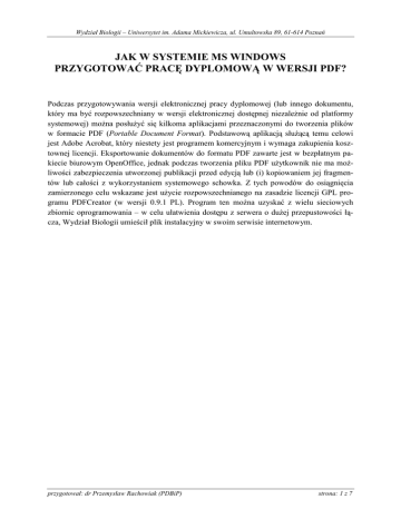 Wydział Biologii – Uniwersytet im. Adama Mickiewicza, ul. Umultowska 89, 61-614 Poznań JAK W SYSTEMIE MS WINDOWS PRZYGOTOWAĆ PRACĘ DYPLOMOWĄ W WERSJI PDF? Podczas przygotowywania wersji elektronicznej pracy dyplomowej (lub innego dokumentu, który ma być rozpowszechniany w wersji elektronicznej dostępnej niezaleŜnie od platformy systemowej) moŜna posłuŜyć się kilkoma aplikacjami przeznaczonymi do tworzenia plików w formacie PDF (Portable Document Format). Podstawową aplikacją słuŜącą temu celowi jest Adobe Acrobat, który niestety jest programem komercyjnym i wymaga zakupienia kosztownej licencji. Eksportowanie dokumentów do formatu PDF zawarte jest w bezpłatnym pakiecie biurowym OpenOffice, jednak podczas tworzenia pliku PDF uŜytkownik nie ma moŜliwości zabezpieczenia utworzonej publikacji przed edycją lub (i) kopiowaniem jej fragmentów lub całości z wykorzystaniem systemowego schowka. Z tych powodów do osiągnięcia zamierzonego celu wskazane jest uŜycie rozpowszechnianego na zasadzie licencji GPL programu PDFCreator (w wersji 0.9.1 PL). Program ten moŜna uzyskać z wielu sieciowych zbiornic oprogramowania – w celu ułatwienia dostępu z serwera o duŜej przepustowości łącza, Wydział Biologii umieścił plik instalacyjny w swoim serwisie internetowym. przygotował: dr Przemysław Rachowiak (PDBiP) strona: 1 z 7 Wydział Biologii – Uniwersytet im. Adama Mickiewicza, ul. Umultowska 89, 61-614 Poznań TWORZENIE PLIKU PDF – KROK PO KROKU Po skopiowaniu pliku instalacyjnego na twardy dysk komputera naleŜy uruchomić procedurę instalacyjną. W jej wyniku w systemowym menu ‘Start’ (w folderze ‘Wszystkie programy’) utworzony zostanie podfolder ‘PDFCreator’ zawierający skrót do aplikacji. Taki sam skrót utworzony zostanie na Pulpicie. Dodatkowym rezultatem procesu instalacji będzie zainstalowanie w systemie wirtualnej drukarki ‘PDFCreator’. Aplikacja instalowana jest w systemie w wersji anglojęzycznej, jednak istnieje moŜliwość zmiany konfiguracji programu i zmiany powłoki na polską. W tym celu po uruchomieniu PDFCreatora naleŜy wskazać ‘Language’ i z rozwijalnej listy wybrać ‘Polski’. Od tej chwili program będzie się komunikować z uŜytkownikiem w języku polskim. Konfiguracja programu PDFCreator (a w zasadzie drukarki) nie jest kłopotliwa, niemniej mało doświadczonym uŜytkownikom moŜe nastręczać trudności. Do opcji konfiguracyjnych dostęp uzyskuje się przez menu ‘Drukarka/Opcje’, jednak nie ma potrzeby dokonywania konfiguracji na zapas – w określonym momencie podczas tworzenia pliku PDF uŜytkownik uzyskuje bieŜący dostęp do wszystkich opcji konfiguracyjnych. Przed przystąpieniem do tworzenia pliku PDF naleŜy przygotować i wydrukować ‘papierową’ wersję dokumentu. Od tej chwili źródłowy plik tekstowy (z grafiką) przygotowany przy pomocy edytora tekstu staje się kopią archiwalną, a dalsze etapy pracy powinny odbywać się z wykorzystaniem kopii tego pliku. NaleŜy go otworzyć w edytorze tekstu i z menu ‘Plik/Drukuj’ otworzyć okno dialogowe drukowania. przygotował: dr Przemysław Rachowiak (PDBiP) strona: 2 z 7 Wydział Biologii – Uniwersytet im. Adama Mickiewicza, ul. Umultowska 89, 61-614 Poznań W oknie tym uŜytkownik z listy dostępnych drukarek wybrać musi uprzednio zainstalowaną drukarkę ‘PDFCreator’. W przypadku korzystania z edytora MS Word, gdy następuje zmiana wybranej drukarki, naleŜy w tym momencie nacisnąć przycisk ‘Zamknij’, co spowoduje przypisanie do dokumentu sterownika drukarki PDFCreator. PoniewaŜ zmiana sterownika moŜe mieć wpływ na formatowanie i układ dokumentu, zale1 ca się sprawdzenie, czy w dalszym ciągu tak formatowanie, jak i układ są identyczne z wykonanym wcześniej wydrukiem. Po sprawdzeniu całości i ewentualnych korektach moŜna dokument zapisać na twardym dysku (lub innym nośniku) oraz przystąpić 2 do dalszych etapów tworzenia pliku PDF. W tym celu w edytorze tekstu naleŜy ponownie wskazać menu ‘Plik/Drukuj’ i po sprawdzeniu, iŜ aktywną (wybraną) drukarką jest PDFCreator (1), nacisnąć klawisz ‘OK’ (2). Rozpoczyna się właściwy proces tworzenia pliku PDF. Otwarte zostanie nowe okno dialogowe. przygotował: dr Przemysław Rachowiak (PDBiP) strona: 3 z 7 Wydział Biologii – Uniwersytet im. Adama Mickiewicza, ul. Umultowska 89, 61-614 Poznań NaleŜy w nim kolejno: zaznaczyć pole ‘Po zapisaniu otwórz dokument domyślnym programem’ (1) oraz wybrać przycisk ‘Opcje’ (2). Wybranie pola ‘Po zapisaniu ...’ spowoduje, Ŝe po utworzeniu dokumentu PDF zostanie otwarta domyślna przeglądarka plików PDF (będzie to Adobe® AcrobatReader – o ile program został wcześniej zainstalowany w systemie), w której sprawdzić będzie moŜna poprawność utworzonego pliku. Naciśnięcie przycisku ‘Opcje’ daje 1 uŜytkownikowi dostęp do opcji konfiguracyjnych programu 2 i tworzenia pliku PDF. PDFCreator moŜe pracować w dwóch trybach zapisu pliku PDF: automatycznym lub w pełni 1 konfigurowalnym. W trybie automatycznym uŜytkownik moŜe nie 3 mieć kontroli nad miejscem zapi2 su oraz nad nazwą pliku – jest on zapisywany z nazwą, która w rzeczywistości jest podaną w postaci 14 cyfr datą i dokładnym czasem zapisu. Wymogi stawiane autorom prac dyplomowych narzucają określony wzorzec nazwy pliku PDF, w związku z czym konieczne staje się dokonanie prostych konfiguracyjnych. czynności W pierwszej kolejności – po wybraniu opcji ‘Dokument’ (1) naleŜy wybrać opcję ‘UŜywaj aktualnej daty/czasu jako daty utworzenia’ (2), po czym w lewej części okna dialogowego wskazać ‘Autozapis’ (3). W zmienionej prawej części okna dialogowego ‘Opcje’ uŜytkownik powinien pozostawić nie zaznaczoną opcję ‘UŜywaj funkcji autozapisu’, dzięki czemu podczas dalszych etapów przygotowywania pliku PDF zachowa pełną kontrolę nad miejscem zapisu pliku i jego nazwą
