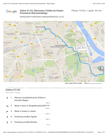 Zielna 41/43, Warszawa, Polska do Kopiec Powstania Warszawskiego – Mapy Google Zielna 41/43, Warszawa, Polska do Kopiec Powstania Warszawskiego 06/11/2015 14:08 Pieszo 7,0 km, 1 godz. 26 min WARSZAWA POWSTANIA WARSZAWSKIEGO CZ II Dane mapy ©2015 Google 500 m Zachowaj ostrożność – trasa może zawierać błędy lub przebiegać przez miejsca nienadające się do przejścia pieszo Zielna 41/43 Warszawa, Polska 1. Wyrusz na południe przez Zielna w kierunku Bagno 180 m 2. Skręć w lewo w Świętokrzyska/DW719 240 m 3. Skręć w prawo w Jasna 300 m 4. Kontynuuj wzdłuż Zgoda 180 m 5. Kontynuuj wzdłuż Bracka 72 m https://www.google.co.uk/maps/dir/52.2364571,21.0062675/52.22…4014e90b:0xd12d9198e906bf5a!2m2!1d21.0559497!2d52.2111203!3e2 Page 1 of 4 Zielna 41/43, Warszawa, Polska do Kopiec Powstania Warszawskiego – Mapy Google 6. 06/11/2015 14:08 Skręć lekko w prawo w Krucza 150 m 7. Skręć w lewo w Aleje Jerozolimskie/DW631 160 m 8. Skręć w prawo w Bracka 250 m 9. Jedź dalej prosto przez plac Trzech Krzyży 220 m 10. Skręć łagodnie w lewo, pozostając na plac Trzech Krzyży 72 m 11. Skręć w prawo, pozostając na plac Trzech Krzyży 39 m 12. Kontynuuj wzdłuż Wiejska Miejsce docelowe będzie po prawej stronie 300 m 27 min (2,2 km) Pomnik Polskiego Państwa Podziemnego i Armii Krajowej Jana Matejki, 00-489 Warszawa, Polska 13. Wyrusz na południowy wschód przez Wiejska w kierunku Jana Matejki 150 m 14. Skręć w lewo w Górnośląska 190 m 15. Kontynuuj wzdłuż Myśliwiecka Przejedź przez 1 rondo 1,2 km 16. Skręć w lewo w kierunku 29 Listopada 23 m 17. Skręć w prawo w kierunku 29 Listopada 8m 18. Skręć w lewo w kierunku 29 Listopada 85 m 19. Jedź dalej prosto przez 29 Listopada 450 m https://www.google.co.uk/maps/dir/52.2364571,21.0062675/52.22…4014e90b:0xd12d9198e906bf5a!2m2!1d21.0559497!2d52.2111203!3e2 Page 2 of 4 Zielna 41/43, Warszawa, Polska do Kopiec Powstania Warszawskiego – Mapy Google 20. 06/11/2015 14:08 Skręć w prawo w Czerniakowska 350 m 21. Skręć w lewo, pozostając na Czerniakowska 17 m 22. Skręć w prawo w Czerniakowska/Wisłostrada 250 m 23. Skręć w lewo w kierunku Zwierzyniecka 27 m 24. Skręć w prawo w kierunku Zwierzyniecka 7m 25. Skręć w lewo w kierunku Zwierzyniecka 16 m 26. Skręć w prawo w kierunku Zwierzyniecka 56 m 27. Skręć w lewo w kierunku Zwierzyniecka 93 m 28. Skręć w prawo w kierunku Zwierzyniecka 75 m 29. Skręć w lewo w kierunku Zwierzyniecka 3m 30. Skręć w prawo w Zwierzyniecka 57 m 31. Skręć w lewo w aleja Polski Walczącej 120 m 32. Skręć w lewo w Pułku AK "Broda" 55 m 33. Skręć w prawo w Bluszczańska 450 m 34. Skręć w lewo w Grupy AK "Północ" 450 m 35. Skręć w lewo w Bartycka 350 m 36. Skręć w lewo w aleja Godziny „W” 88 m https://www.google.co.uk/maps/dir/52.2364571,21.0062675/52.22…4014e90b:0xd12d9198e906bf5a!2m2!1d21.0559497!2d52.2111203!3e2 Page 3 of 4 Zielna 41/43, Warszawa, Polska do Kopiec Powstania Warszawskiego – Mapy Google 37. 06/11/2015 14:08 Skręć w lewo, pozostając na aleja Godziny „W” 210 m 38. Skręć w lewo w Kopiec Powstania Warszawskiego Miejsce docelowe będzie po prawej stronie 8m 59 min (4,8 km) Kopiec Powstania Warszawskiego Warszawa, Polska Te wskazówki służą tylko do planowania podróży. Faktyczna trasa może być inna ze względu na roboty drogowe, korki, warunki pogodowe lub inne zdarzenia – należy wziąć te czynniki pod uwagę. Należy przestrzegać wszystkich znaków i informacji podanych na trasie. https://www.google.co.uk/maps/dir/52.2364571,21.0062675/52.22…4014e90b:0xd12d9198e906bf5a!2m2!1d21.0559497!2d52.2111203!3e2 Page 4 of 4