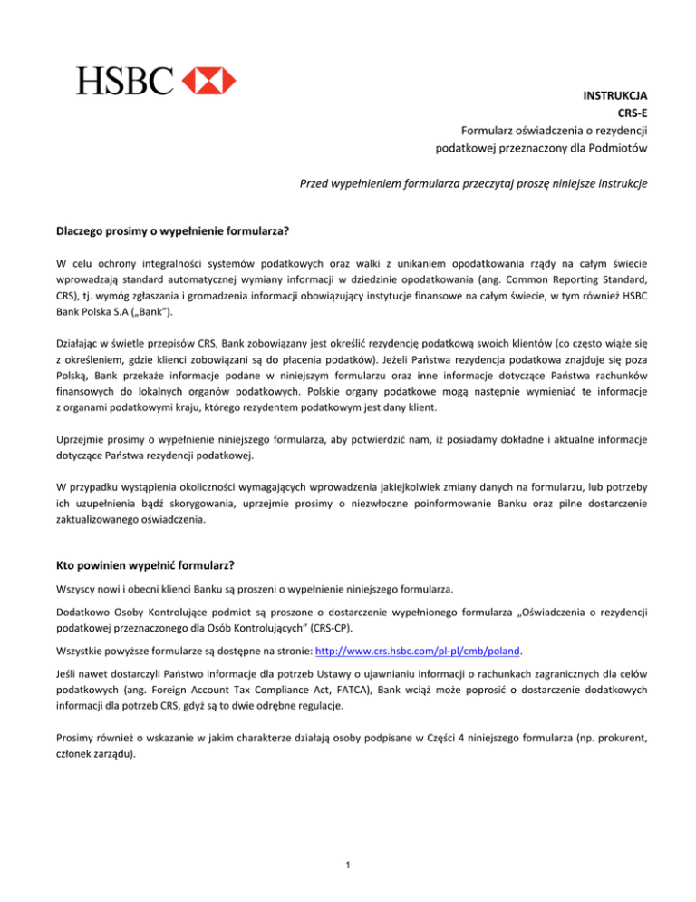 INSTRUKCJA CRS-E Formularz oświadczenia o rezydencji podatkowej przeznaczony dla Podmiotów Przed wypełnieniem formularza przeczytaj proszę niniejsze instrukcje Dlaczego prosimy o wypełnienie formularza? W celu ochrony integralności systemów podatkowych oraz walki z unikaniem opodatkowania rządy na całym świecie wprowadzają standard automatycznej wymiany informacji w dziedzinie opodatkowania (ang. Common Reporting Standard, CRS), tj. wymóg zgłaszania i gromadzenia informacji obowiązujący instytucje finansowe na całym świecie, w tym również HSBC Bank Polska S.A („Bank”). Działając w świetle przepisów CRS, Bank zobowiązany jest określić rezydencję podatkową swoich klientów (co często wiąże się z określeniem, gdzie klienci zobowiązani są do płacenia podatków). Jeżeli Państwa rezydencja podatkowa znajduje się poza Polską, Bank przekaże informacje podane w niniejszym formularzu oraz inne informacje dotyczące Państwa rachunków finansowych do lokalnych organów podatkowych. Polskie organy podatkowe mogą następnie wymieniać te informacje z organami podatkowymi kraju, którego rezydentem podatkowym jest dany klient. Uprzejmie prosimy o wypełnienie niniejszego formularza, aby potwierdzić nam, iż posiadamy dokładne i aktualne informacje dotyczące Państwa rezydencji podatkowej. W przypadku wystąpienia okoliczności wymagających wprowadzenia jakiejkolwiek zmiany danych na formularzu, lub potrzeby ich uzupełnienia bądź skorygowania, uprzejmie prosimy o niezwłoczne poinformowanie Banku oraz pilne dostarczenie zaktualizowanego oświadczenia. Kto powinien wypełnić formularz? Wszyscy nowi i obecni klienci Banku są proszeni o wypełnienie niniejszego formularza. Dodatkowo Osoby Kontrolujące podmiot są proszone o dostarczenie wypełnionego formularza „Oświadczenia o rezydencji podatkowej przeznaczonego dla Osób Kontrolujących” (CRS-CP). Wszystkie powyższe formularze są dostępne na stronie: http://www.crs.hsbc.com/pl-pl/cmb/poland. Jeśli nawet dostarczyli Państwo informacje dla potrzeb Ustawy o ujawnianiu informacji o rachunkach zagranicznych dla celów podatkowych (ang. Foreign Account Tax Compliance Act, FATCA), Bank wciąż może poprosić o dostarczenie dodatkowych informacji dla potrzeb CRS, gdyż są to dwie odrębne regulacje. Prosimy również o wskazanie w jakim charakterze działają osoby podpisane w Części 4 niniejszego formularza (np. prokurent, członek zarządu). 1 Gdzie uzyskam dodatkowe informacje? Jeśli nurtują Państwa jakiekolwiek dodatkowe pytania dotyczące niniejszego formularza prosimy o zapoznanie się informacjami znajdującymi się na stronie http://www.crs.hsbc.com/pl-pl/cmb/poland lub skontaktowanie się z Państwa doradcą. Dodatkowo pragniemy poinformować, iż założenia CRS zostały opracowane przez OECD (ang. Organisation for Economic Co-operation and Development - Organizację Współpracy Gospodarczej i Rozwoju) jako podstawa dla automatycznej wymiany informacji (ang. The Automatic Exchange of Information, AEOI) o zagranicznych klientach – rezydentach podatkowych – prowadzonej między organami podatkowymi. Z uwagi na powyższe więcej informacji, łącznie z wykazem państw, które podpisały umowy o automatycznej wymianie informacji, znajdą Państwo także na portalu OECD. Jeżeli nurtują Państwa jakiekolwiek dodatkowe pytania dotyczące Państwa sytuacji podatkowej, prosimy skontaktować się z niezależnym doradcą, gdyż HSBC Bank Polska S.A. nie świadczy usług doradztwa podatkowego lub prawnego. W załączniku poniżej znajdą Państwo listę definicji użytych w niniejszym formularzu. 2 Rezydencja podatkowa Podmiotu Formularz oświadczenia - (Prosimy wypełnić części 1-3 DRUKOWANYMI LITERAMI) Część 1 – Identyfikacja Posiadacza rachunku A. Nazwa prawna podmiotu/oddziału: B. Kraj rejestracji: C. Adres rezydencji dla celów podatkowych (Prosimy o podanie adresu rejestrowego lub w przypadku, gdy podmiot nie jest uznawany przez odpowiednie przepisy za podatnika podatku dochodowego, miejsca faktycznego zarządu podmiotu) Wiersz 1 (Nazwa ulicy, numer): Wiersz 2 (Miasto, prowincja, hrabstwo, stan): Kraj: Kod pocztowy: D. Adres do korespondencji (jeśli inny niż adres podany w sekcji C powyżej) Wiersz 1 (Nazwa ulicy, numer): Wiersz 2 (Miasto, prowincja, hrabstwo, stan): Kraj: Kod pocztowy: Część 2 – Typ podmiotu Określ status Posiadacza rachunku, zaznaczając jedno z poniższych pól. 1. (a) Instytucja finansowa – Podmiot inwestujący: i. Podmiot inwestujący zlokalizowany w jurysdykcji nieuczestniczącej i zarządzany przez inną instytucję finansową (Uwaga: jeśli zaznaczasz to pole, wypełnij także Część 2 (2) poniżej) ii. Inny podmiot inwestujący (b) Instytucja finansowa – instytucja depozytowa, instytucja powiernicza lub określona firma ubezpieczeniowa ☐ ☐ ☐ Jeśli zaznaczyłeś(aś) a) lub b) powyżej, podaj, jeśli posiadasz, Globalny Numer Identyfikujący Pośrednika (ang. Global Intermediary Identification Number, GIIN) otrzymany dla celów FATCA . . 3 . (c) Aktywny NFE — spółka kapitałowa, której akcje są przedmiotem regularnego obrotu na uznanym rynku papierów wartościowych, lub spółka kapitałowa, która jest podmiotem powiązanym z tą spółką ☐ Jeśli zaznaczyłeś(aś) c), podaj nazwę uznanego rynku papierów wartościowych, na którym akcje spółki kapitałowej są przedmiotem regularnego obrotu:_________________________________________________________________________ (d) Aktywny NFE — podmiot rządowy lub bank centralny ☐ (e) Aktywny NFE — organizacja międzynarodowa ☐ (f) Aktywny NFE — inny niż (c) – (e) (na przykład NFE będący „start-up” lub NFE będący organizacją non-profit) ☐ (g) Pasywny NFE (Uwaga: jeśli zaznaczasz to pole, wypełnij także Część 2(2) poniżej) ☐ 2. Jeśli zaznaczyłeś(-aś) 1(a)(i) lub 1(g) powyżej: a. Podaj nazwiska Osób Kontrolujących Posiadacza rachunku: