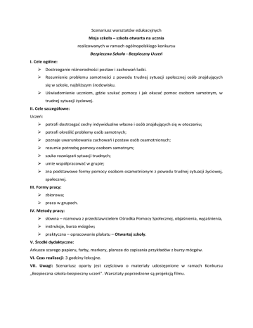 Scenariusz warsztatów edukacyjnych Moja szkoła – szkoła otwarta na ucznia realizowanych w ramach ogólnopolskiego konkursu Bezpieczna Szkoła - Bezpieczny Uczeń I. Cele ogólne: Dostrzeganie różnorodności postaw i zachowań ludzi. Rozumienie problemu samotności z powodu trudnej sytuacji społecznej osób znajdujących się w szkole, najbliższym środowisku. Uświadomienie uczniom, gdzie szukać pomocy i jak okazać pomoc osobom samotnym, w trudnej sytuacji życiowej. II. Cele szczegółowe: Uczeń: potrafi dostrzegać cechy indywidualne własne i osób znajdujących się w otoczeniu; potrafi określić problemy osób samotnych; poznaje uwarunkowania zachowań i postaw osób osamotnionych; rozumie potrzebę pomocy osobom samotnym; szuka rozwiązań sytuacji trudnych; umie współpracować w grupie; zna podstawowe formy pomocy osobom osamotnionym z powodu trudnej sytuacji życiowej, społecznej. III. Formy pracy: zbiorowa; praca w grupach. IV. Metody pracy: słowna – rozmowa z przedstawicielem Ośrodka Pomocy Społecznej, objaśnienia, wyjaśnienia, instrukcje, burza mózgów; praktyczna – opracowanie plakatu – Otwartej szkoły. V. Środki dydaktyczne: Arkusze szarego papieru, farby, markery, plansze do zapisania przykładów z burzy mózgów. VI. Czas realizacji: 3 godziny lekcyjne. VII. Uwagi: Scenariusz oparty jest częściowo o materiały udostępnione w ramach Konkursu „Bezpieczna szkoła-bezpieczny uczeń”. Warsztaty poprzedzone są projekcją filmu. VII. Przebieg zajęć: Ławki powinny być ustawione pod ścianą/pod oknem w kwadraty. Uczniowie siedzą w kółku na krzesłach. Takie ustawienie krzeseł i rezygnacja ze stolików pozwala na swobodniejszą wymianę myśli i pracę o charakterze warsztatowym. Nauczyciel w kilku słowach przedstawia temat zajęć. Mówi o znaczeniu szkoły otwartej na ucznia, rozwijającej jego zdolności, o poszanowaniu indywidualności i potrzeb każdego człowieka. 1. Swobodne wypowiedzi: Nauczyciel nawiązuje do obejrzanego filmu i prosi o swobodne wypowiedzi na temat bohatera. Czas: 10 min. 2. Co jest ważne w relacjach międzyludzkich, żeby szkoła była szkołą otwartą? Nauczyciel dzieli uczniów na grupy o podobnej liczebności. Grupy dostają po jednej tabelce do wypełnienia. Uczniowie są poproszeni przez nauczyciela o wypełnienie tabelek. Otrzymują też informacje, że po skończonym zadaniu będą się dzielić swoimi pracami/spostrzeżeniami z pozostałymi kolegami ze szkoły. Krótkie omówienie na forum informacji zebranych przez uczniów w tabelkach. Załącznik nr 1 Czas: 25 min. (15 min. – praca, 10 min. – prezentacje i omówienie) 3. Burza mózgów – Co chcielibyśmy zmienić w naszej szkole? Uczniowie na arkuszach szarego papieru zapisują, co chcieliby zmienić w szkole. Podsumowanie: Prezentacja na forum poszczególnych pomysłów. Nauczyciel przekazuje młodzieży cel wykonanego zadania – poznanie ich zdania, co im przeszkadza i co według nich powinno się zmienić. Cel: Dyskusja o tym, co powinno się zmienić z punktu widzenia młodych ludzi. Poznanie przez nauczyciela, co doskwiera jego uczniom i o czym można rozmawiać m.in.: na godzinach wychowawczych/spotkaniach itp. Czas: 30 min. (20 min. – praca, 10 min. – prezentacje i omówienie) 4. Opracowanie plakatu - Otwartej szkoły. Uczniowie otrzymują brystole i materiały do wykonania plakatu. Opracowują założenia Otwartej szkoły i przedstawiają je w formie plakatu. Czas: 60 min. (40 min. – praca, 20 min. – prezentacje i omówienie) 5. Ćwiczenie - rundka na zakończenie „Z czym wychodzę?” Czas: 10 min. Załącznik nr 1 sytuacja Dziecko Rodzina dziecko – rodzina np.: więcej czasu spędzanego np.: mniej czasu spędzanego np.: mniej czasu spędzanego w wspólnie (czas spędzony na przed komputerem (więcej pracy (więcej uwagi poświęconej rozmowie, wspólnym posiłku czasu z rodzicem, kolegą czy dziecku, miło spędzone chwile) itp.) książką) sytuacja Nauczyciel Uczeń np.: lepsze zrozumienie (tak np.: chęć poznania tego co np.: chęć poznania co myśli aby obie strony chciały się uczeń ma do powiedzenia nauczyciel, wysłuchać i porozmawiać) (słuchanie ze zrozumieniem doświadczenia (słuchanie i z chęcią poznania opinii ze zrozumieniem i z chęcią młodego człowieka) skorzystania nauczyciel – uczeń jakie z rad ma bądź doświadczenia kogoś starszego) sytuacja Uczeń uczeń – uczeń np.: ograniczenie głośnego słuchania muzyki np.: bardziej tolerancyjne podejście do (nie każdy lubi „hałas”, poza tym każdy ma inny innego punktu widzenia, do ulubionej gust) muzyki czy drużyny piłkarskiej (każdy ma prawo do własnego zdania i preferencji)